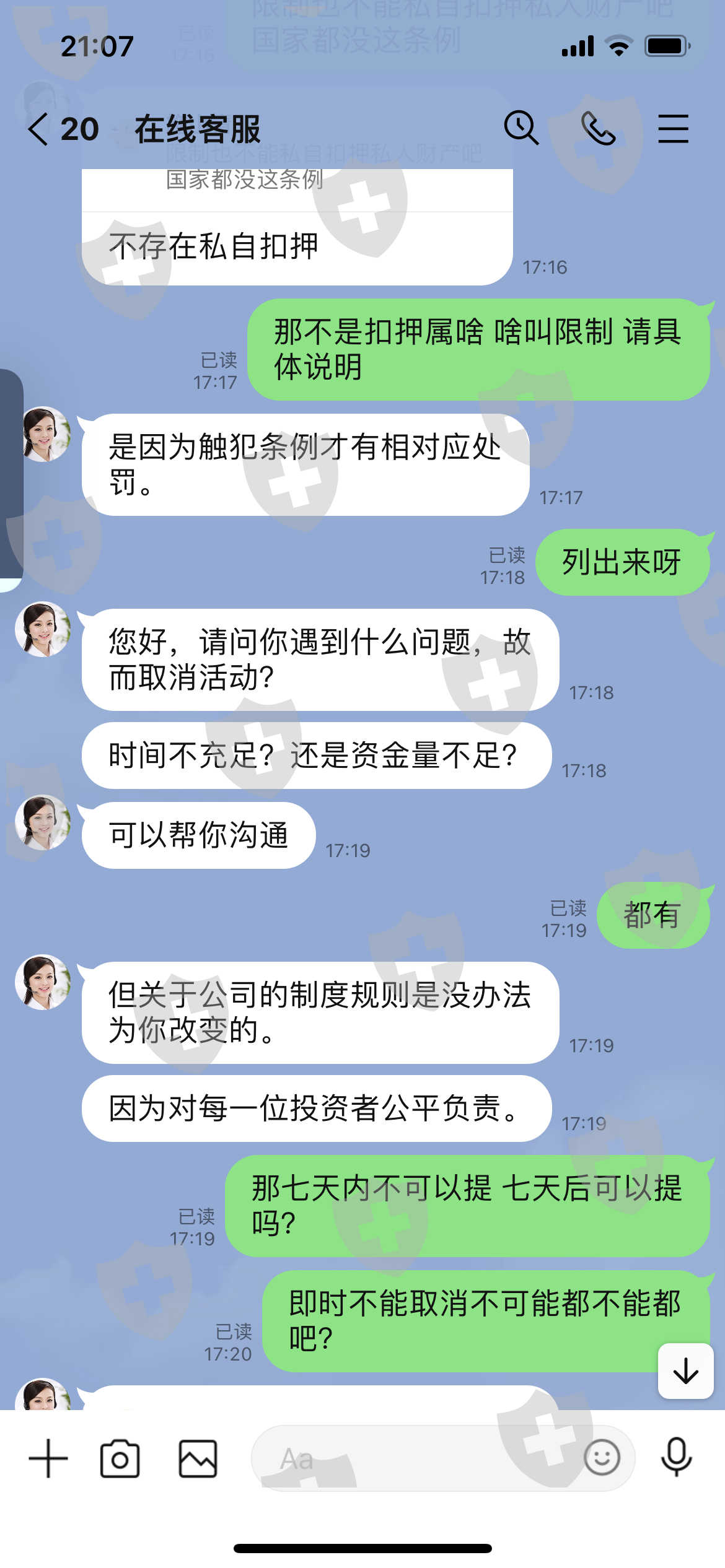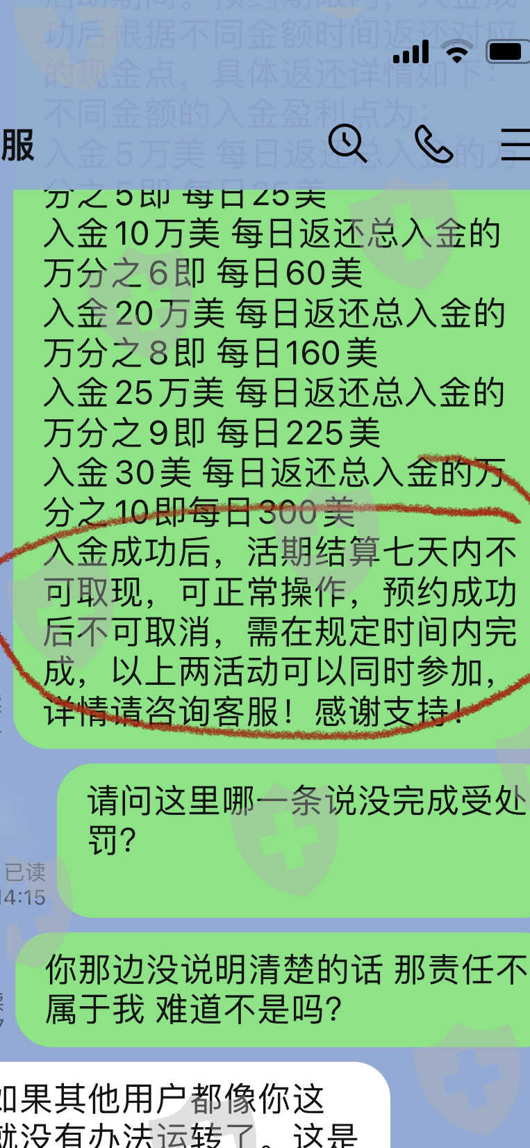 尊敬的会员684601用户,您好,已将你预约的10万美金活动更改为5万美金活动,请在更改成功后,七个工作日完成相对应入金量。活动时间未完成,限制提现,交易量处罚十倍,毁约处罚金:本金的30%等措施不是扣30%,是需要缴纳本金30%罚金。同时交易量十倍。
