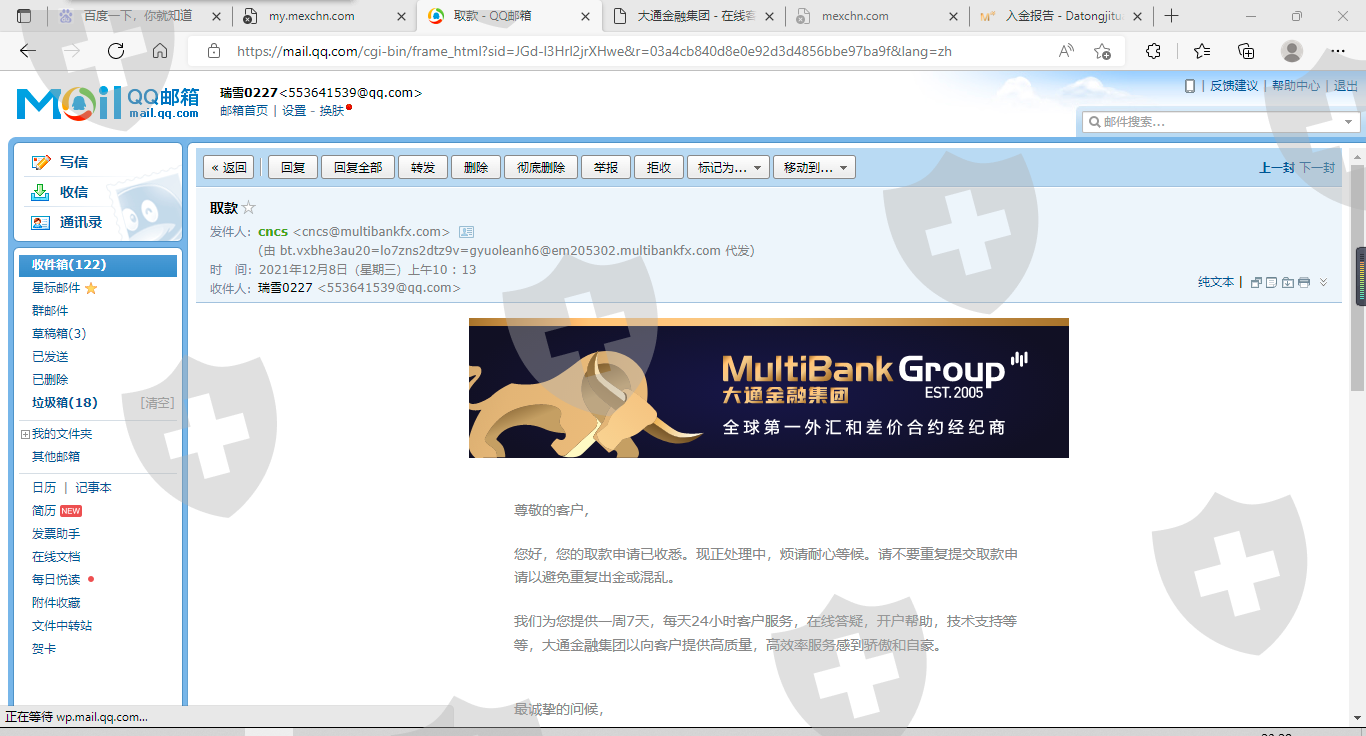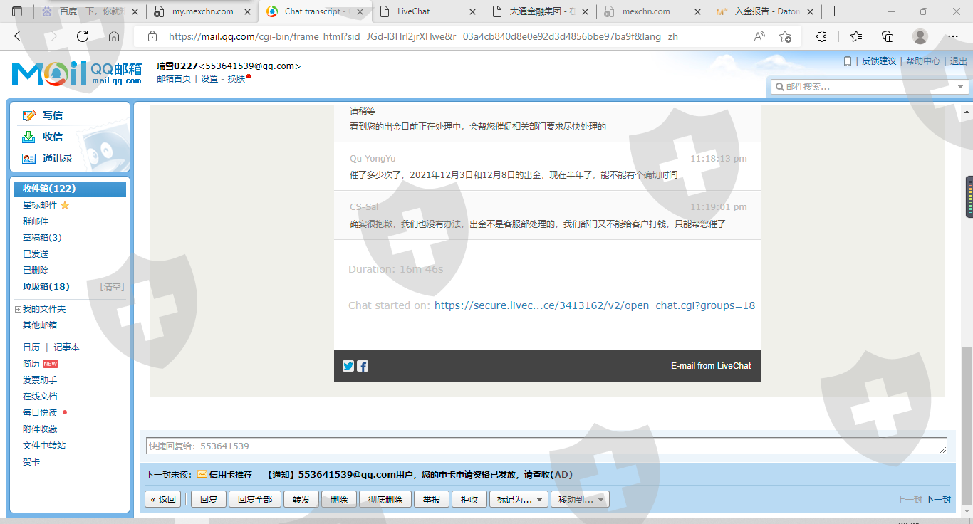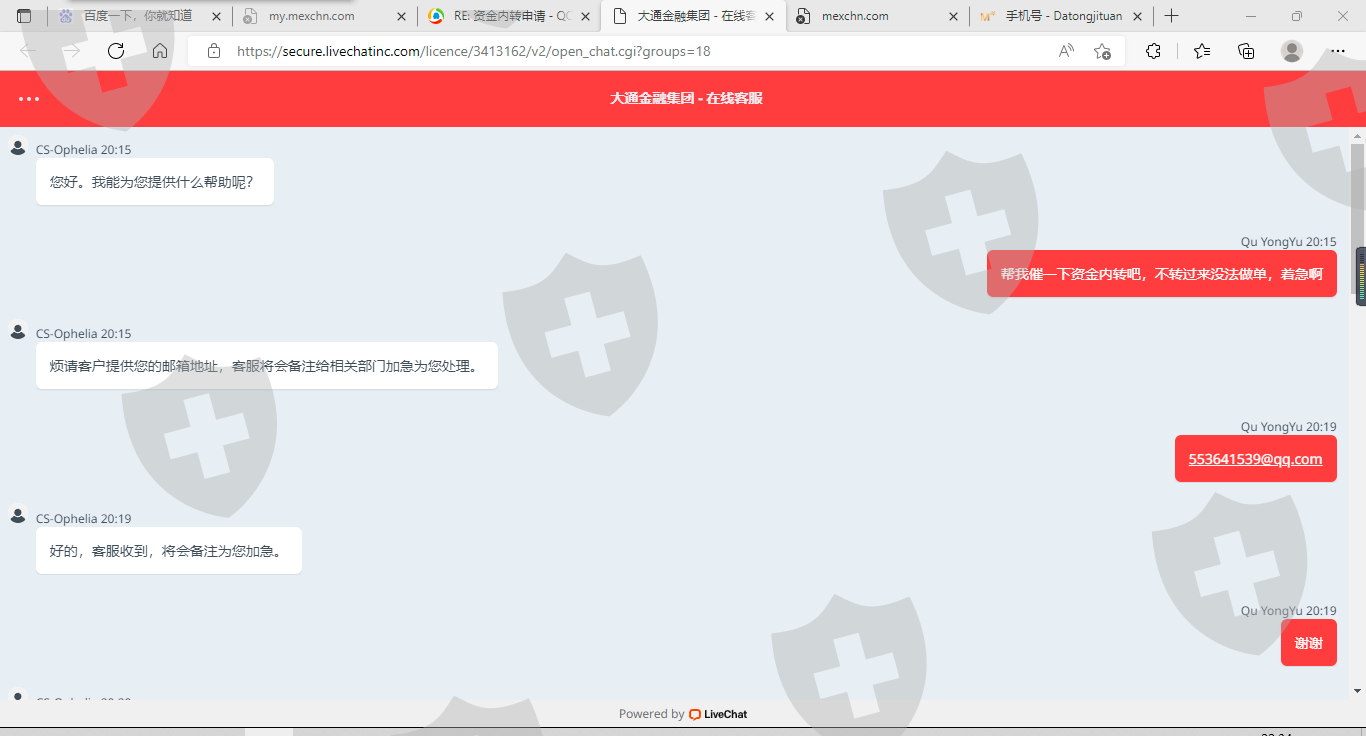 我在大通金融MT4系统(交易账号:33513862)2021年12月3日和2021年12月8日两笔共计申请出金1117.92美金,到现在已经半年多了,期间多次联系客服催促,开始还说会给加急处理,后来就是说帮催促相关部门,最近的一次竟然说他们客服又不能给客户打款,我实在是没法忍受了,请相关部门给予尽快解决。