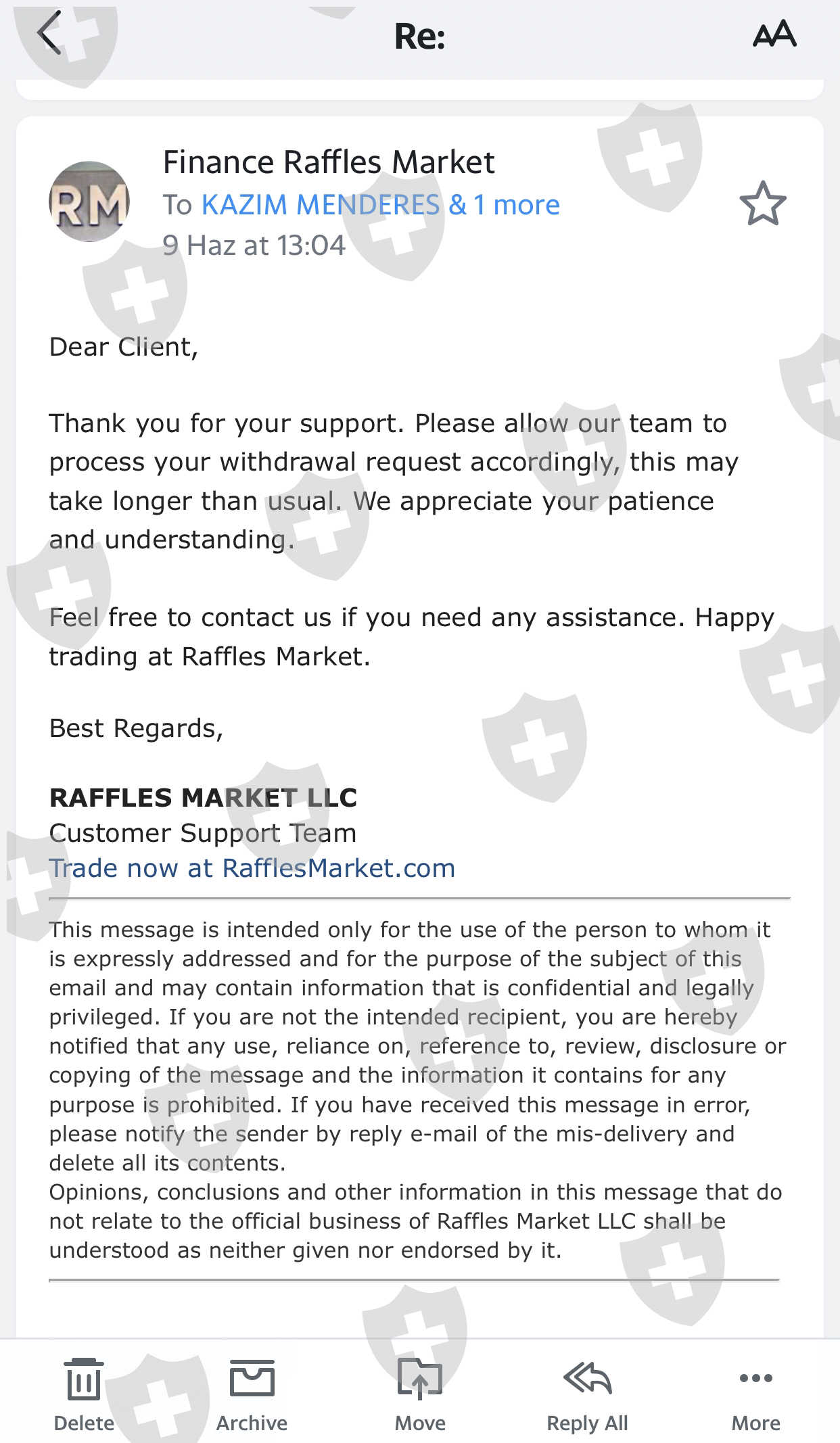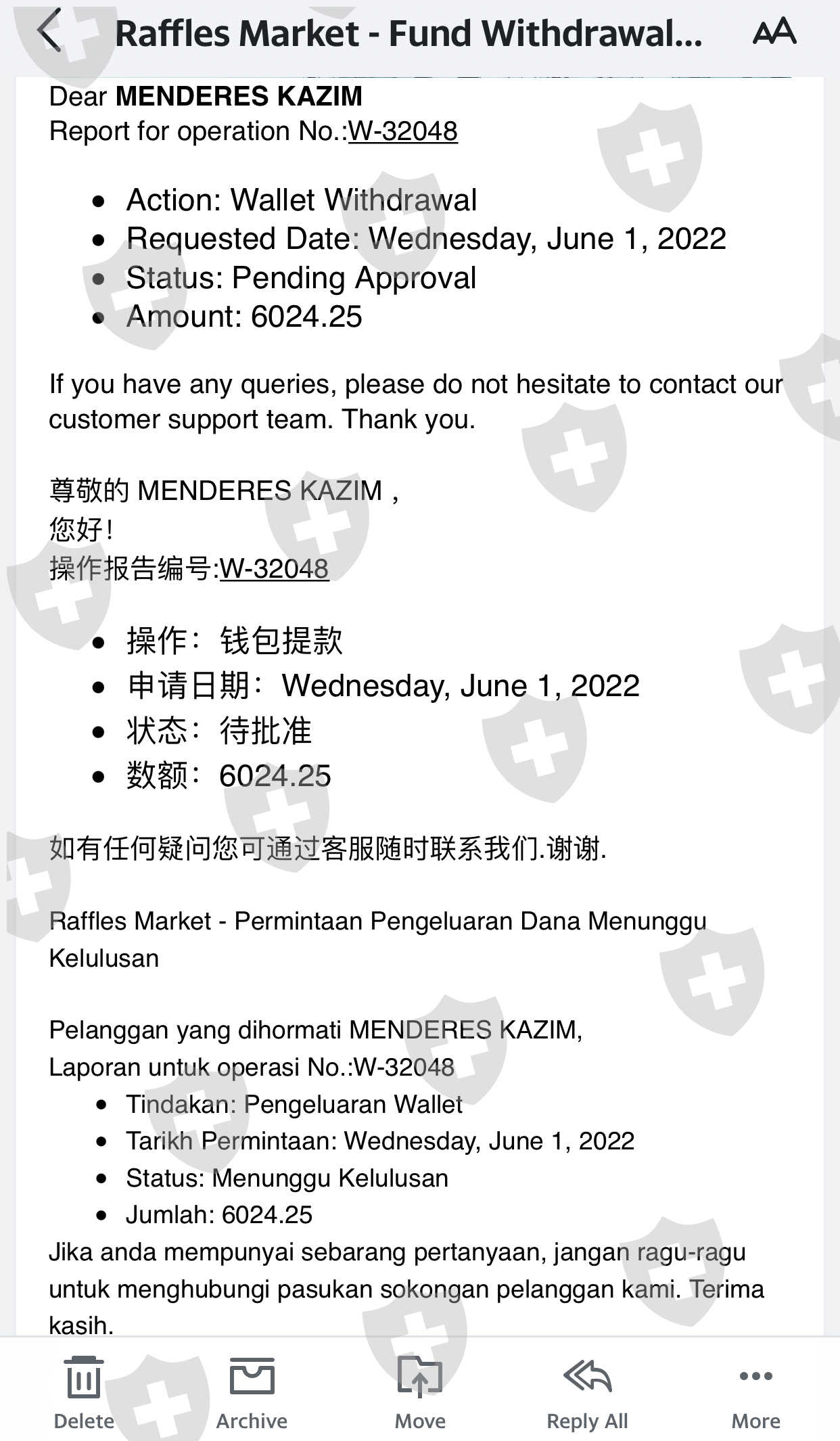 I traded on Raffles Market for several weeks. I shot a few times and the payments were made. However, the profit I made from my last transactions is 6024,25 usd and I wanted to withdraw this money on June 1, 2022. But after 10 days I still can't get paid. When I contact via e-mail, it says keep waiting for the money, payment will be made. I never trust a company that I can't get my money from. For me it is the same as fraud. If this company does not pay me, you can be sure that I will make the necessary complaints through all channels and to all regulated license authorities through social media. I expect your help.