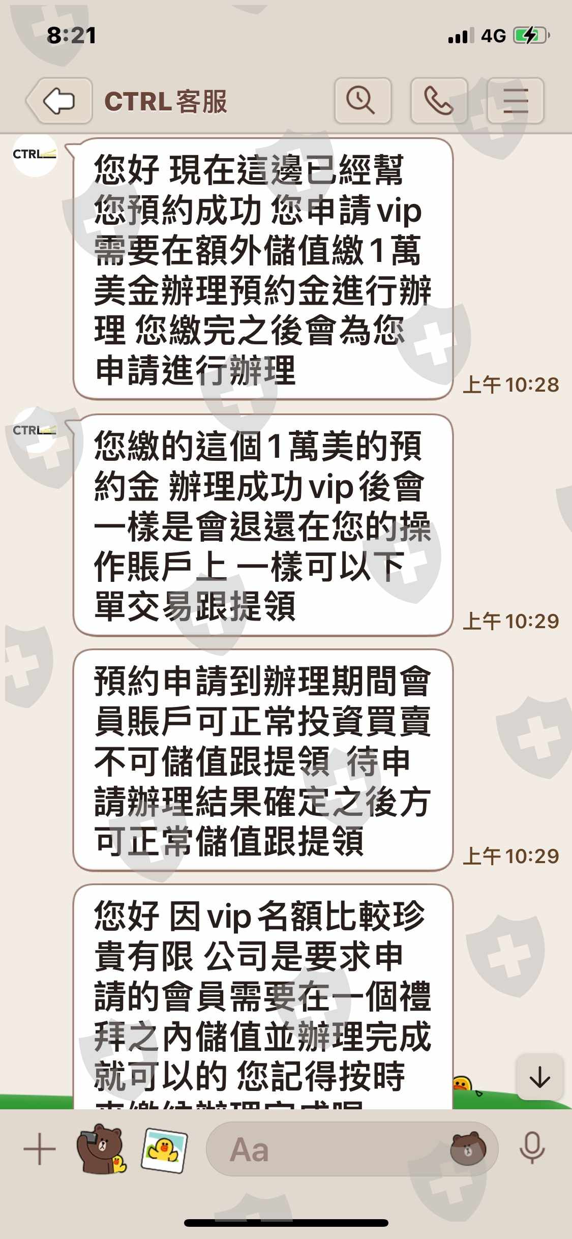 客服申請時會要求一週內繳預約金10000 USD,期間不能出金。這時就察覺有異了,期間有試著提領,不過被拒絕,就想等一週後自動取消預約,然後給它扣10%後提領,然後客服會一直要你入金10000 USD才能正常提領。誰還想被扒第二次。總共損失8333 USD。