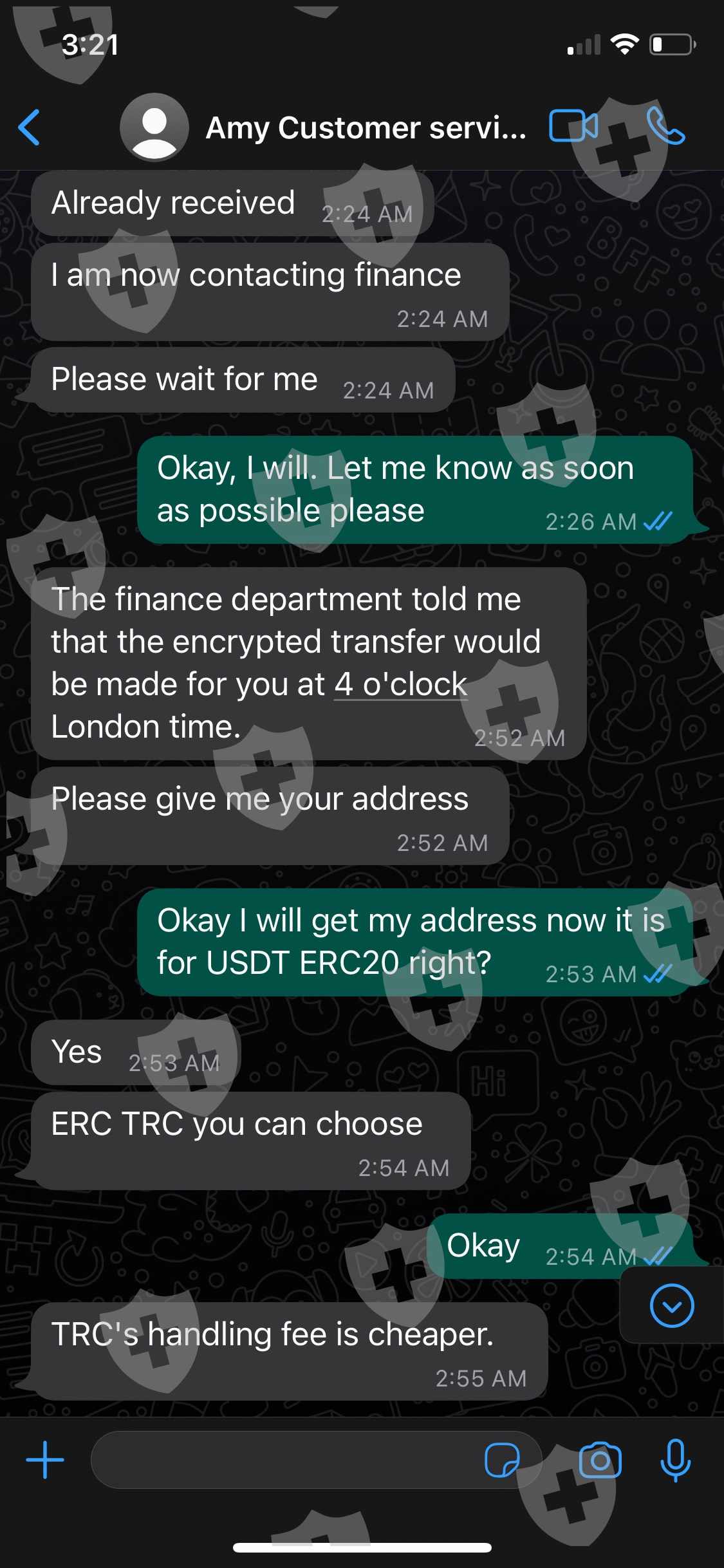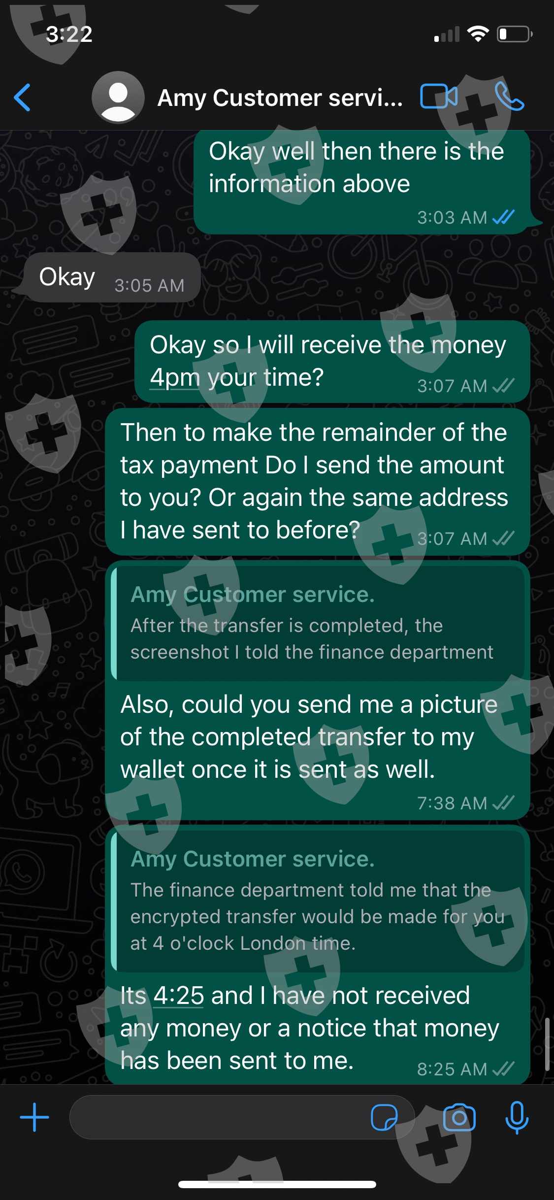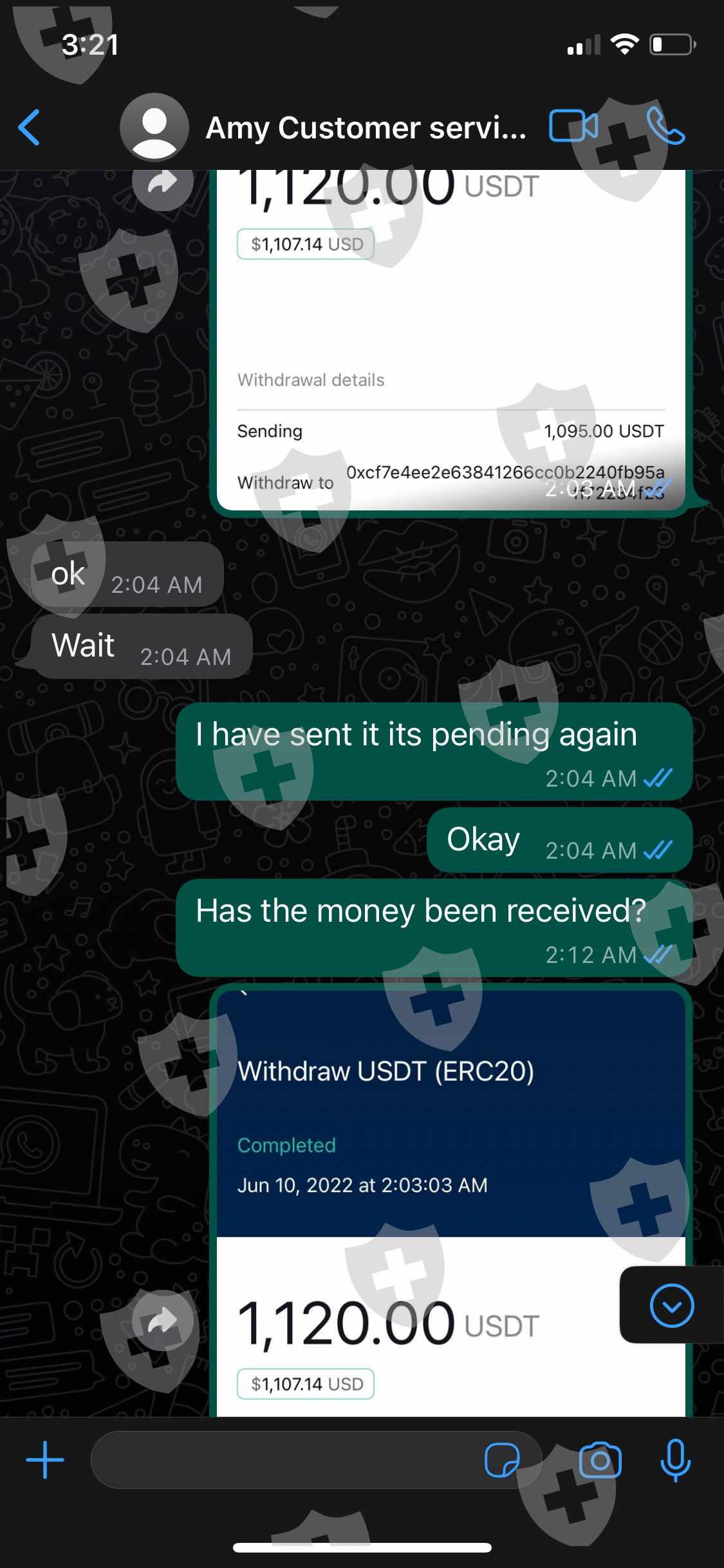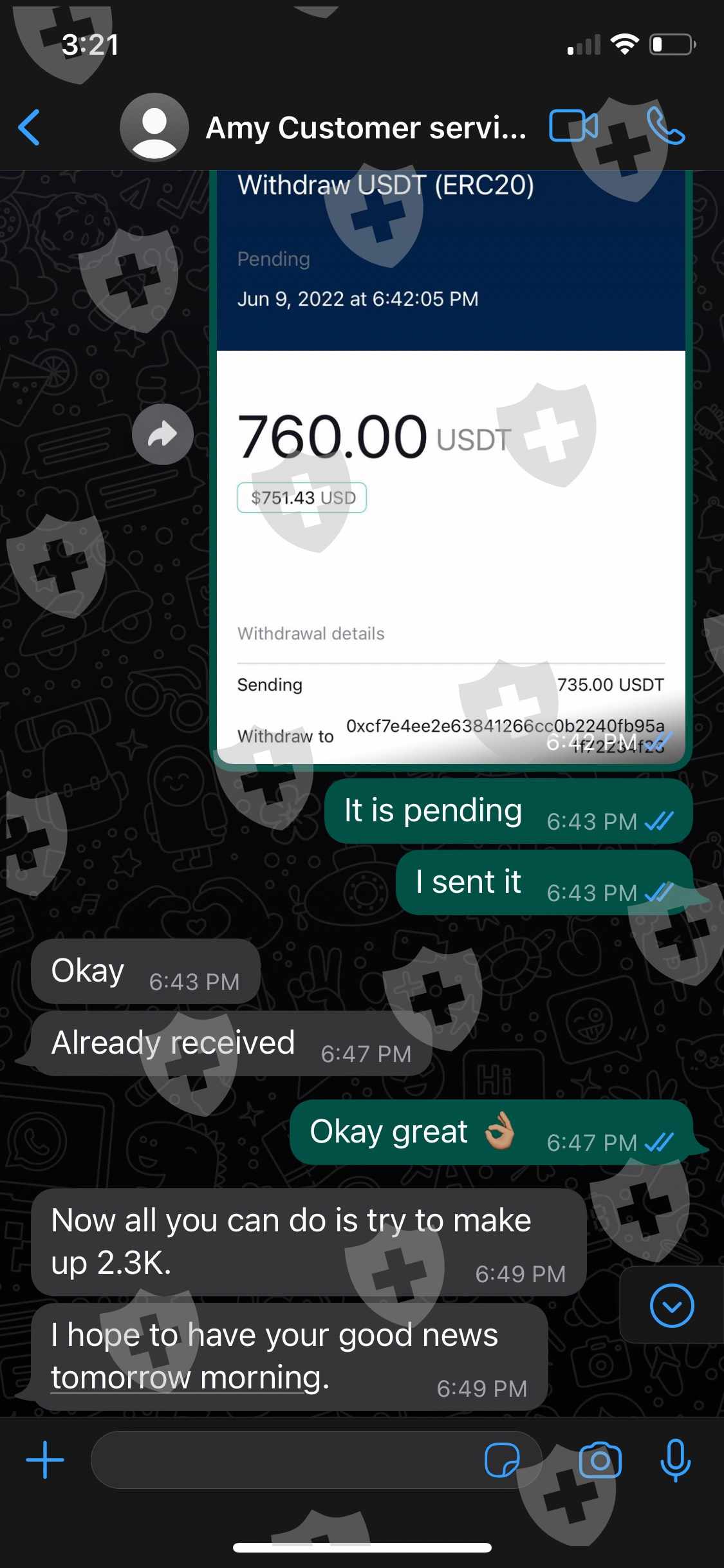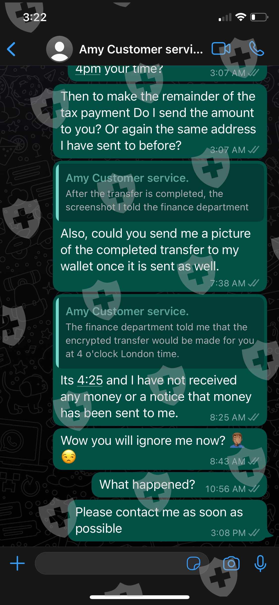 客户服务代理“Amy”要求在发送资金之前支付分析师 Ryoko Mizutani aka Michael Bode 的分析师费用。支付这些费用后,客户服务代理会要求支付账户中资金的税款,作为释放资金的要求。在与客户服务代理协商价格后,我将钱汇去缴税,以便在我的交易账户中收到资金。客服人员确认了我的交易,并表示账户中的总资金将在英国时间 6 月 10 日星期五下午 4 点之前发送到我提供的加密钱包地址。说了这句话之后,资金从未发送过,并且由于她从进行通信的whatsapp中删除了她的号码,因此与客户服务代理的通信被阻止。