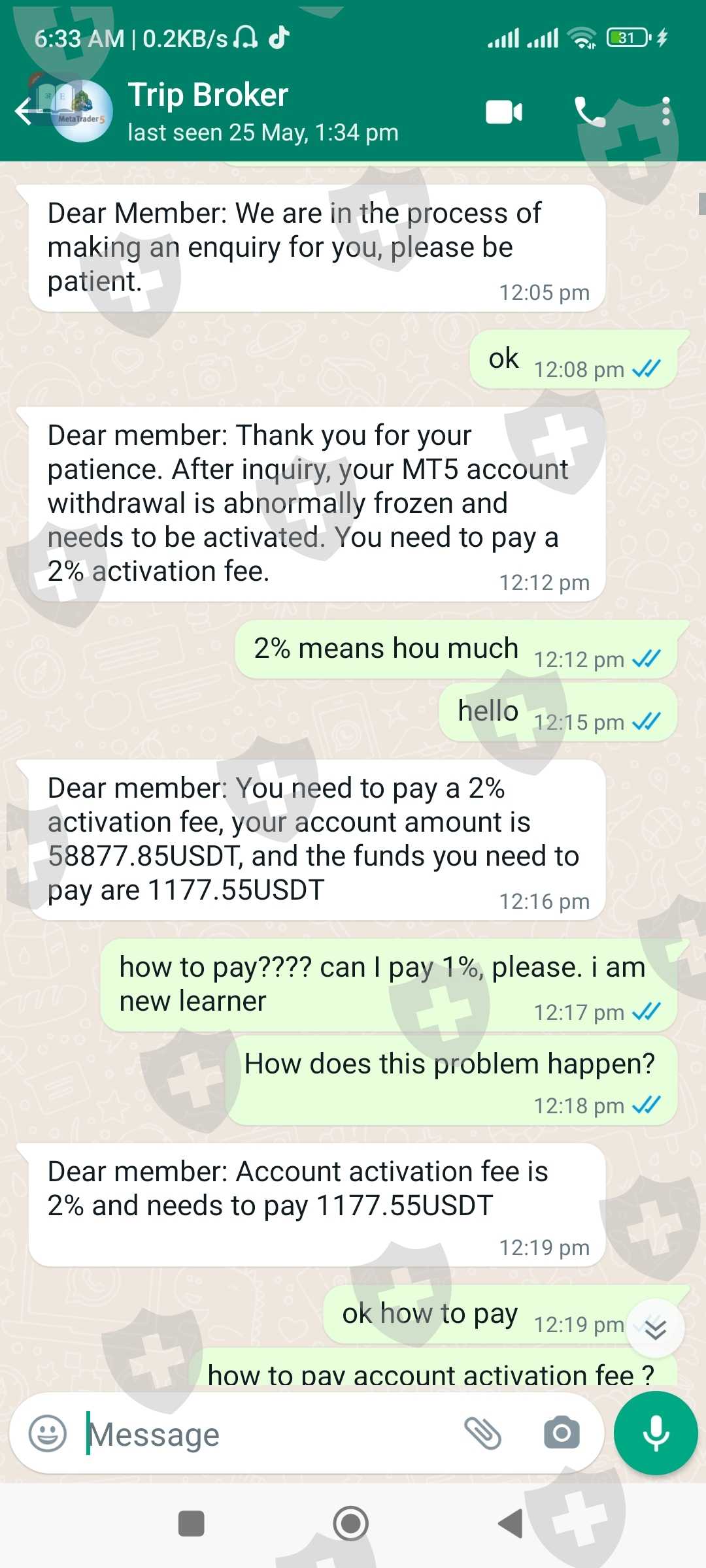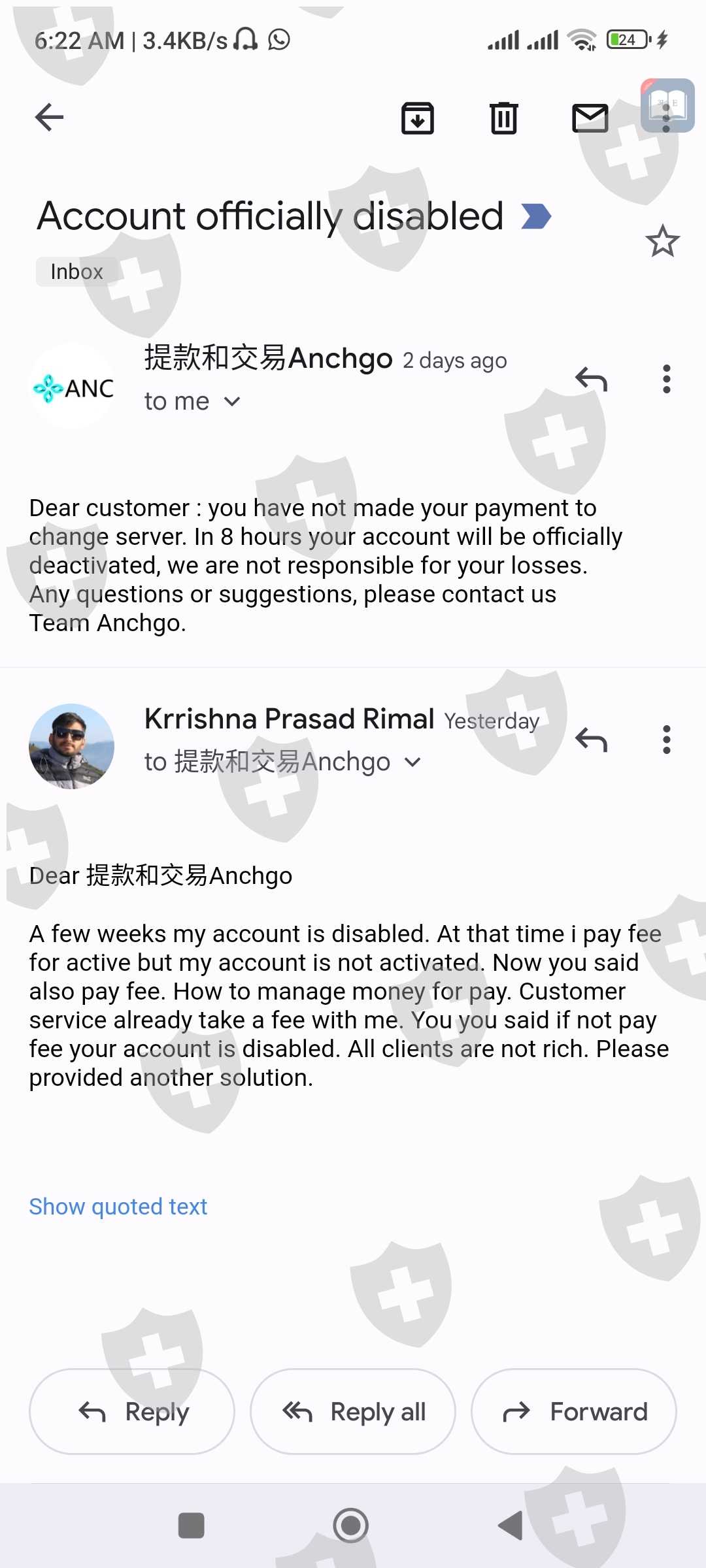 几周前我的帐户被禁用了,我联系了客服。客服说需要支付了2%的费用来激活账户,我支付2%的费用。之后再次说支付6%来激活您的帐户。但我不支付6%。现在 ANCHGO发送邮件请支付 8733 美元,如果您不支付这笔钱,您的帐户将被正式停用。