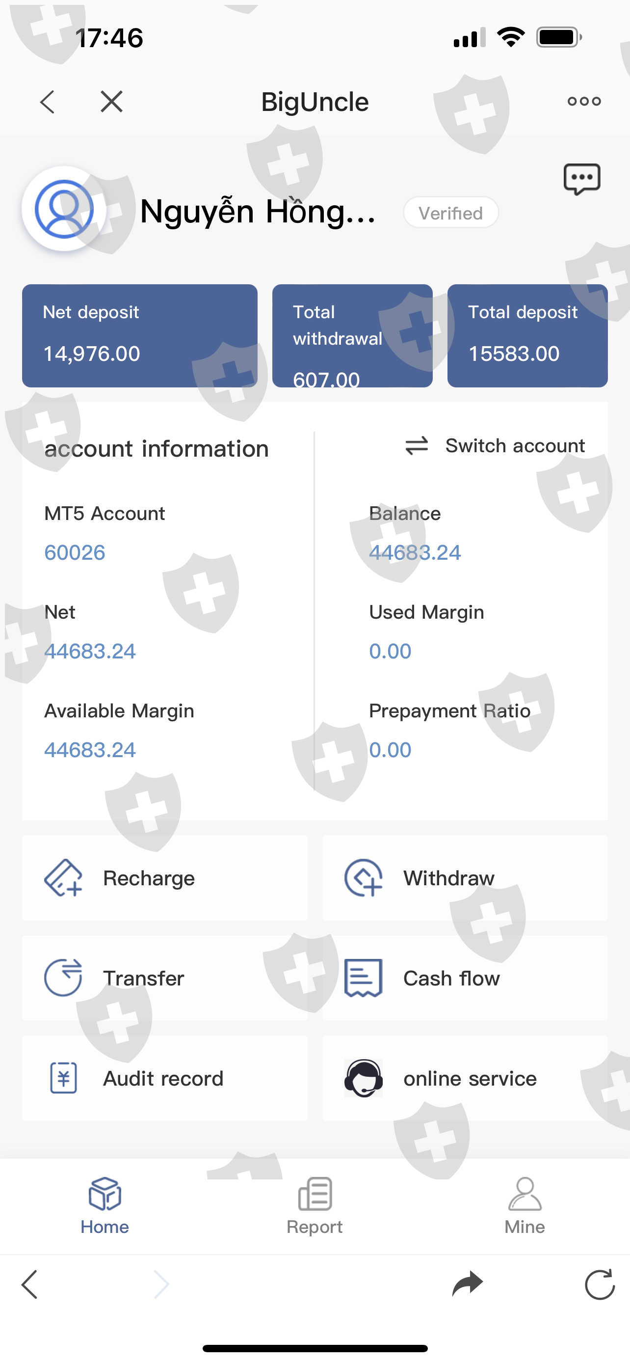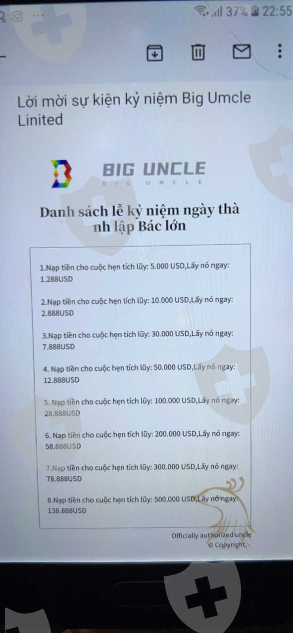 Tôi được một người bạn Trung Quốc giới thiệu MT5 và đăng ký tài khoản với sàn Big uncle, tôi nạp tiền lần đầu tiên vào ngày 28/02/2022 với $485, sau khi lời tôi rút được $607, sau đó tôi tiếp tục nạp $1,036 vào ngày 02/03/2022, đến ngày 05/03/2022 tôi rút thêm $600, sau đó Big uncle gửi mail mời tôi tham gia sự kiện nạp tiền được bonus thêm, do bạn tôi cũng tham gia nên anh ta bảo tôi tham gia nạp $5000, tôi đã nạp $2002 vào ngày 01/04/2022, $1000 vào ngày 05/04/2022, $1000 vào ngày 09/04/2022 và nạp $998 vào ngày 11/04/2022, sau khi tôi nạp đủ số tiền đã đăng kí họ vẫn không cho tôi rút tiền với lí do phải đóng thuế theo luật của Vương quốc Anh với số tiền $5000, tôi đã nạp tiền để đóng thuế là $4024 và $1042 vào ngày 15/04/2022, sau khi tôi đóng thuế họ lại tiếp tục đưa ra lí do rằng tài khoản của tôi đã đạt $30,000, tôi phải đóng phí xác thực tài khoản trung cấp là $10,000 thì mới được rút tiền, tôi lại tiếp tục nạp $4000 vào ngày 30/04/2022, nạp $1031 vào ngày 02/05/2022 và $1700 vào ngày 03/06/2022, tôi chỉ còn thiếu $3300 nữa, nhưng người bạn giới thiệu tôi tham gia đã đột ngột biến mất, tôi mới tìm hiểu về sàn Big uncle mới biết rằng họ có rất nhiều dấu hiệu là sàn lừa đào và có nhiều nhà đầu tư đánh giá không tốt và gặp trường hợp không được rút tiền như tôi.