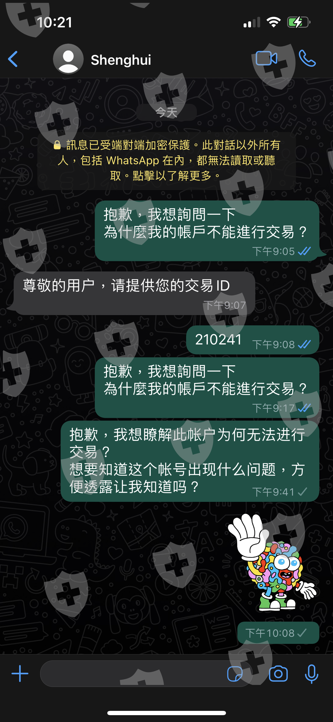 第三次詢問審查結果時,客服人員就都不讀不回。→我透過軟體發現我被客服封鎖?!同時我也發現我無法進行交易,現在這個狀況等於無解了。不知道我這個帳戶出了什麼問題?