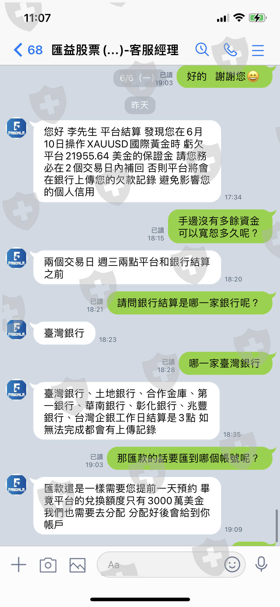 號稱偽裝某投顧公司投顧老師與助理+fasonla客服經理,詐騙平民百姓可以賺取高利潤,引誘匯款自人頭帳戶,可出金少量金額,卻無法將本金取出,誘導賺利潤後爆倉,藉機要求將負值款項補齊,否則差評上傳台灣銀行個人信用。