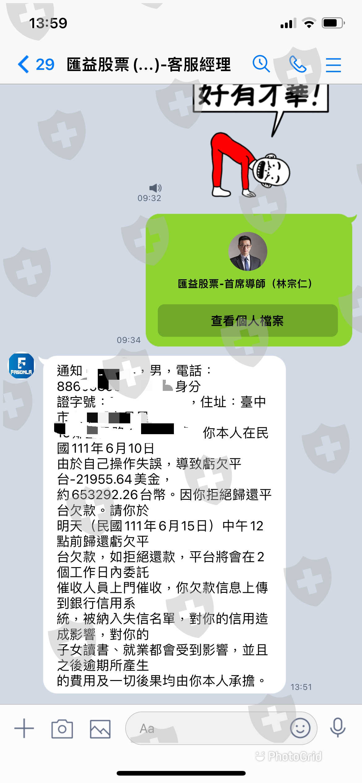 如下圖所示投顧老師帶頭操作前面賺取利潤後面讓你爆倉fasonla詐騙欠款恐嚇請大家留意