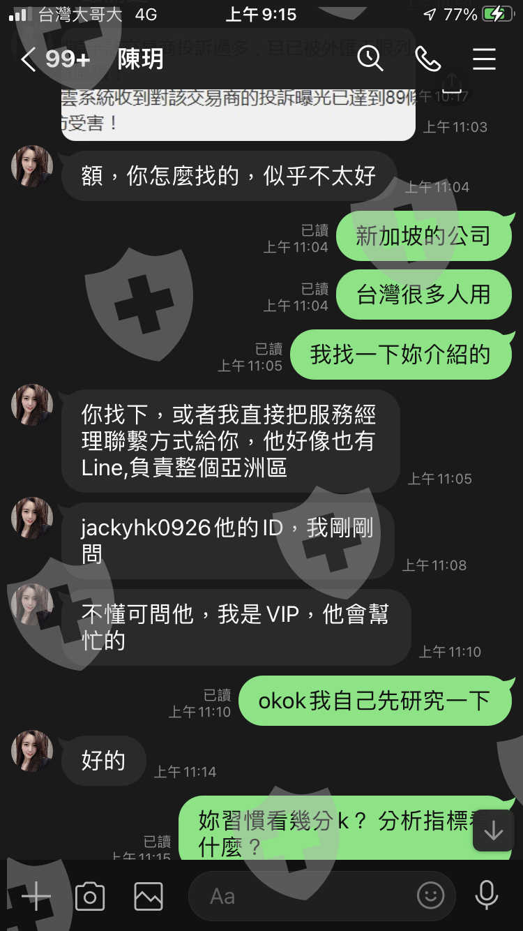 我在社群網站認識一位自稱公司財務長,她介紹一個服務經理給我並帶我操作外匯,當我要出金的時候,服務經理告訴我的帳戶為風險帳戶出不了金要先付保證金,故我支付了5730。之後財務長告訴我可以預存3000插隊出金,我也付錢。從這之後服務經理和財務長再也沒有回應。我陸續入金約26000+5730+3000,總共損失34730。請大家務必留意。
