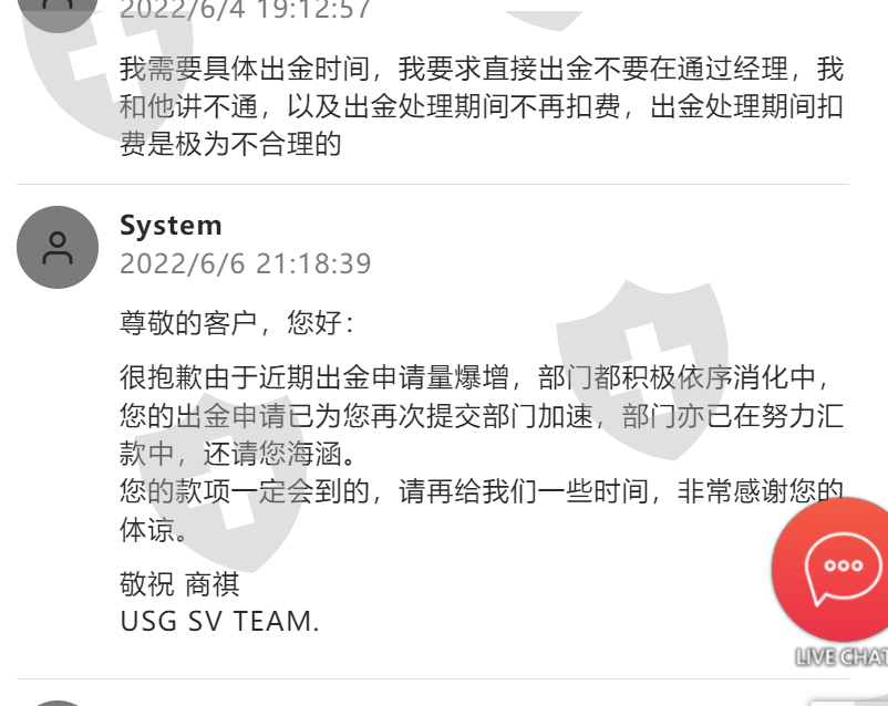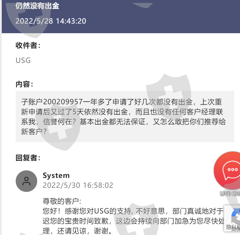 子账户200209957一年多了申请了好几次都没有出金,上次重新申请后又过了15天依然没有出金,照会发了好几封,一直打官腔,客户经理要求必须交易再100手才给出金,我不同意,都赔了,剩个底子,再也不会交易了!不但不出金反而以不交易收取滞纳金为由扣了5美金,这还有天理吗?