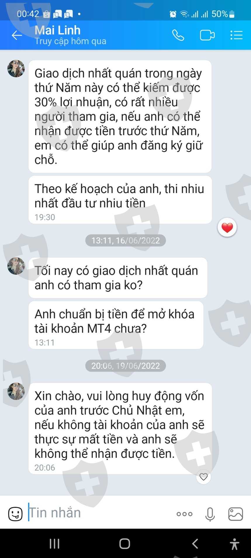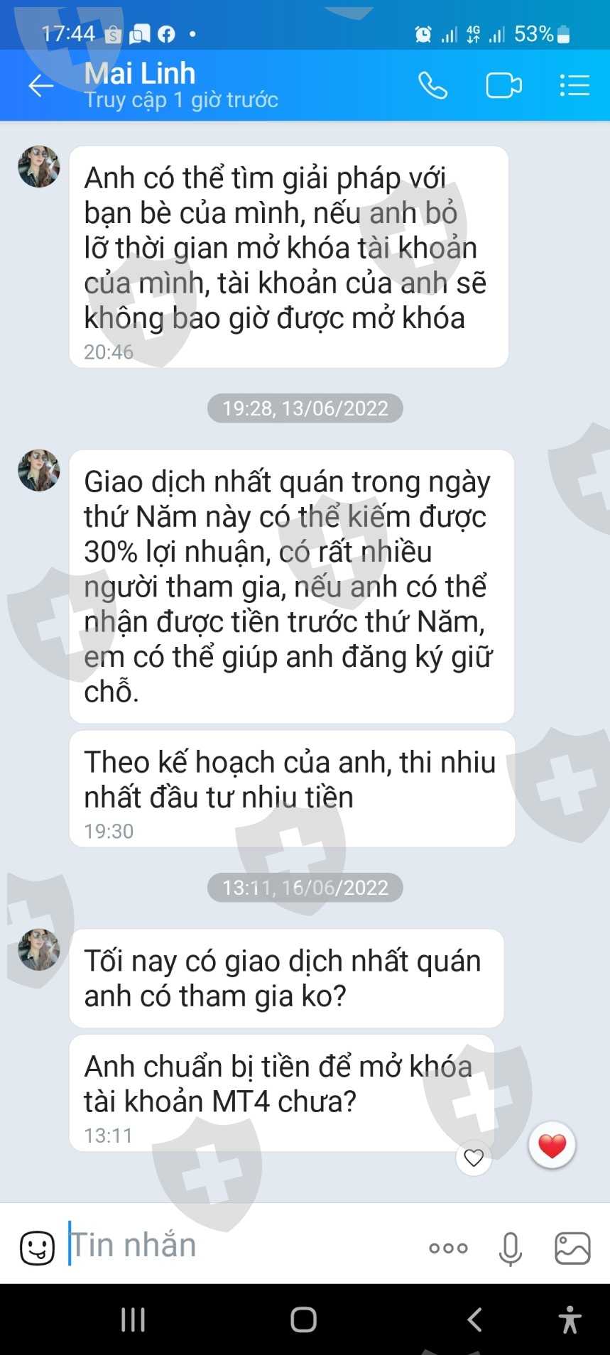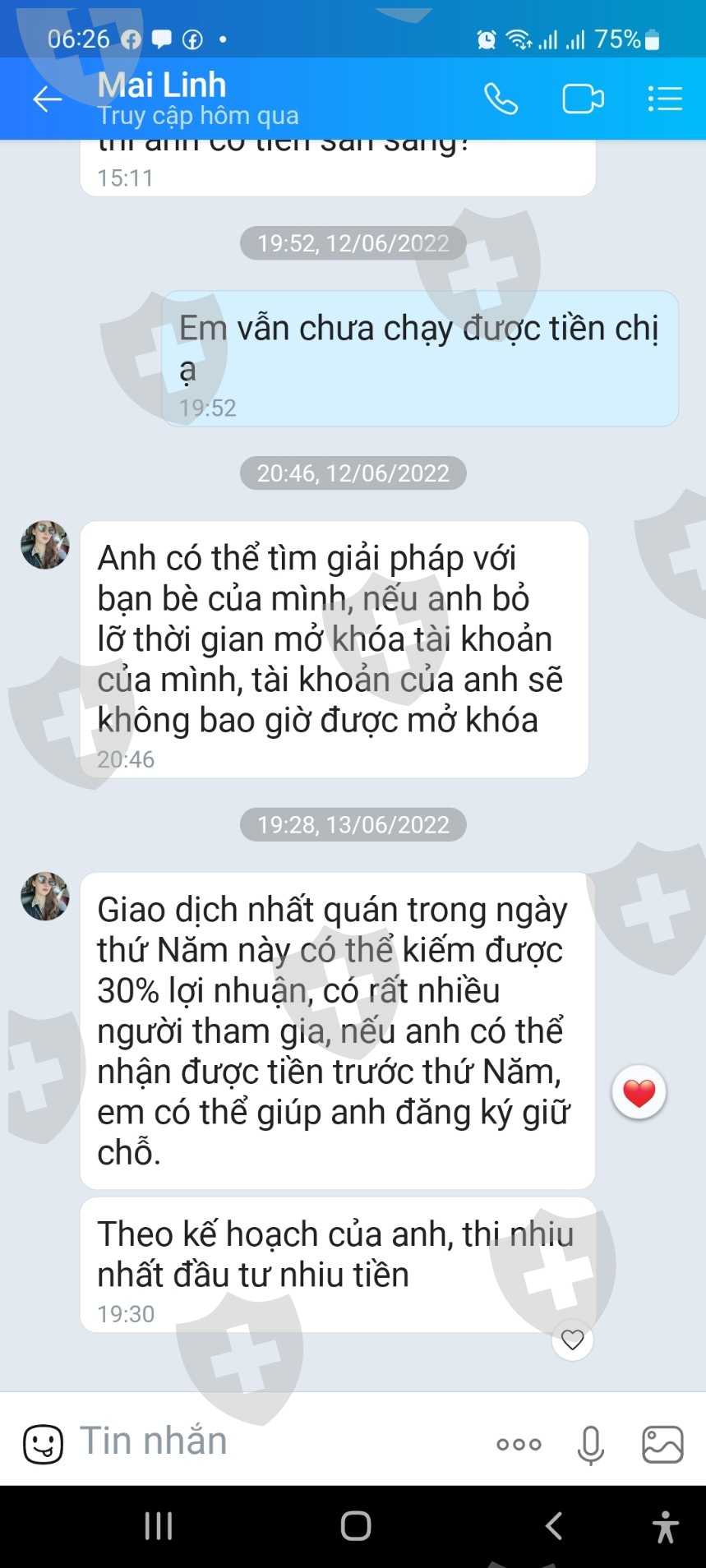 vào tháng 3/2022 tôi có đầu tư vào sàn rosystyle wealth đến 27/4 thì tôi nghi ngờ có dấu hiệu lừa đảo nên tôi muốn rút tiền nhưng chăm sóc khách hàng mai linh (zalo mai linh) nói đã đăng ký cho tôi gói một tháng không chia sẻ lời nhuận, đến đâu tháng 6/2022 tài khoản của tôi đã bị khóa và không thể rút được tiền , mai linh lại nói do biết động thị trường nên bắt tôi nạp thêm tiền nếu không tài khoản của tôi sẽ có nguy cơ bị khóa vĩnh viễn tài khoản đến ngày 19/6/2022 thì mai linh thông báo hết tuần này nên không tôi không nạp thêm tiền thì tài khoản sẽ bị khóa và tôi cũng bị mất hết tiền