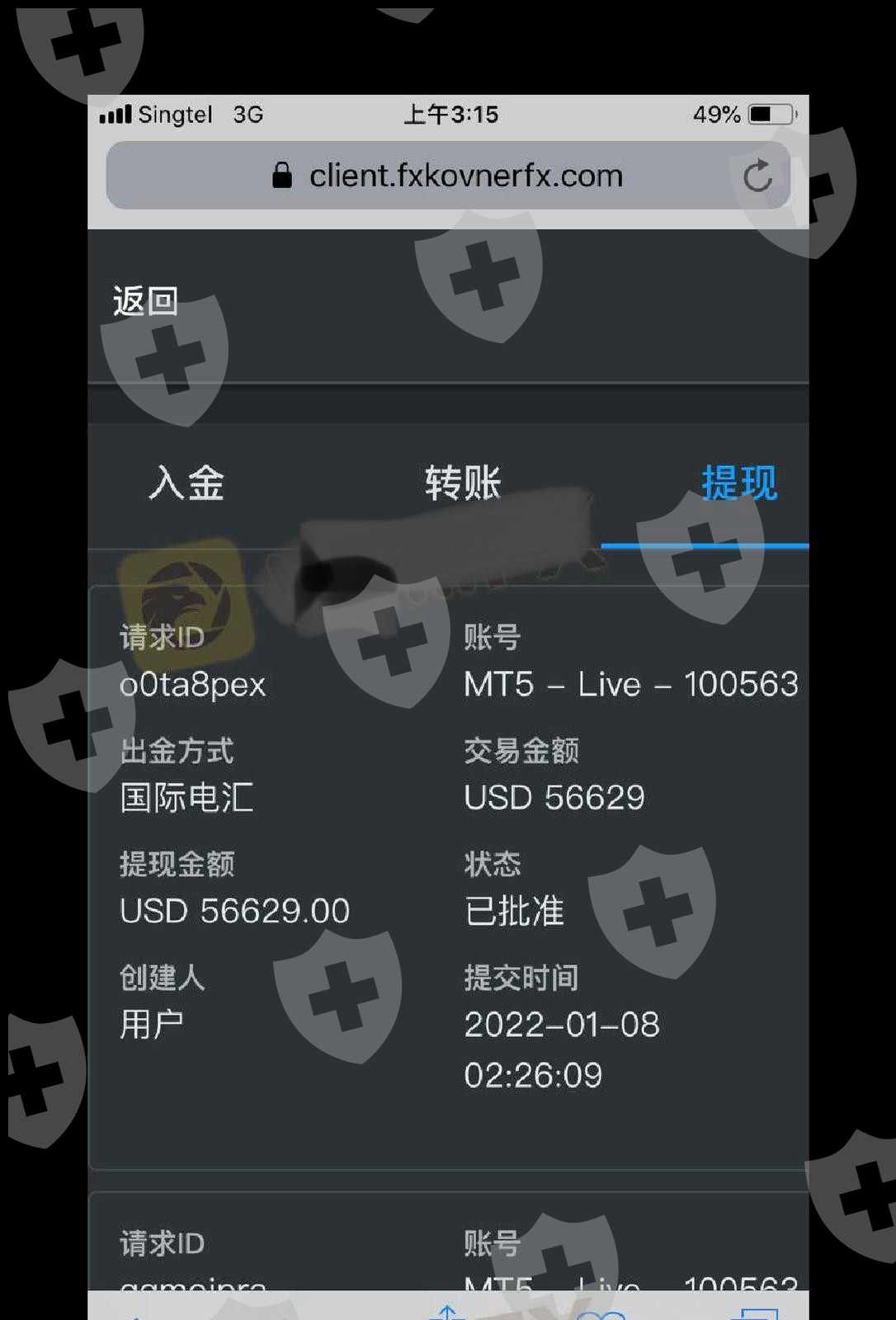 5月3日,我申请提现,但我账户里的95,000美元直到现在都无法提现。 FXKOVNER资本先告诉我“消费没有达到提现标准”,然后说充值涉嫌洗钱,所以我的账户被部分限制,需要支付账户余额的30%作为押金才可以申请解除限制。在我想AssetClaimBack投诉后,资金被直接存入我的钱包。 FXKOVNER骗不了我两次,从那以后我就停止了投资和交易