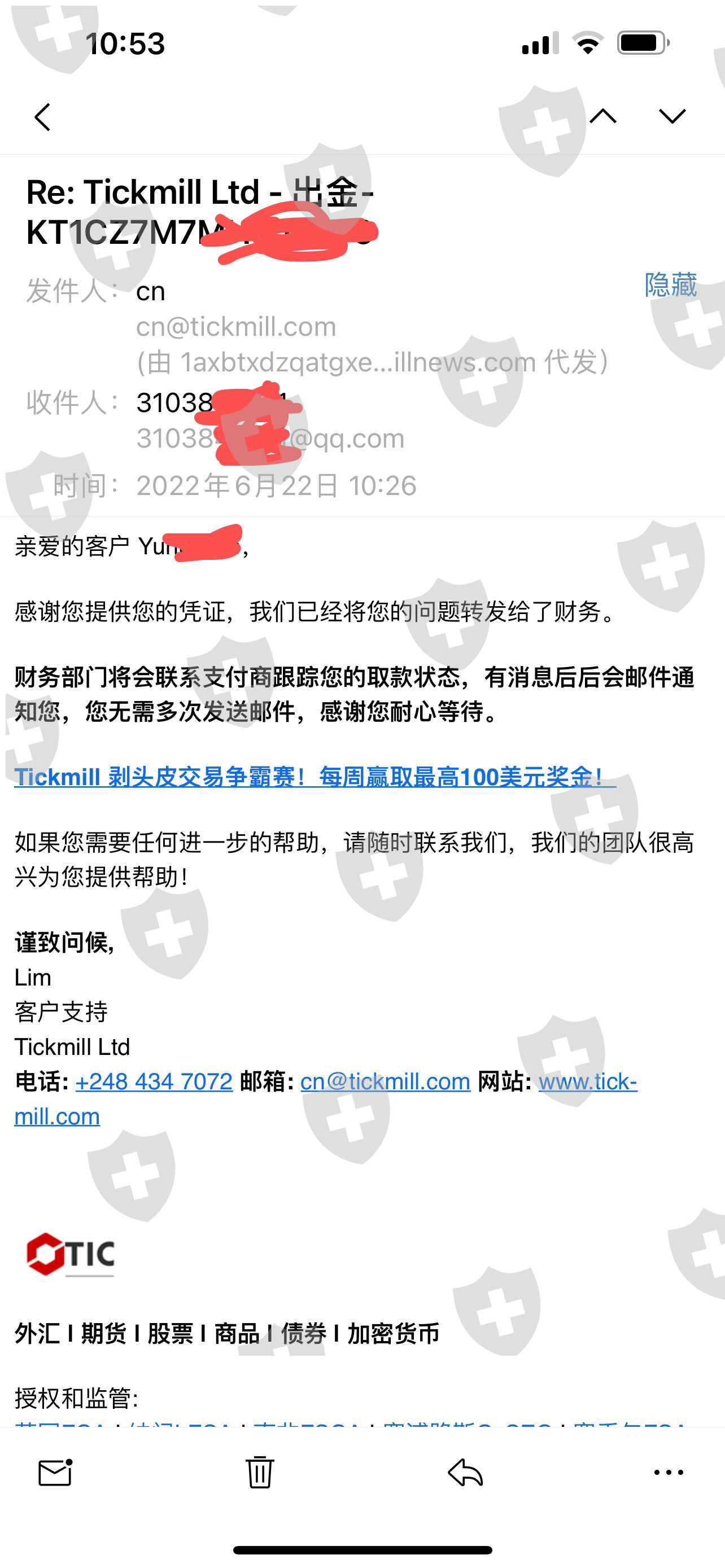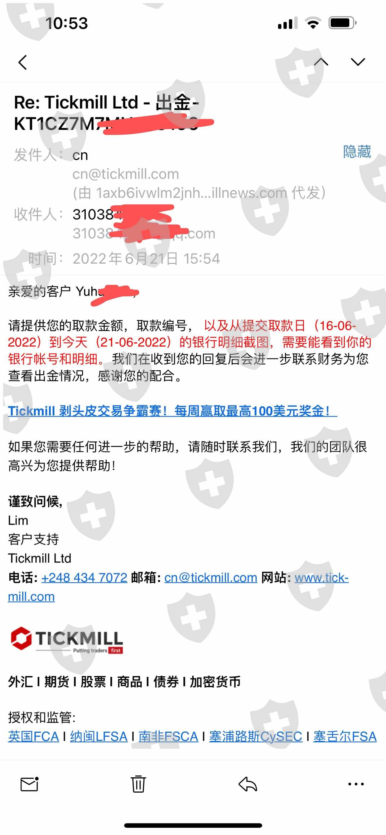6月16日提交的出款,一万多元,到发稿今日还未到帐,己按照tickmill客服要求提供银行卡交易明细,本人己提供。得到的回复是等待财务部门核实,过去了3个工作日还是没有回复,开户5年多,之前一直比较正常,继续每天发邮件到官网客服,没回复。