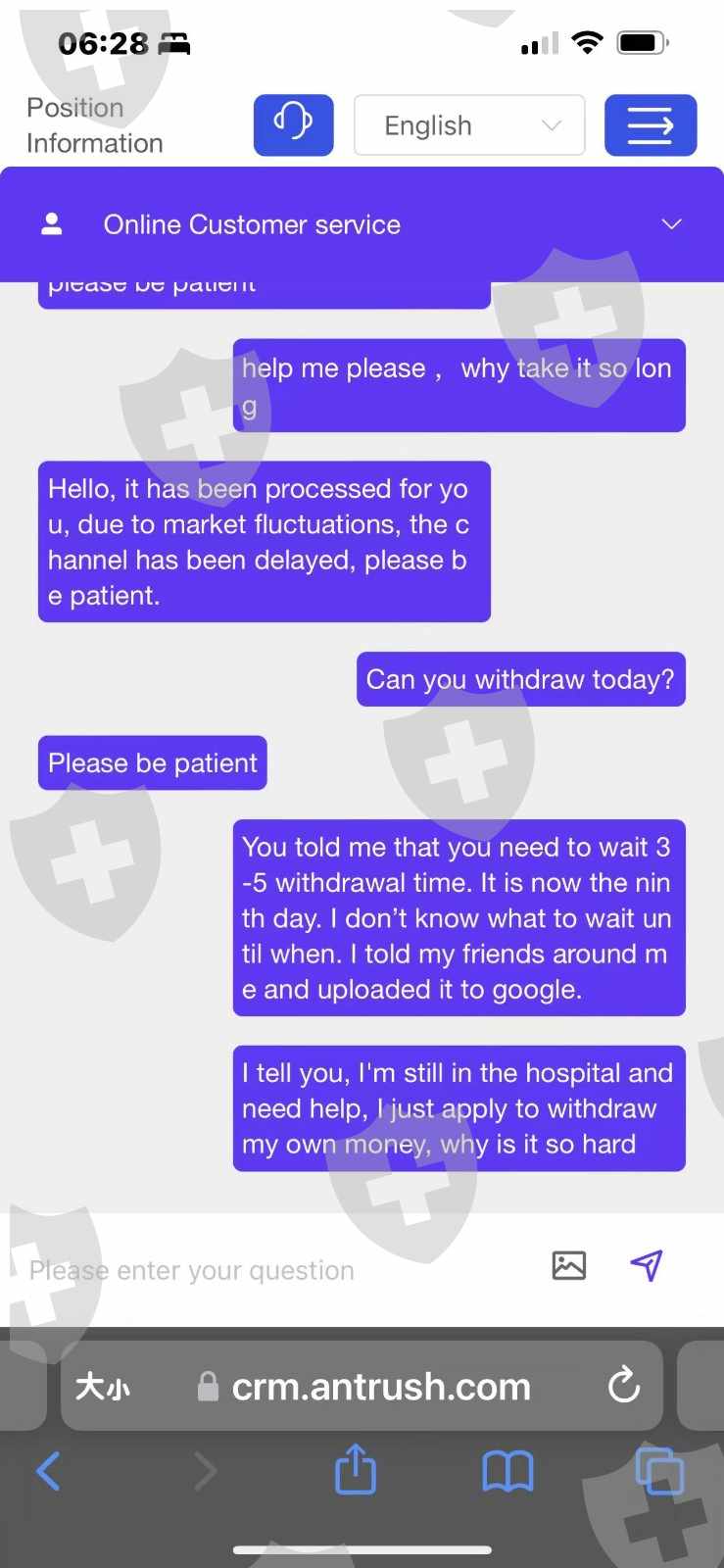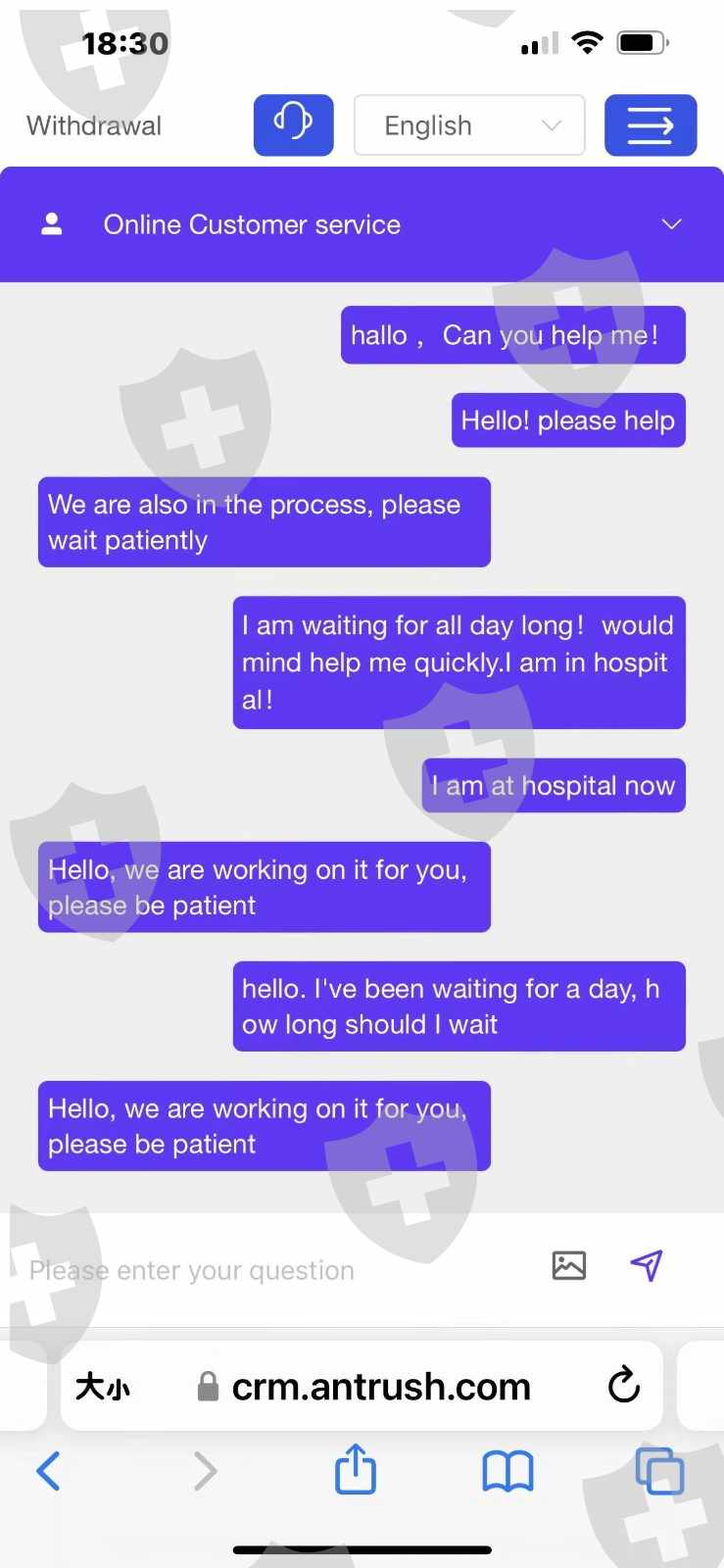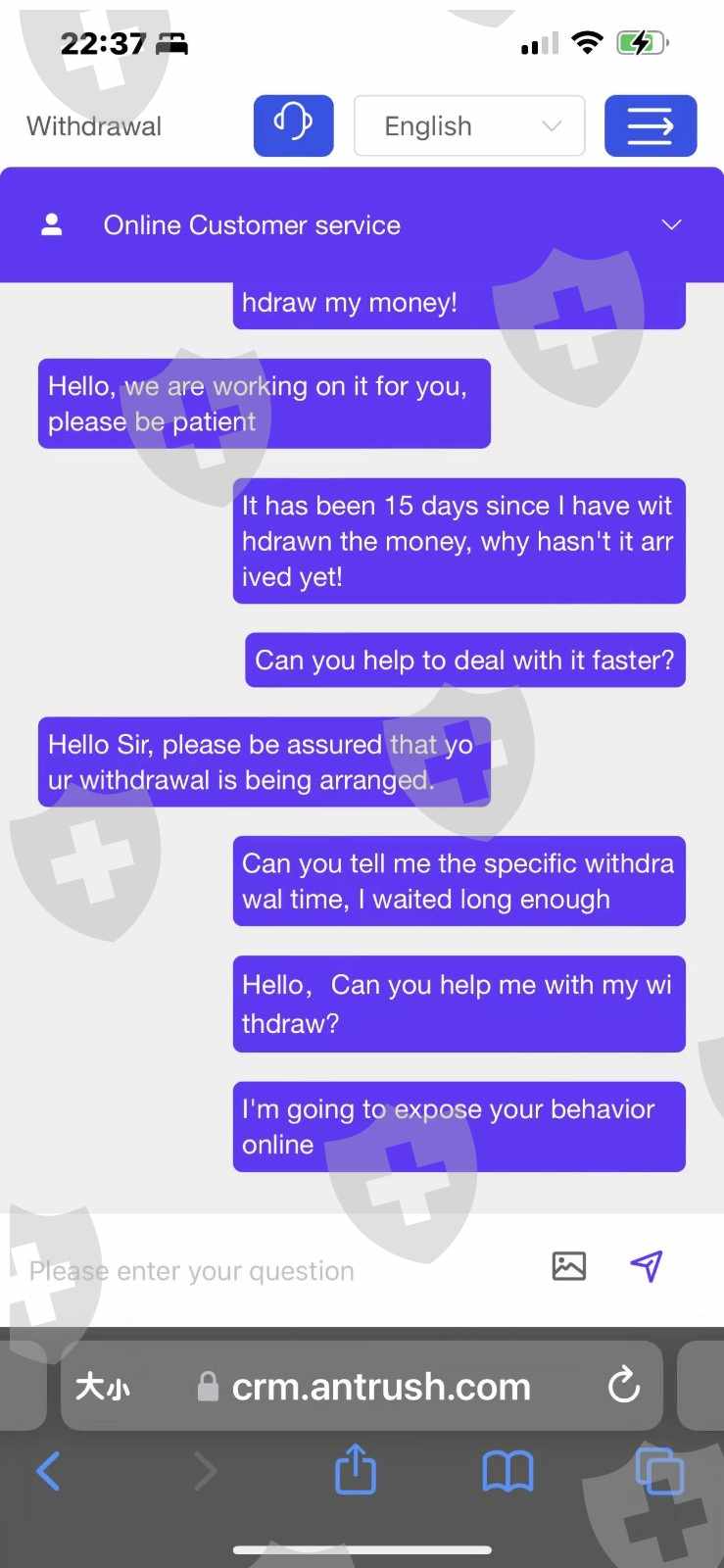 我叫李忠 antrush 交易号码28738, 在2022年6月8号取8000USDC,和6月11号取16000USDC,到今天6月25号没有出金,和客服多次沟通,刚开始说3-5天处理时间,从第六天开始告诉我耐心等待,一直到25号每天都是讲同样的话,现在已经信息都不回了,简直是诈骗公司的行为,以截图为证,特此举报