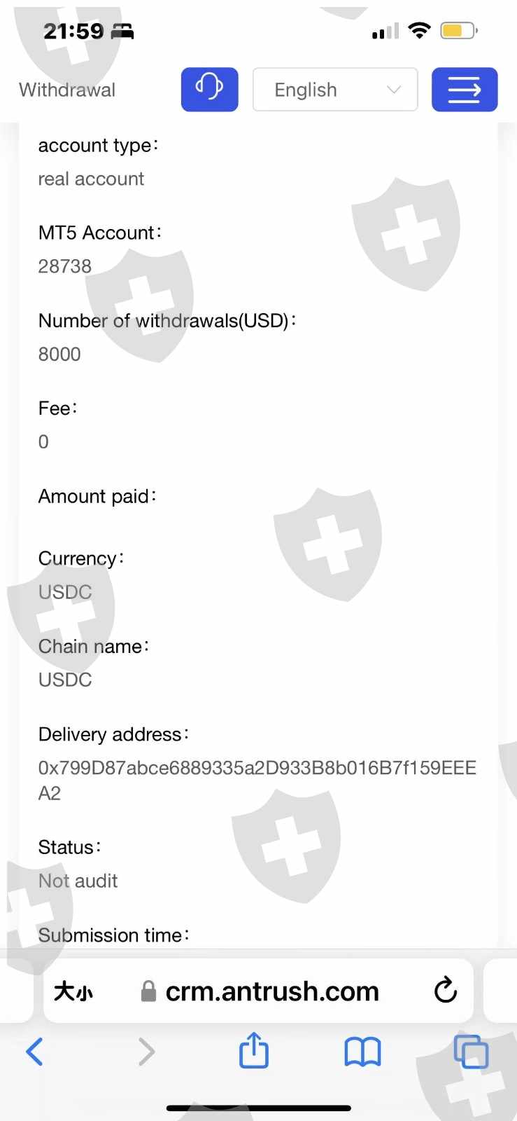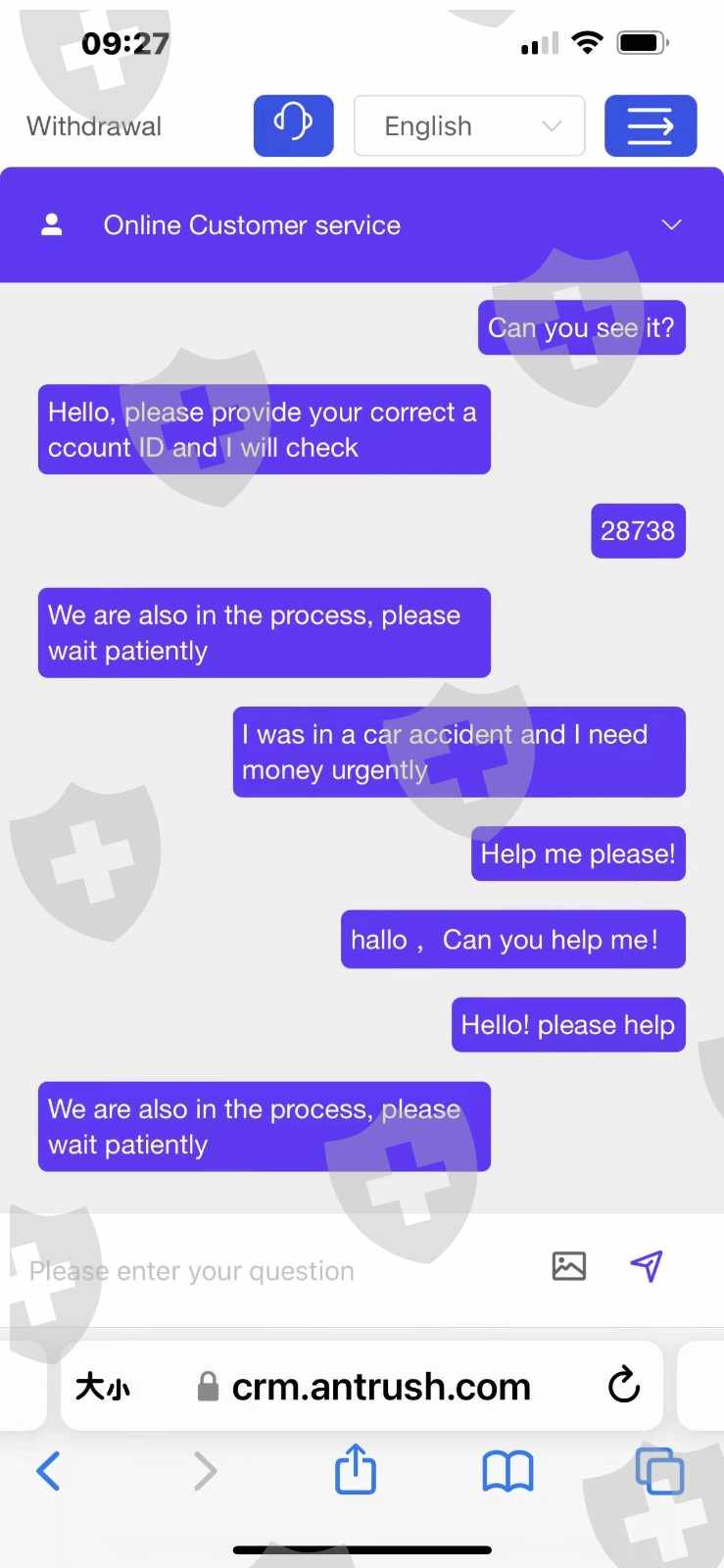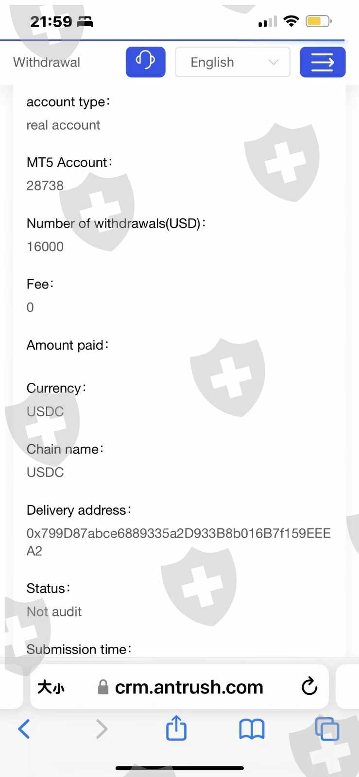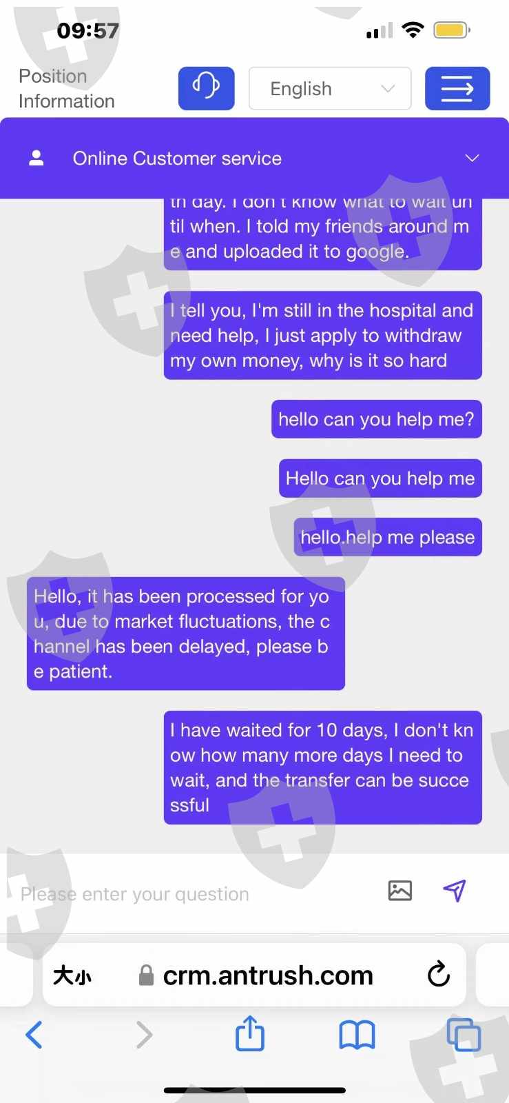 我叫李忠 antrush 交易号码28738, 在2022年6月8号取8000USDC,和6月11号取16000USDC,到今天6月25号没有出金,和客服多次沟通,刚开始说3-5天处理时间,从第六天开始告诉我耐心等待,一直到25号每天都是讲同样的话,现在已经信息都不回了,简直是诈骗公司的行为,以截图为证,特此举报