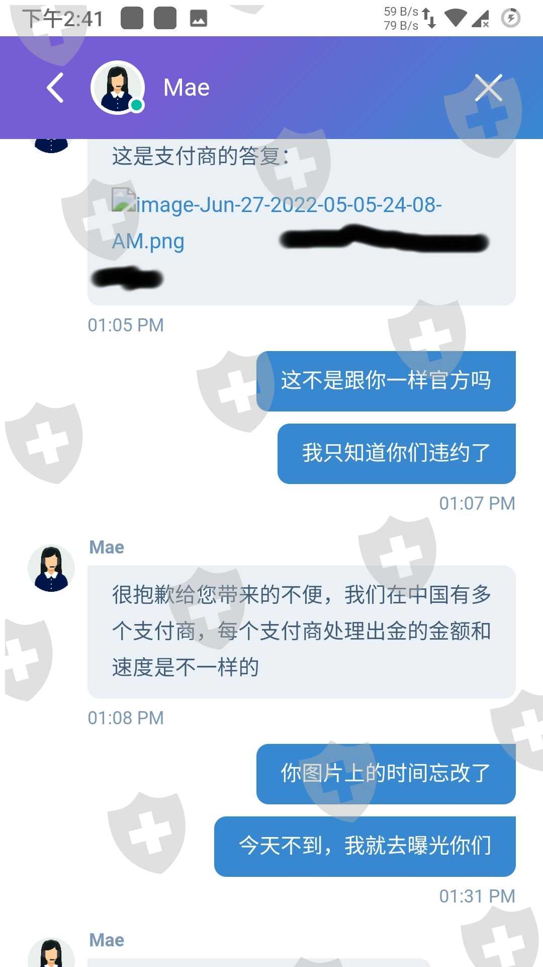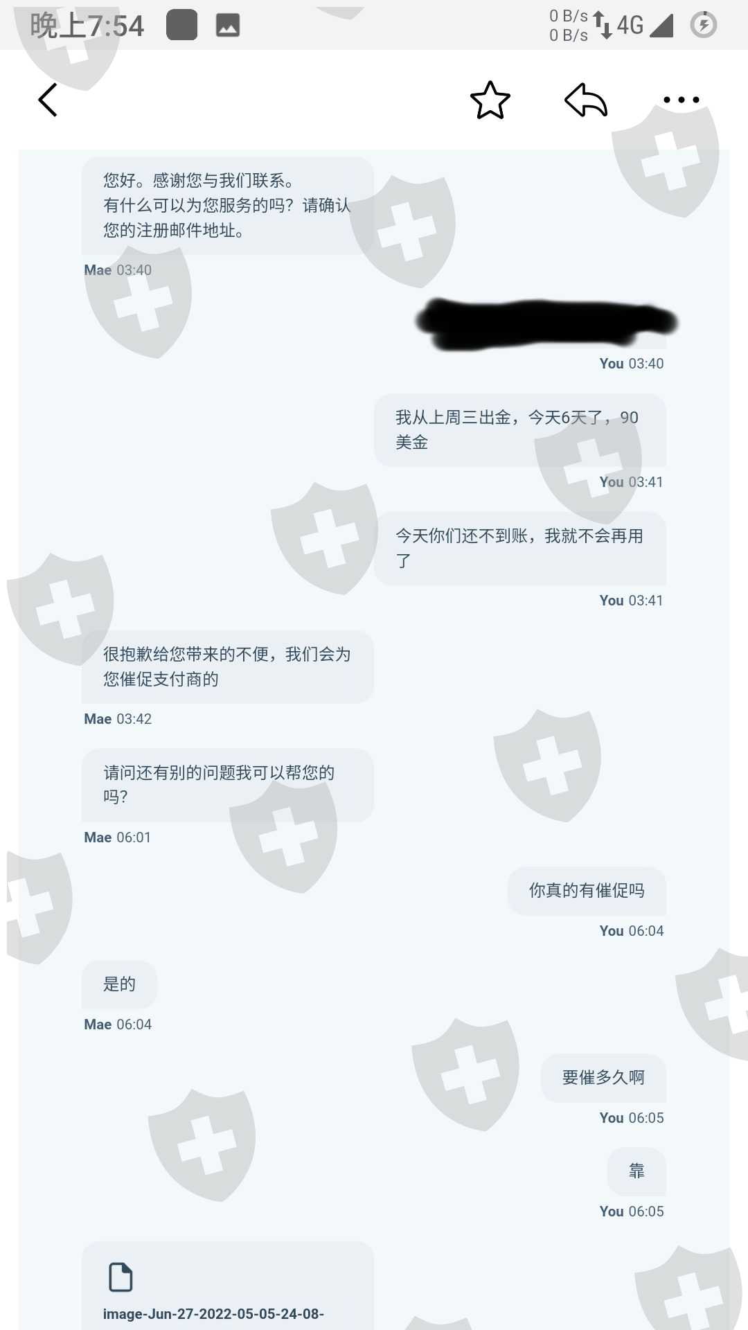 6月22日凌晨4点提起出金申请,严格来说还处在21日的盘,大半夜也没人工作啊,但22号整个白天硬是没有审核处理,到23号下午三点才审核处理,又说要从审核处理算起,1-3天,最多到26号吧,可27号了,过了自己规定的时间,又说支付商速度不同,会帮我催,还给我发了支付商的回复邮件,大家看看,那个截图是5月5号凌晨的截图,根本不是我的。也就是说,客服拿了一个一个月前的别人的截图敷衍我,上边没有任何时间,还是截图本身自带的时间暴露了他们。整整算了下来,6天了,才90美金,愣是没提出来。主要是2020年刚开始用的时候,从申请,到收款,也就三天,出金周期增长了一倍,现在仍没有提出来,客服还骗我。请大家注意,可能要跑路了。