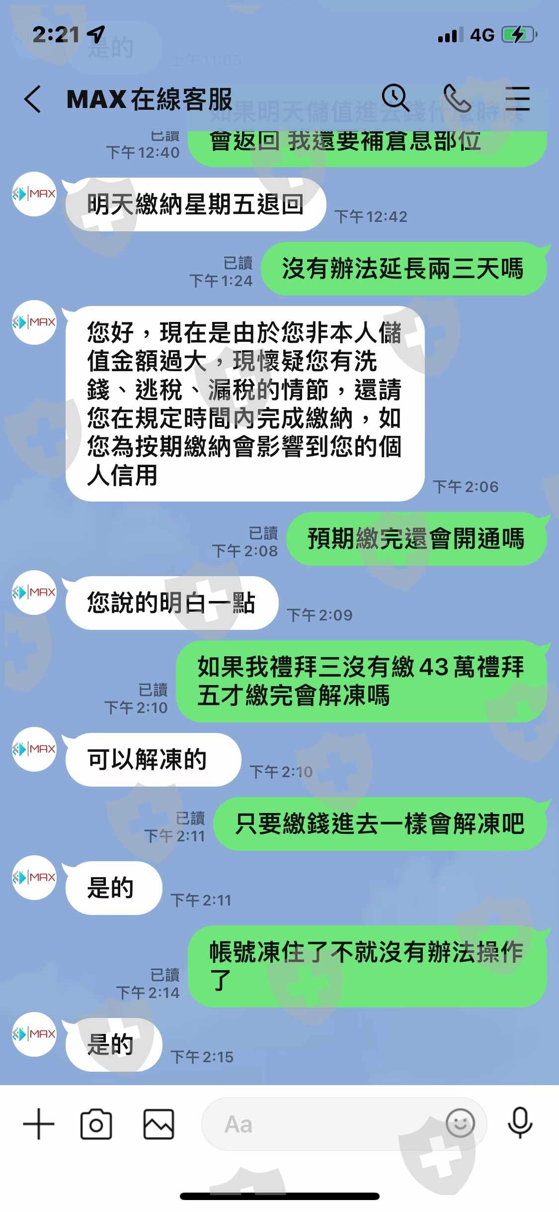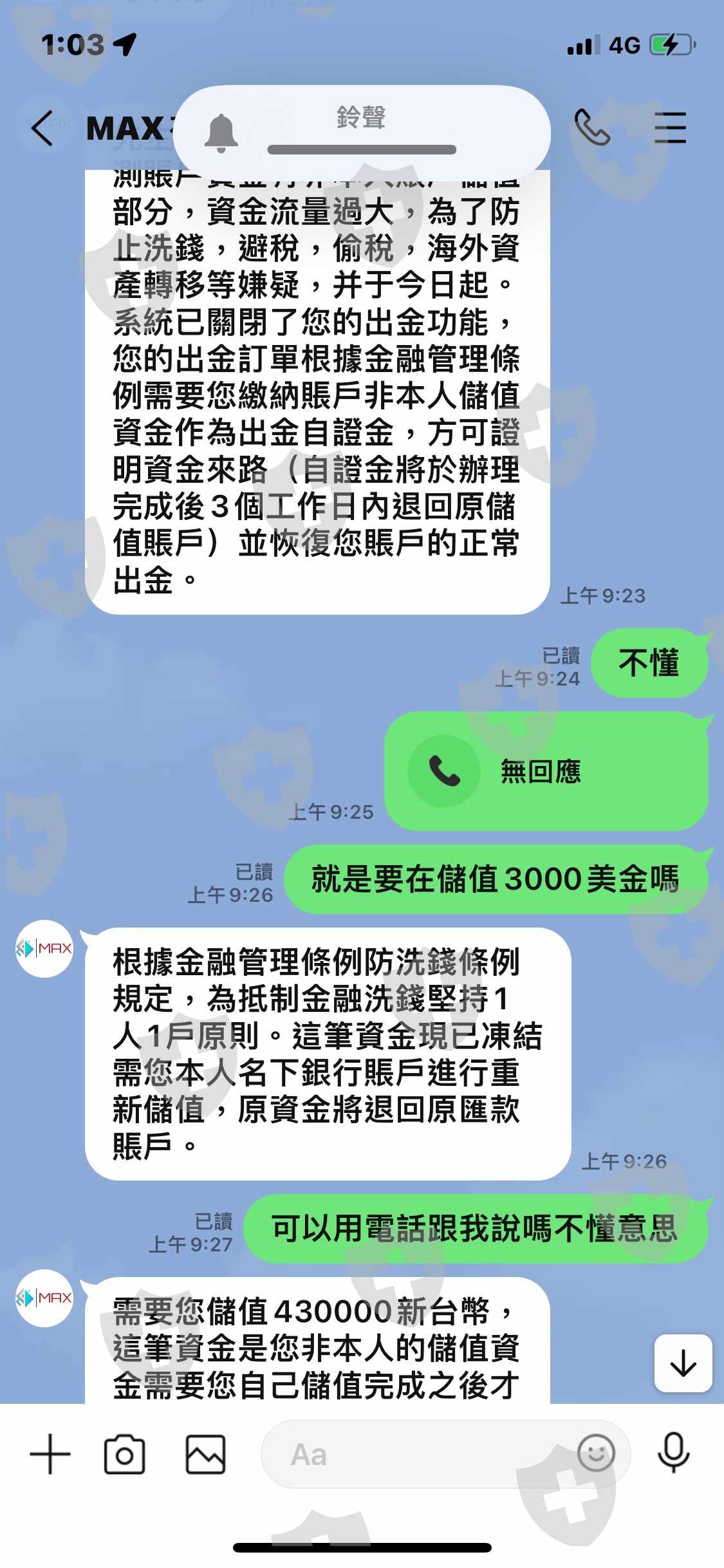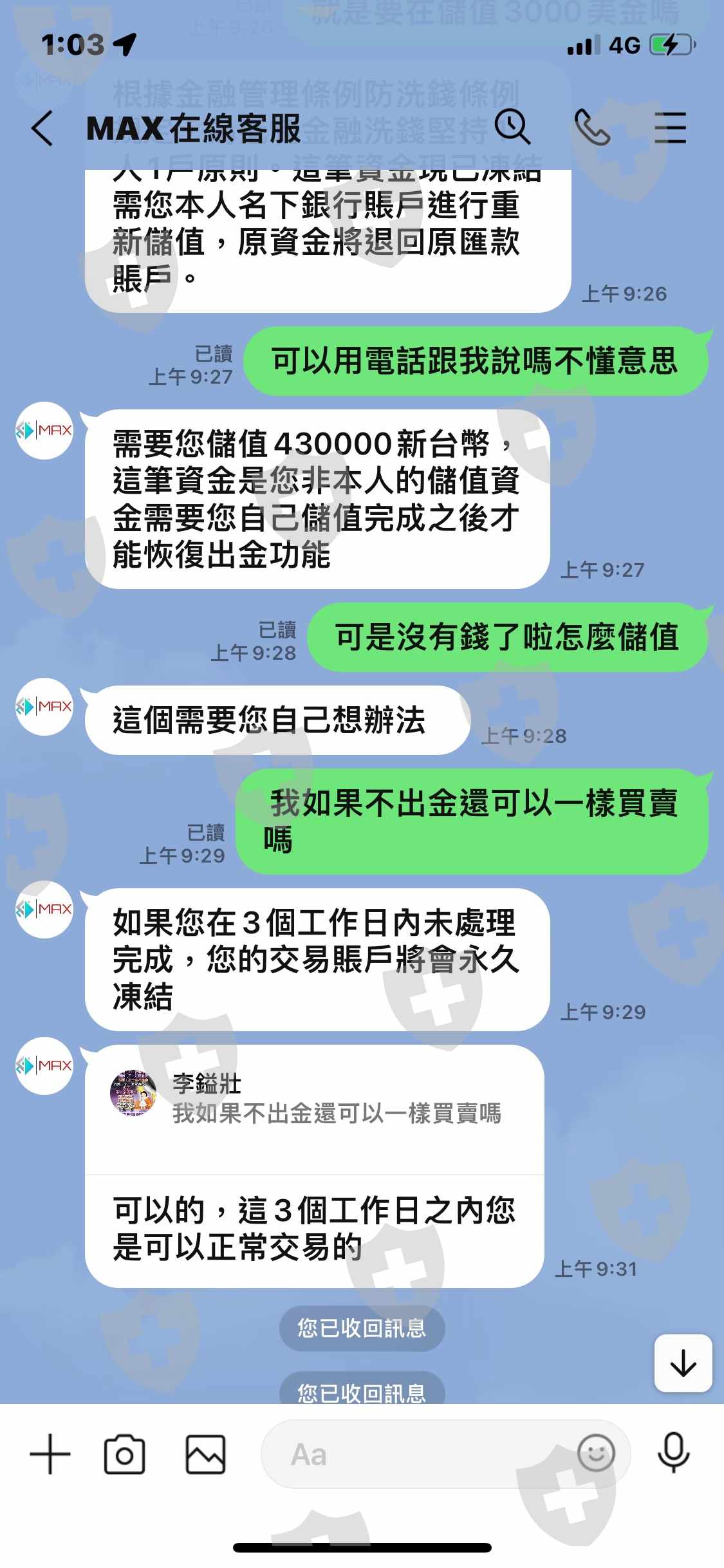先生您好,您的賬戶被金管檢測賬戶資金有非本人賬戶儲值部分,資金流量過大,為了防止洗錢,避稅,偷稅,海外資產轉移等嫌疑,并于今日起。系統已關閉了您的出金功能,您的出金訂單根據金融管理條例需要您繳納賬戶非本人儲值資金作為出金自證金,方可證明資金來路(自證金將於辦理完成後3個工作日內退回原儲值賬戶)並恢復您賬戶的正常出金。 根據金融管理條例防洗錢條例規定,為抵制金融洗錢堅持1人1戶原則。這筆資金現已凍結需您本人名下銀行賬戶進行重新儲值,原資金將退回原匯款賬戶。 需要您儲值430000新台幣,這筆資金是您非本人的儲值資金需要您自己儲值完成之後才能恢復出金功能 如果您在3個工作日內未處理完成,您的交易賬戶將會永久凍結