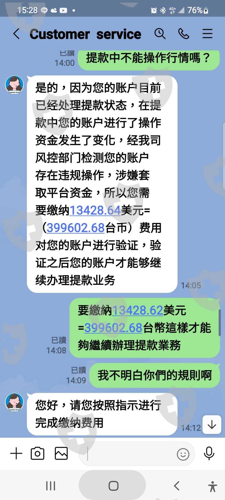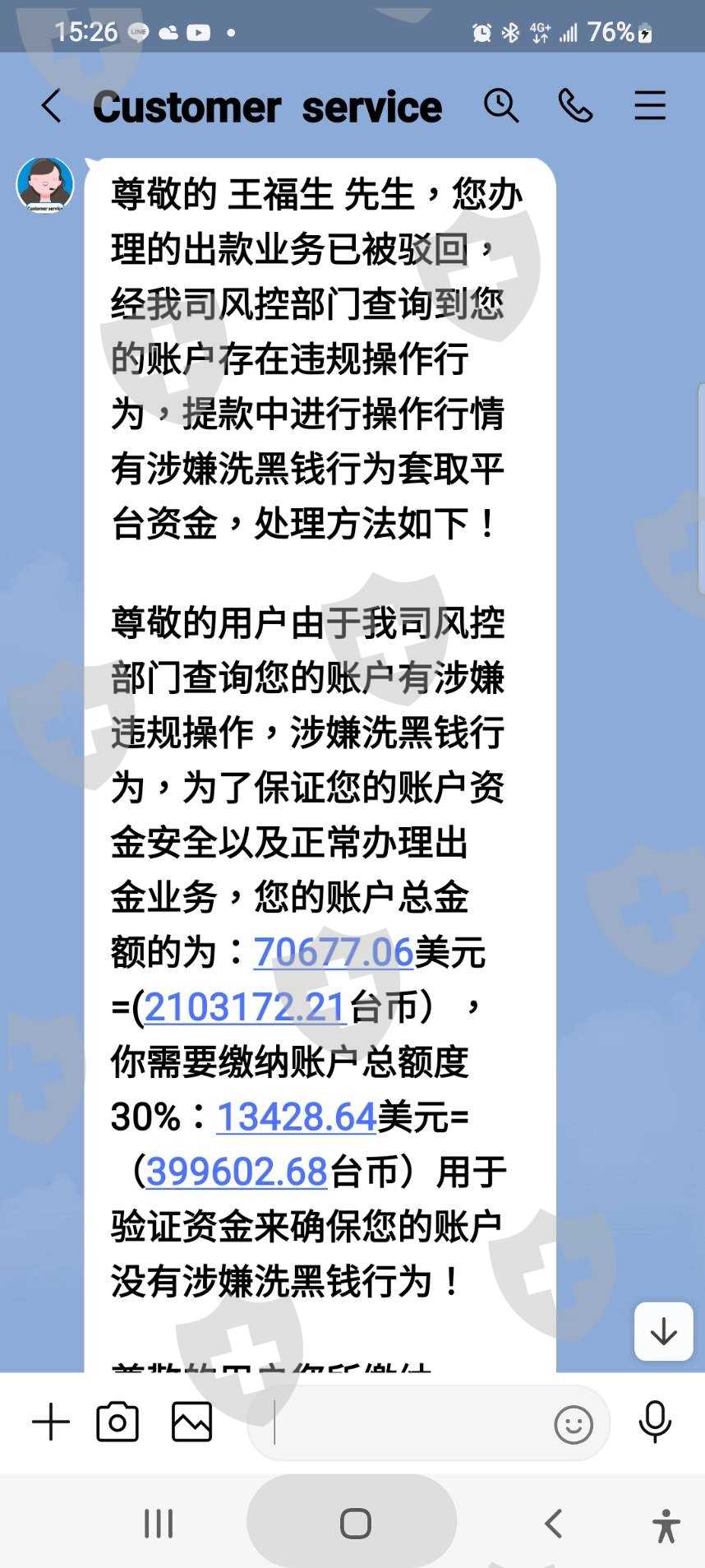 請問一下客服說我涉嫌洗黑錢,可是我是朋友教我操作行情,怎麼說是洗黑錢呢?我有申請提領出金,因網站維修後我都沒有登錄帳戶,朋友教我登錄後順便操作行情,可能他也不知道這樣子不可以,客服說要我繳納總額的30%當保證金,可是這對我來說已經是非常大的負擔,不在期限內繳納帳戶會被凍結刪除,請問卷商可以這樣做嗎?這是我們辛苦賺的錢啊~