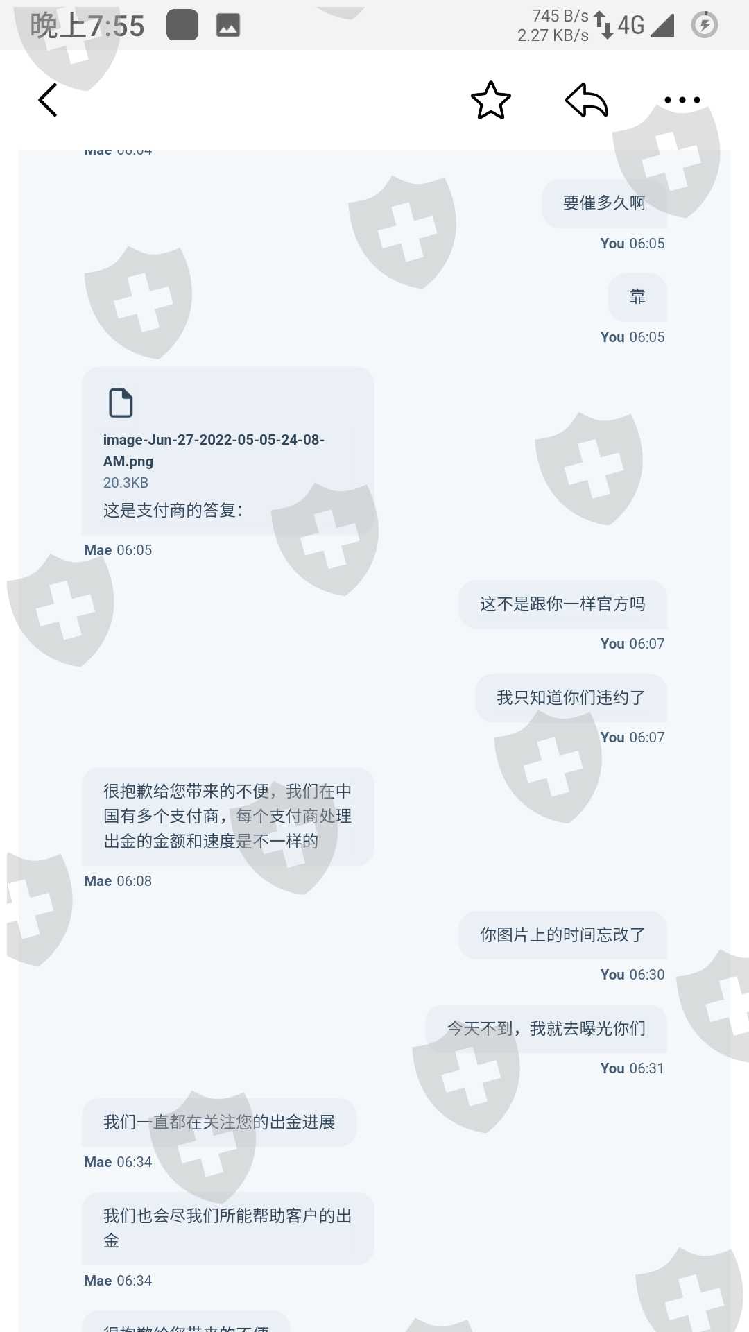 6月22日凌晨4点提起出金申请,严格来说还处在21日的盘,整个白天硬是没有审核处理,到23号下午三点才审核处理,又说要从审核处理算起,1-3天,那也应该26号就行了吧!27号了,过了自己规定的时间,又说支付商速度不同,帮我催,发个图片,光秃秃几行字,只会抱歉抱歉,也不承诺,截止日期呢,对象呢?谁知道有没有催,什么时候搞定。主要是,去年出金,从申请到打款也就三天,这马上就7天了,一个外汇交易商,出金开始困难,意味着什么呢?希望大家注意。。。