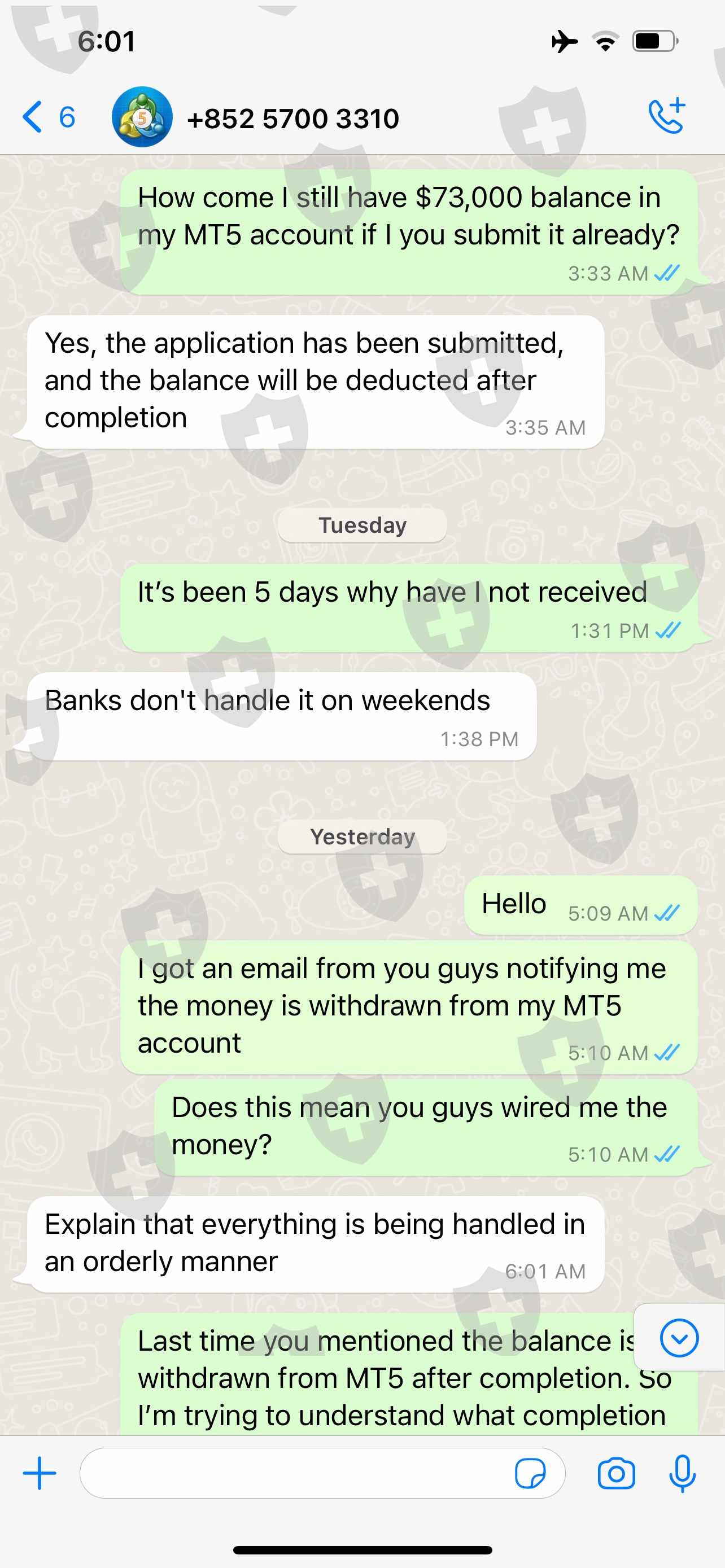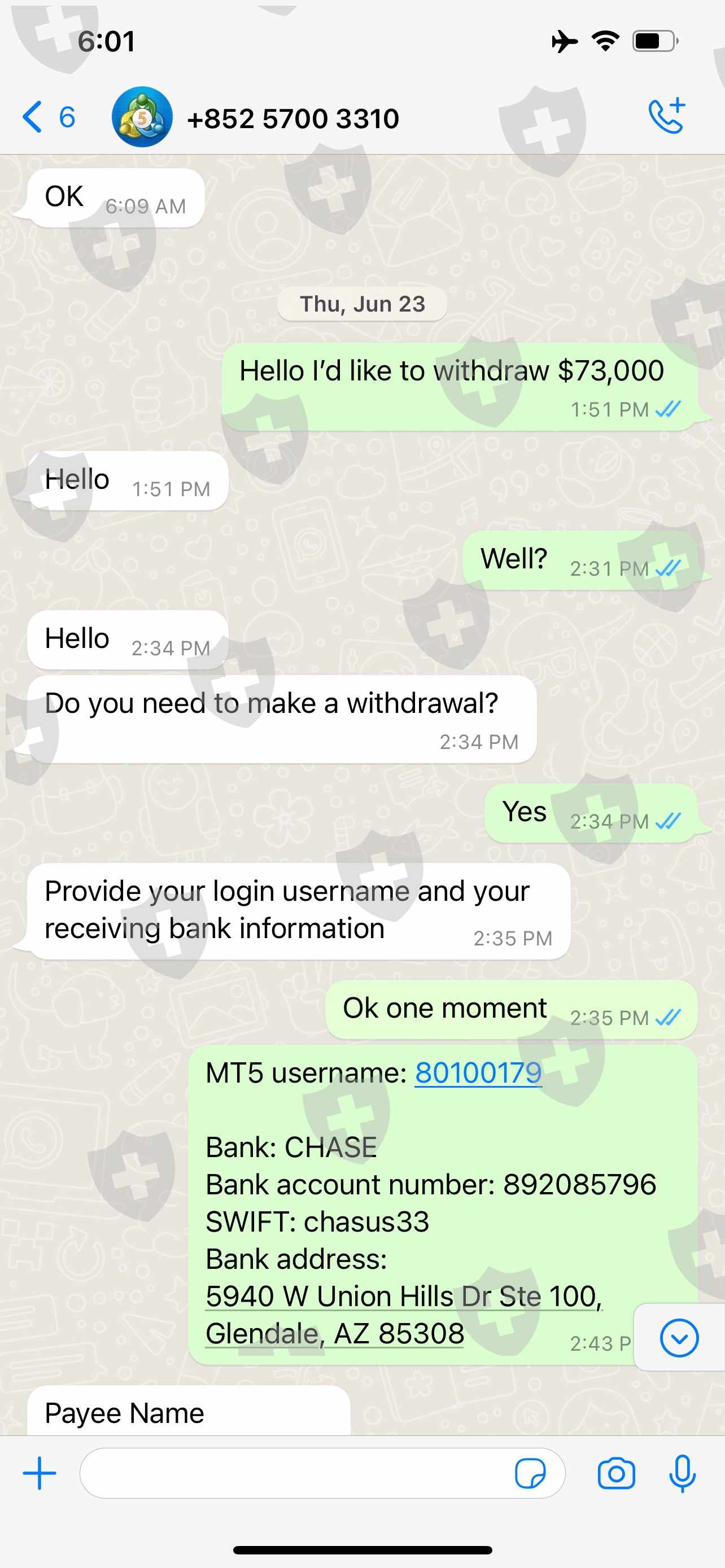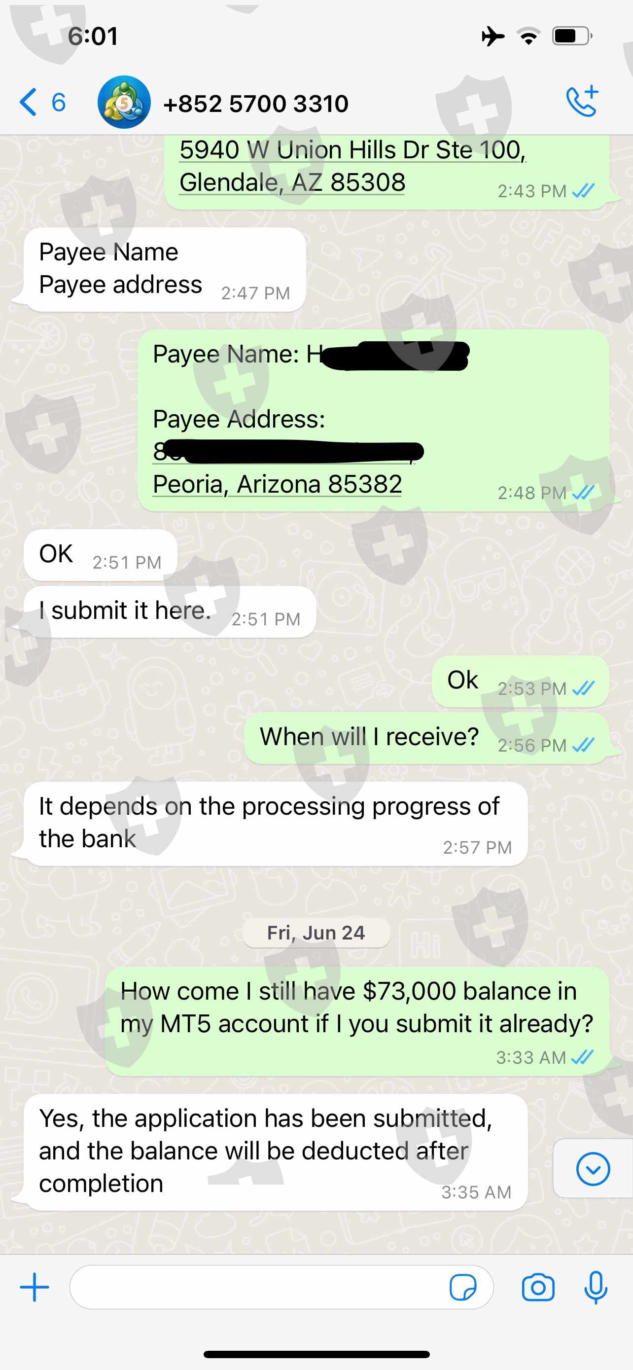 我去银行给交易商汇了5万美元。我收到了VS MARKET的通知,说5万美元已存入交易商账户。赚了23,000美元,当我尝试提款时,他们要求提供银行信息,然后告诉我他们提交了。他们说一旦完成,他们将从交易商账户中提取余额。我收到一封电子邮件,说这笔钱已从交易商账户中扣除,但钱从未到我的银行账户!今天我收到一封电子邮件,说钱已存入交易商帐户。我很困惑,给代表发了信息,他们开始找借口说我不能出金,需要做更多的交易。提款是洗钱等犯罪活动。