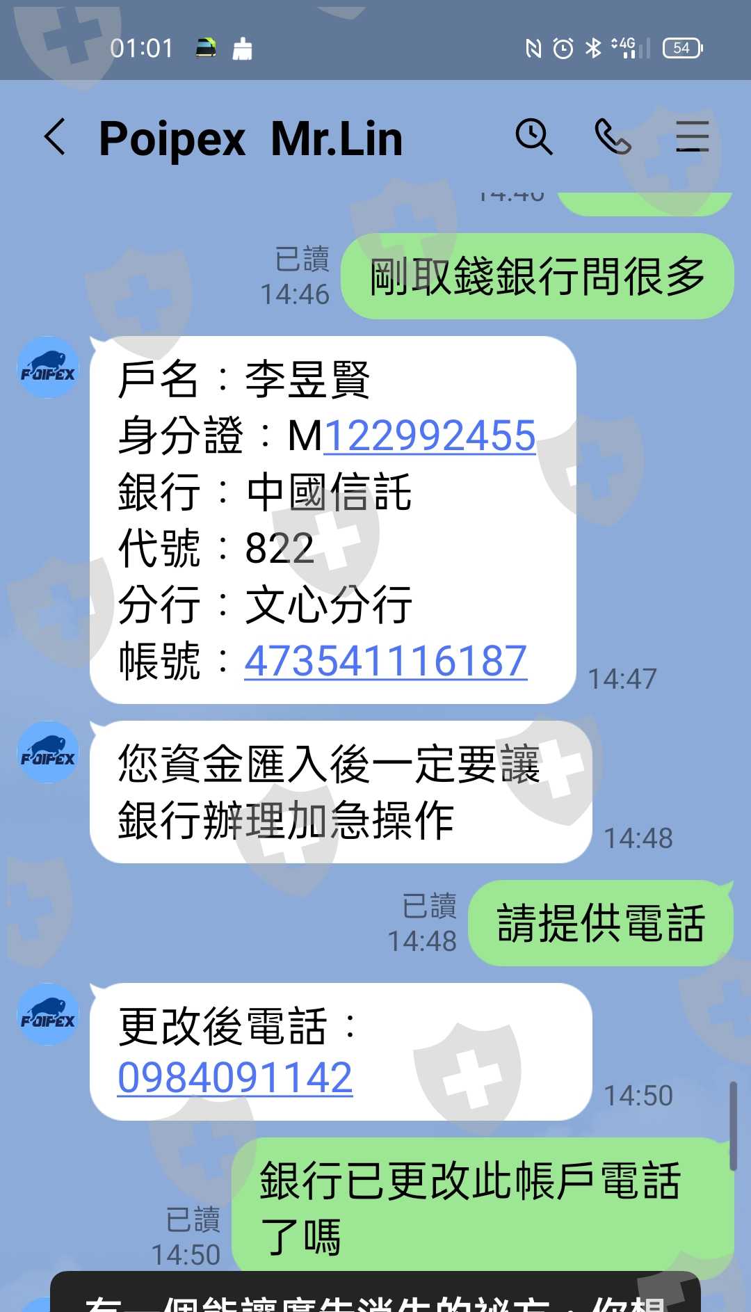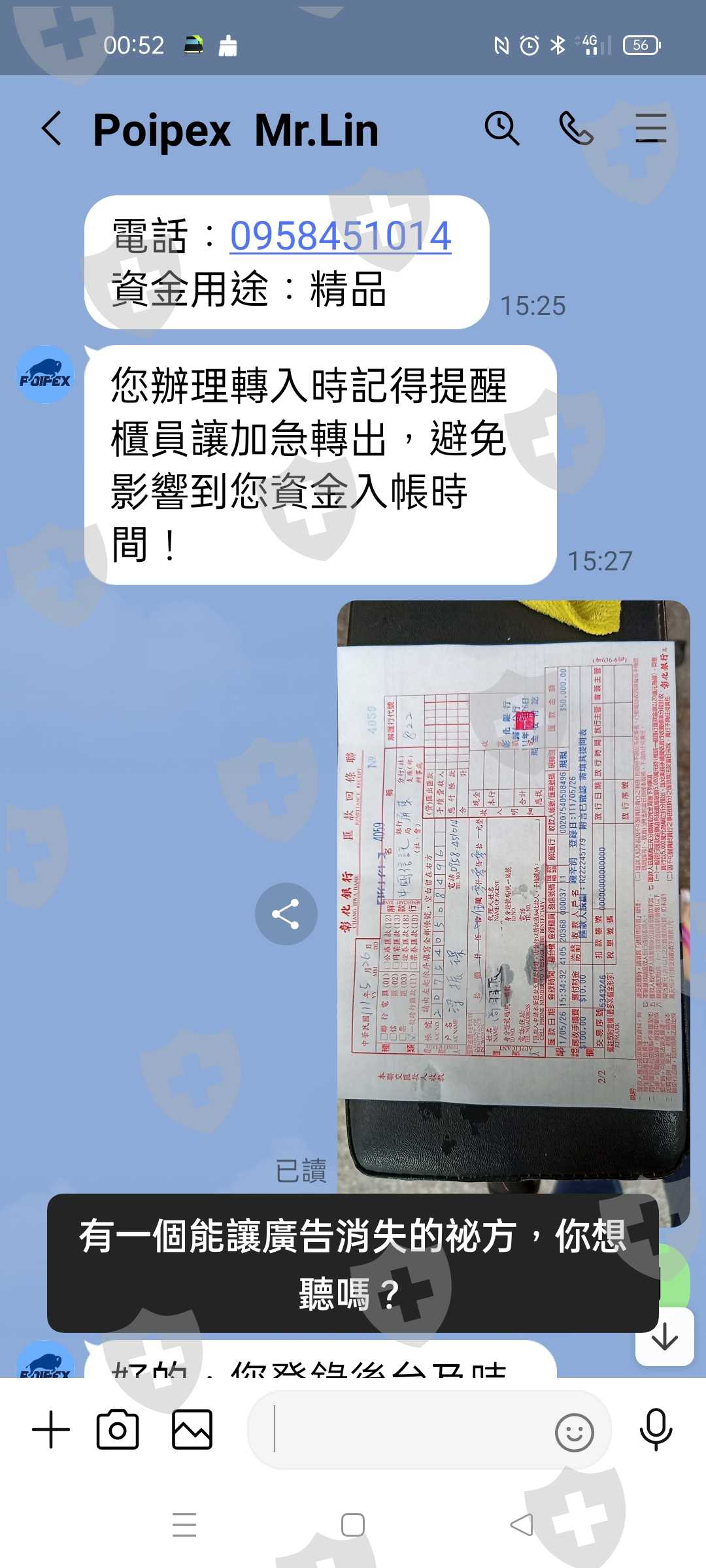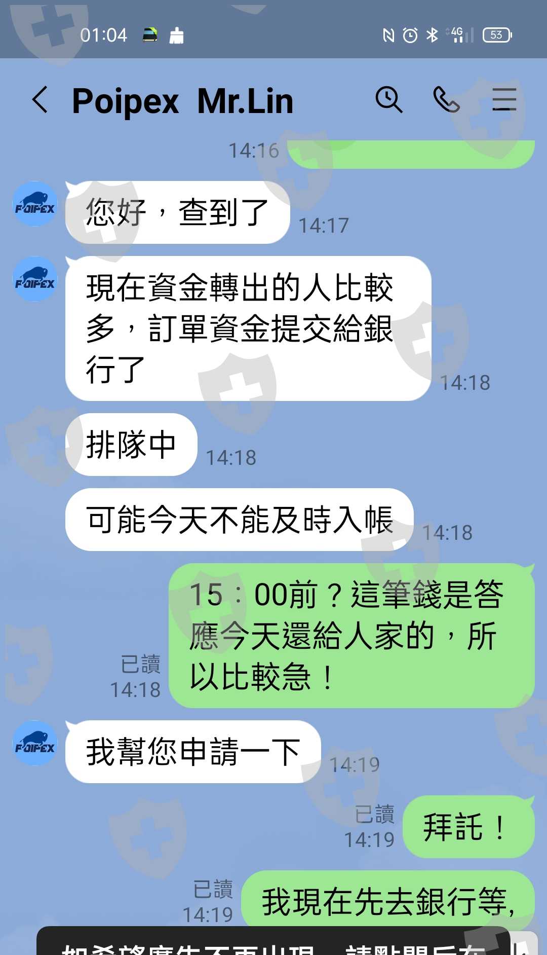 下方照片是我存入Poipex資管帳戶的資金,還有存入時和平台林經理的對話,還有出金隔天說已在銀行系統中,最後又說太多人出金,還在系統排隊中,到現在已經10幾天了,出了好幾筆,加總380萬,全部未到帳,一直要我再繳50萬台幣辦理快速通道,說兩小時可到帳,他說他公司在香港九龍,我也願意辦理但我要求由香港朋友拿錢當場辦理,請他給聯絡電話,地址,說好的,最後沒給,也不接LINE電話了,
