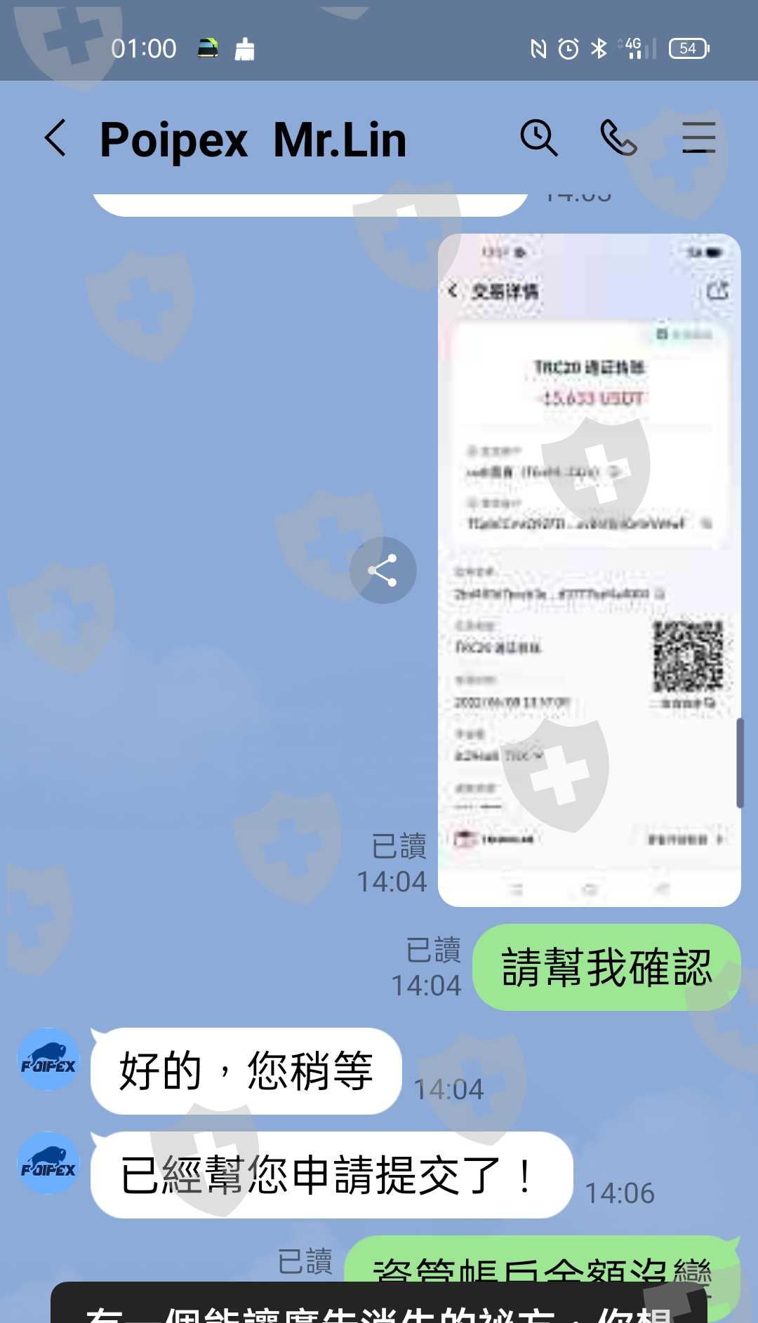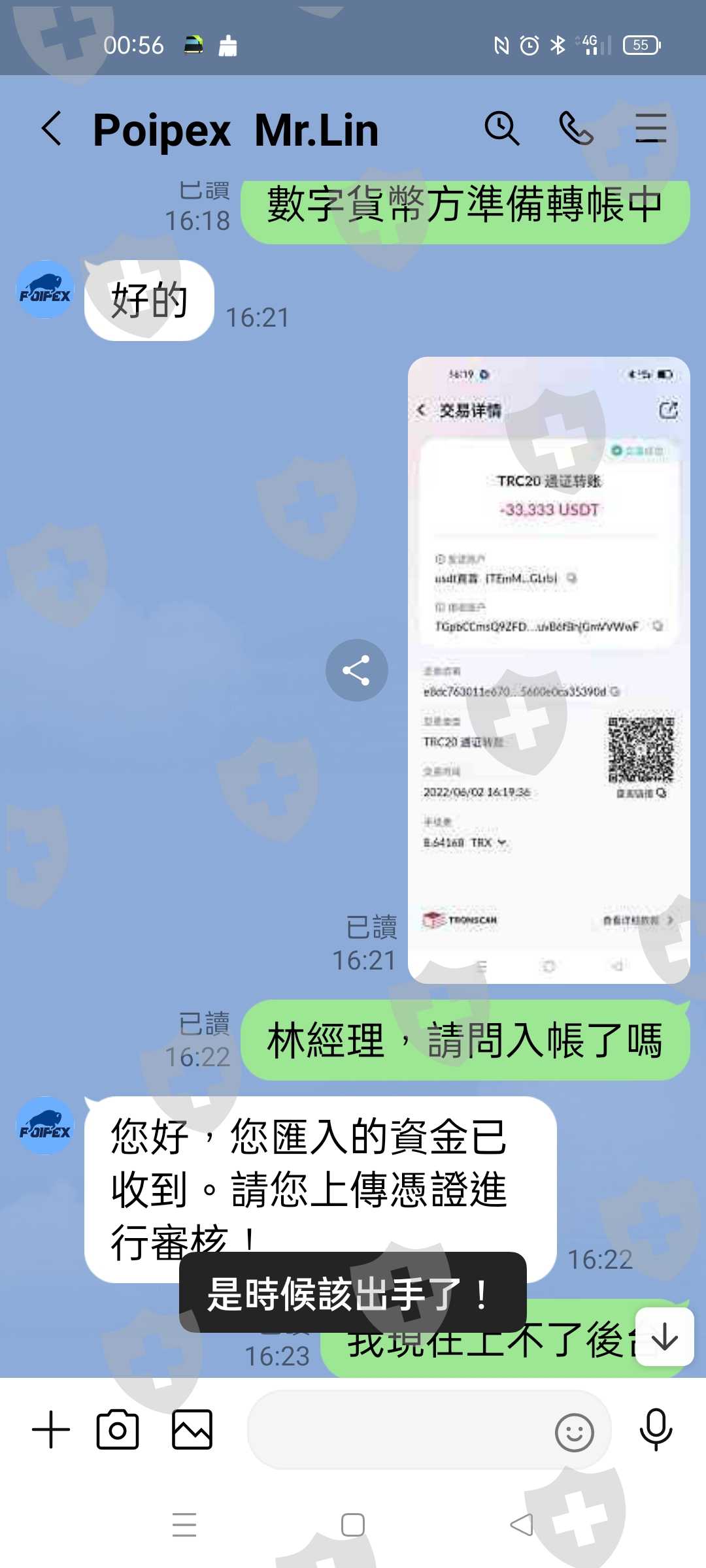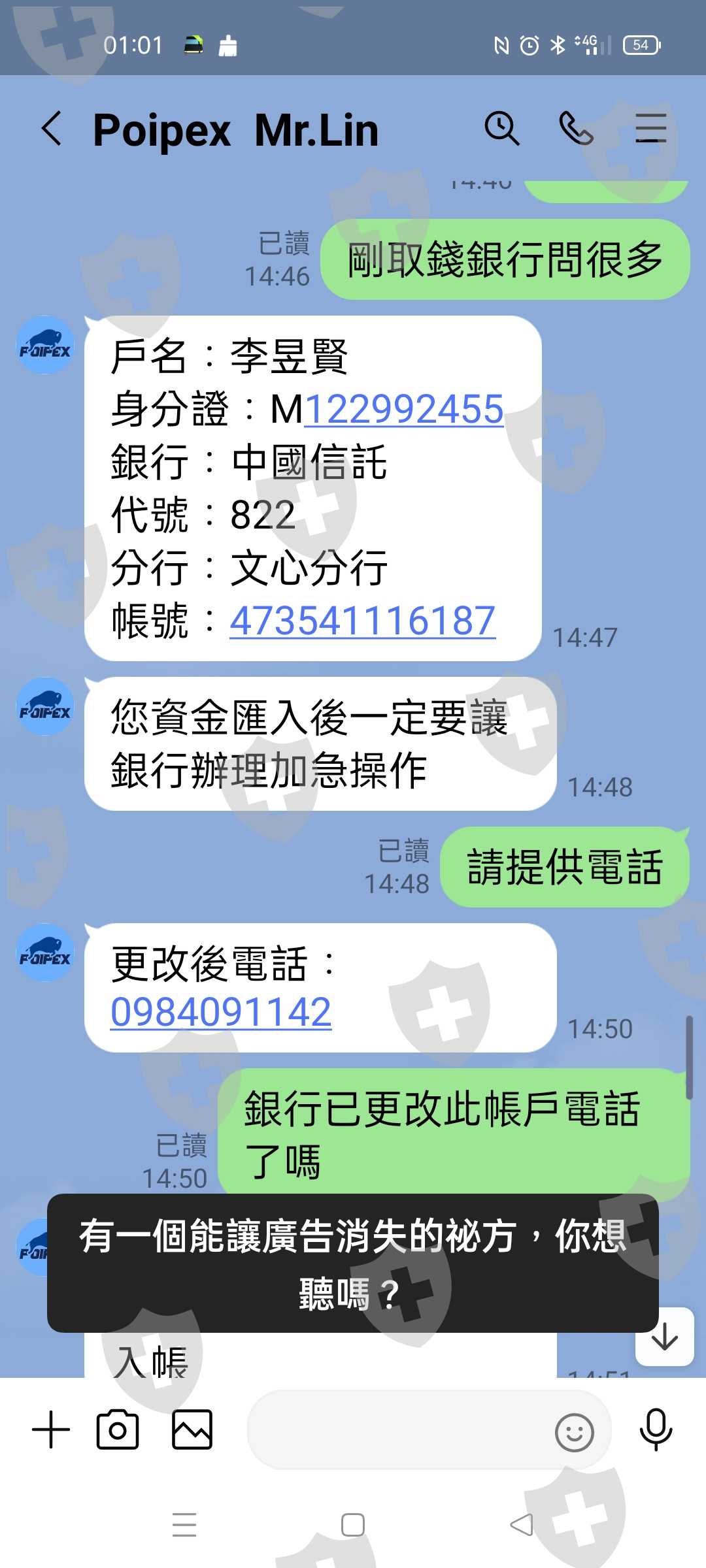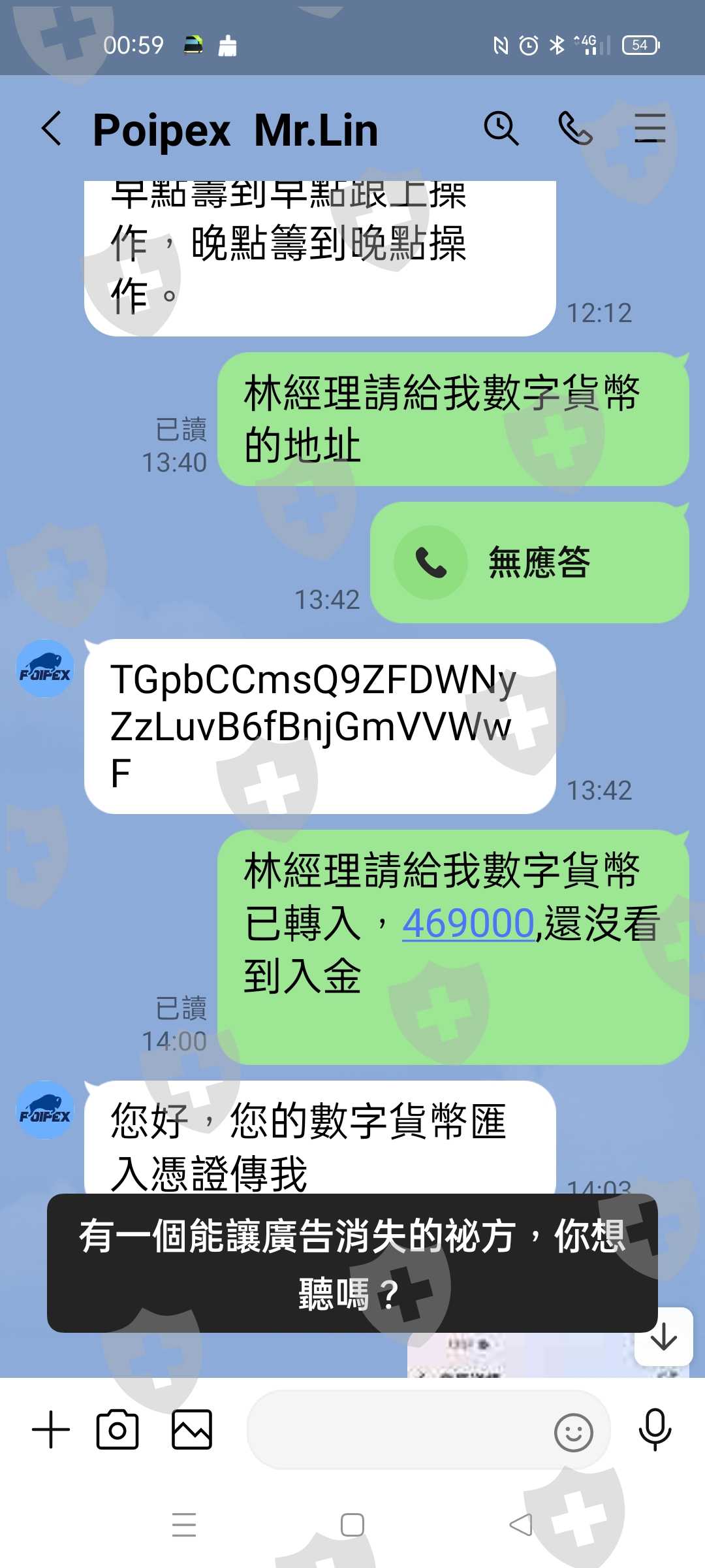 下方照片是我存入Poipex資管帳戶的資金,還有存入時和平台林經理的對話,還有出金隔天說已在銀行系統中,最後又說太多人出金,還在系統排隊中,到現在已經10幾天了,出了好幾筆,加總380萬,全部未到帳,一直要我再繳50萬台幣辦理快速通道,說兩小時可到帳,他說他公司在香港九龍,我也願意辦理但我要求由香港朋友拿錢當場辦理,請他給聯絡電話,地址,說好的,最後沒給,也不接LINE電話了,