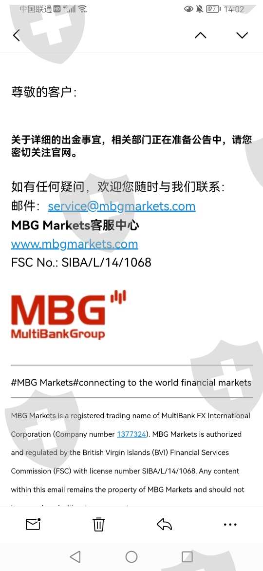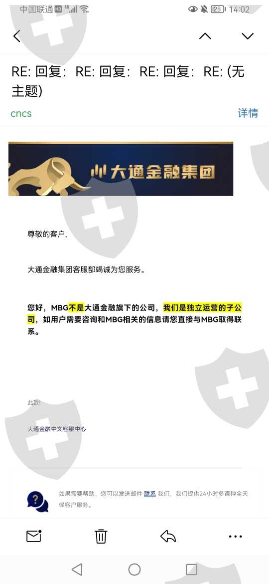 6月24日中午过后手机无法登录交易软件,联系客户经理却被告知离职,而且离职半年了居然没有大通金融方面其他客户经理联系我们,最后还是听别人说要把我们账户转到大通金融,这时出金成了难,官网却难登录,客户都很着急。给大通金融发邮件却说让我们联系MBG,问他为什么旗下公司有了事情不第一时间通知我们,却说那是子公司不属于大通金融,可我们这些客户当时冲着大通金融的资质才去开户的,为什么当时不说那是子公司,现在开始推诿责任 担当,实在是让人心寒,辜负了我们这些客户的信任。