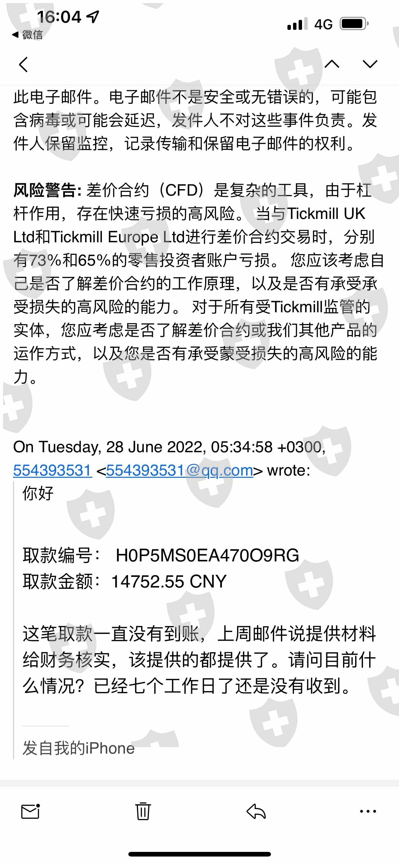 取款金额:14752.55 CNY。后续一直没有到账,联系客服,客服说财务与支付商在查询,目前已经十多个工作日,一直以来都是一样的邮件回复,没有解决任何问题,取款也一直没有收到。