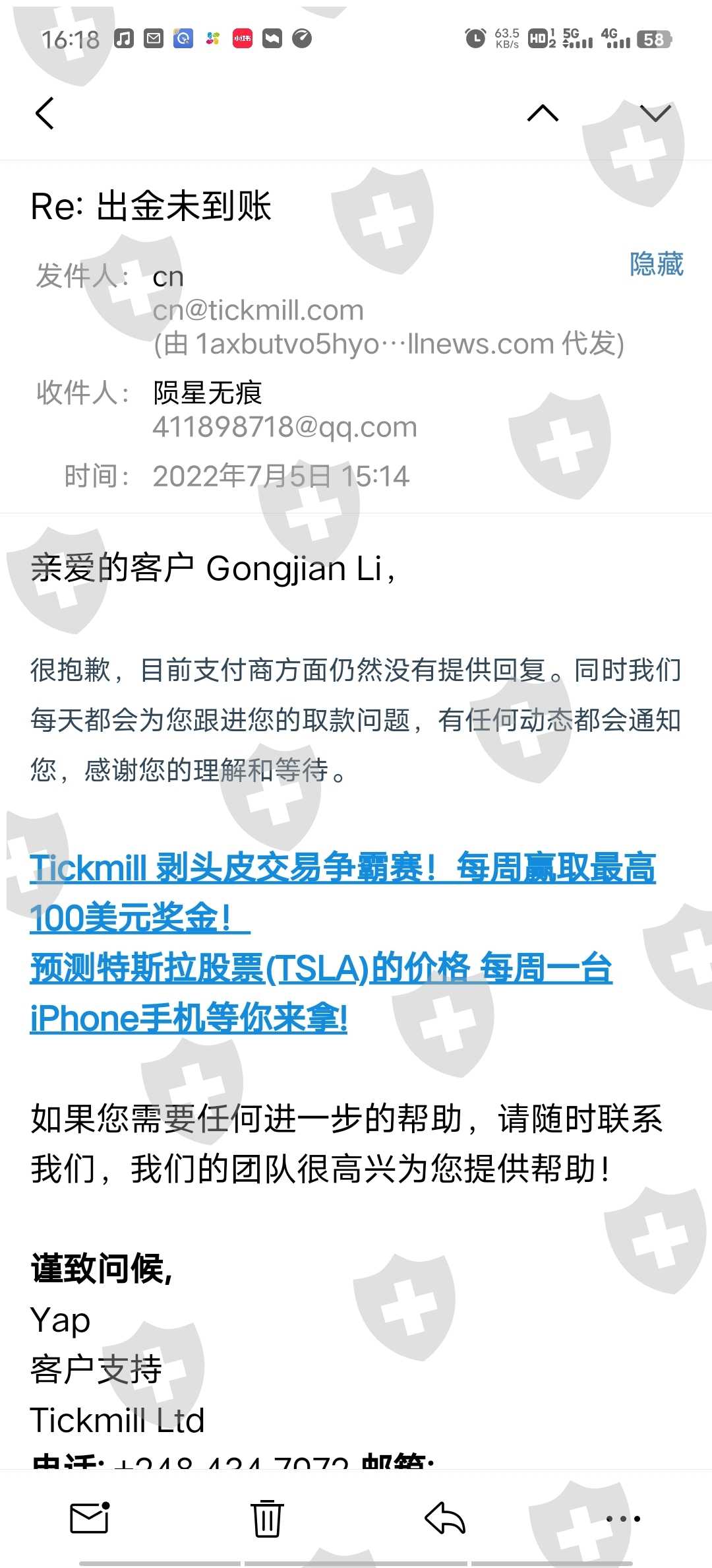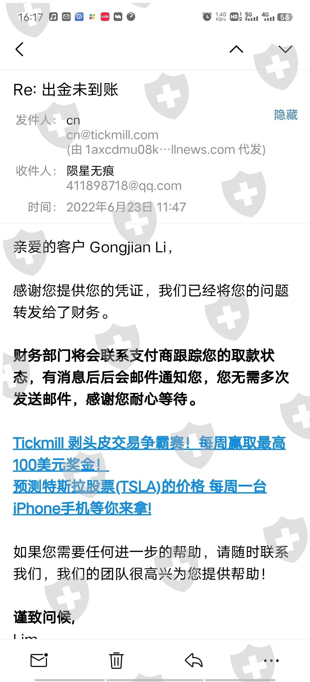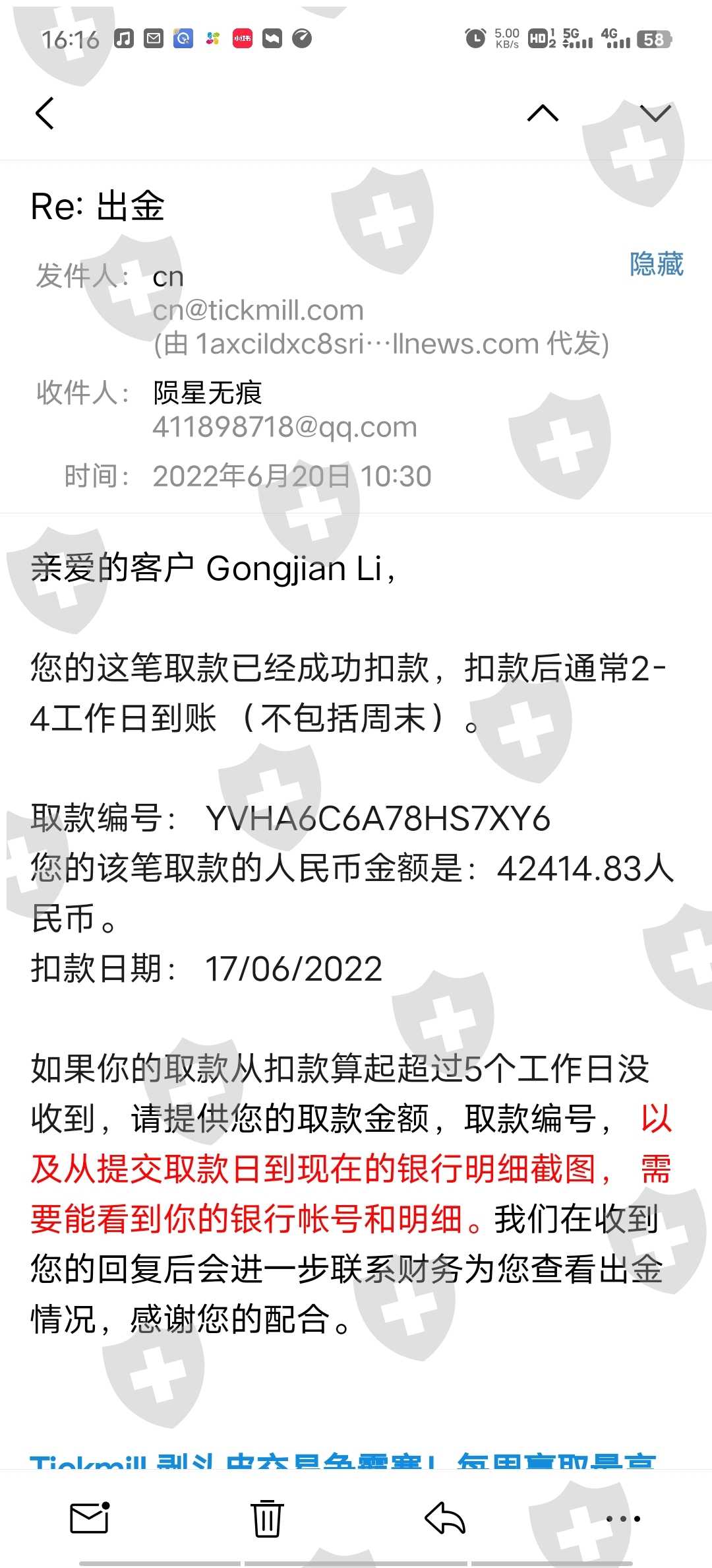 本人于6月16日申请出金,于6月17日扣款后至今,出金款一直没有到账。期间一直在申诉,客服一直推脱为支付商没有回复。请求给予关注