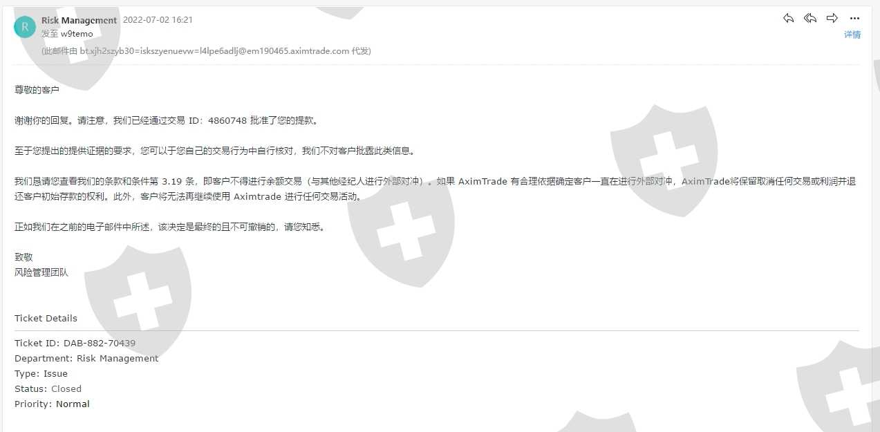 本人在7.1日在AximTrade平台入金1000美金,参加了他们的赠金活动,刚好抓住一波行情,账户基本翻倍,本想着继续交易,但是隔天突然收到邮件说我违反他们赠金条例,扣除我所有盈利,只能提取本金,我打开账户,盈利已被扣除,账户也是禁封状态,这个时候我已经非常后怕,第一时间先提交了本金出金,目前已经到账,然后问客服什么原因违规,客服表示不清楚,需要发邮件询问,我发邮件要求平台提供我违规的证据,平台回复是不对客户披露。我认为,既然你们认为我违规,直接扣除资金,禁封账户,肯定是已经有了十足的证据,否则就是乱来。完全就是你们个人认定!这样的行为跟黑平台有什么区别。