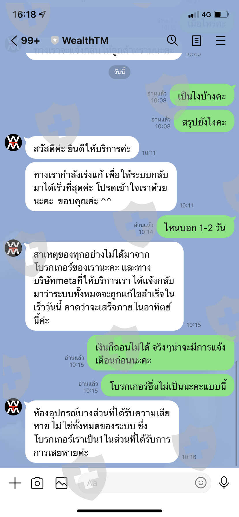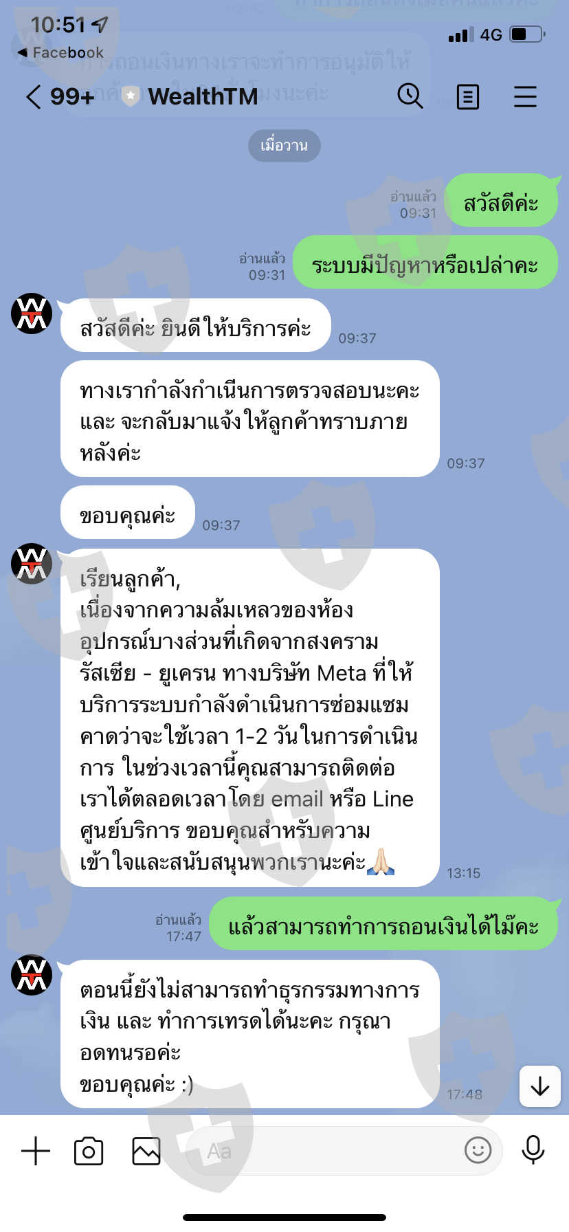 声称由于俄乌战争导致部分机房出现故障,Meta服务公司正在维修中。预计需要 1-2 天的时间来处理。在此期间,您可以随时通过邮件或Line服务中心联系我们。感谢您对我们的理解和支持。🙏🏻 Day 3声称一切的原因并非来自我们的经纪人。以及为我们服务的元公司已通知所有系统将很快成功修复预计本周内完成。