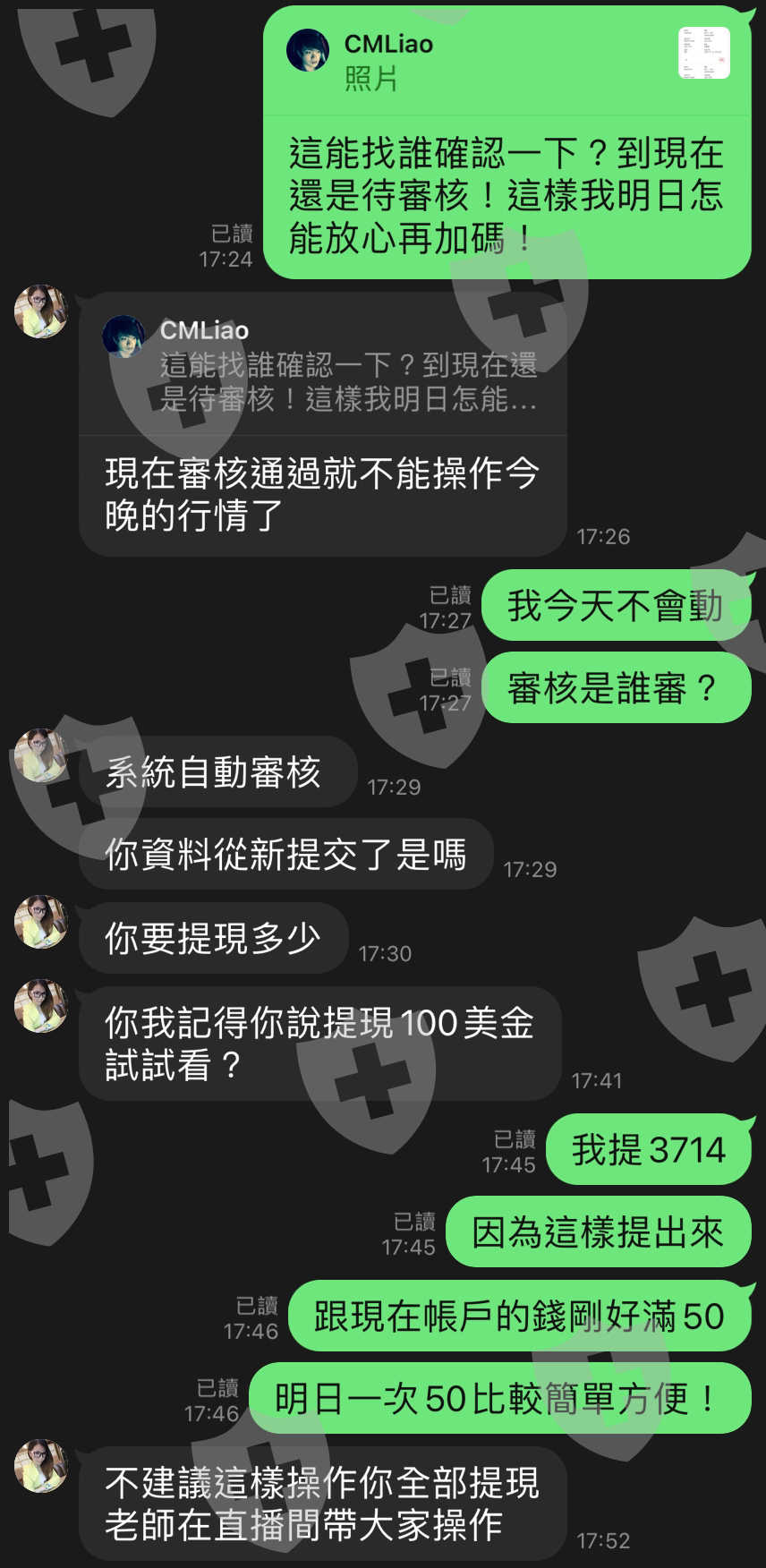 透過line廣告加入分析師,分析師推薦助理服務,近期由助理協助該平台註冊帳號、入金與操作外匯,因該平台無服務聯絡窗口,故詢問助理如何出金申請,按助理方式填寫後,要求出金3700美金,助理一直以不建議大量提領,先以小額提領為主,並再邀請多入金一點,系統申請永遠都是待審核,提領按助理說從3700降到500,助理說好的,然後系統還是待審核,似乎根本沒要給出金的意思