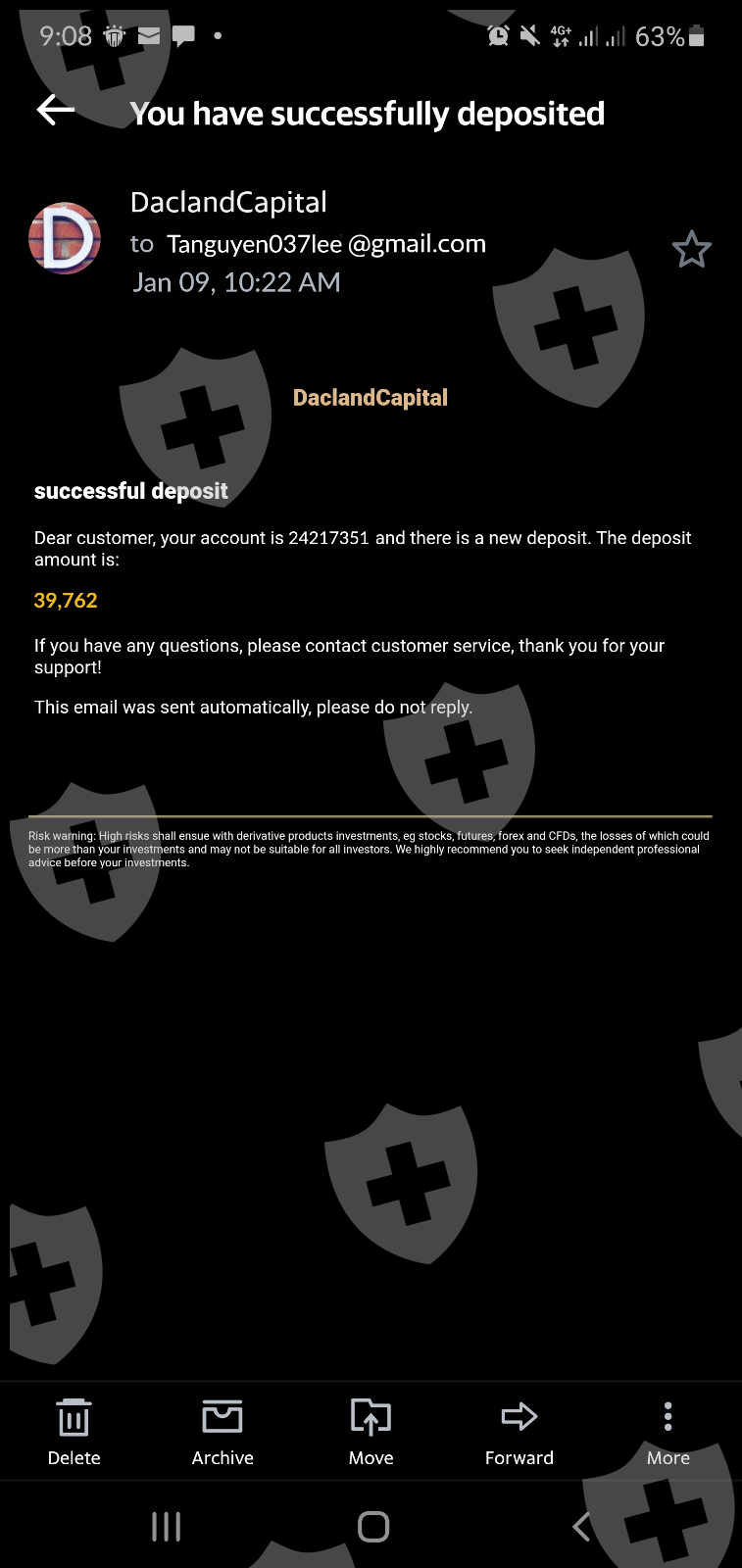 我不信任DACLAND并会建议任何潜在投资者非常认真地考虑给他们任何资金。尽管我要求关闭我的帐户并退还我的钱,但他们继续试图打电话给我进行更多投资,我将其归类为骚扰。我向fca和fintrack/org提出了这个问题。DACLAND作为一个骗局,将我的投资组合余额被退还给了我,但他们仍然试图通过电话与我联系以进行进一步的投资。