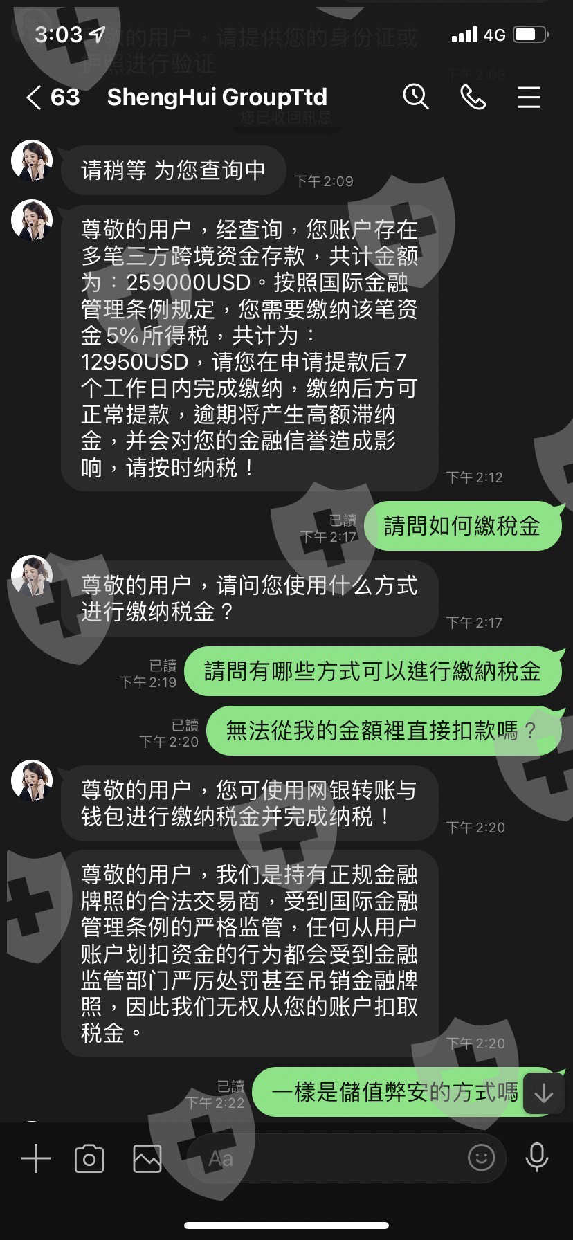 無奈之下我只能繳稅金,也詢問過客服是否只有這一筆繳款,客服也說是,繳完稅金後客服人員卻說總部覺得我有洗錢的嫌疑,但經過調查我沒有洗錢,卻損害他們的名譽,要罰款一萬美金,問題是一開始也沒有告知遊戲規則,然後又說我損害名譽,也拿不出損害名譽的證明,也不知道罰款金額是怎麼算的,我不知道如果繳完罰款後又會拿什麼理由一直要我繳款不給我提款,然後那位網友一直不斷要我投錢進去,還帶有一點威脅,但我真的沒錢也不願意再投錢時,他人也跟著消失了,希望大家不要再跟我一樣受騙