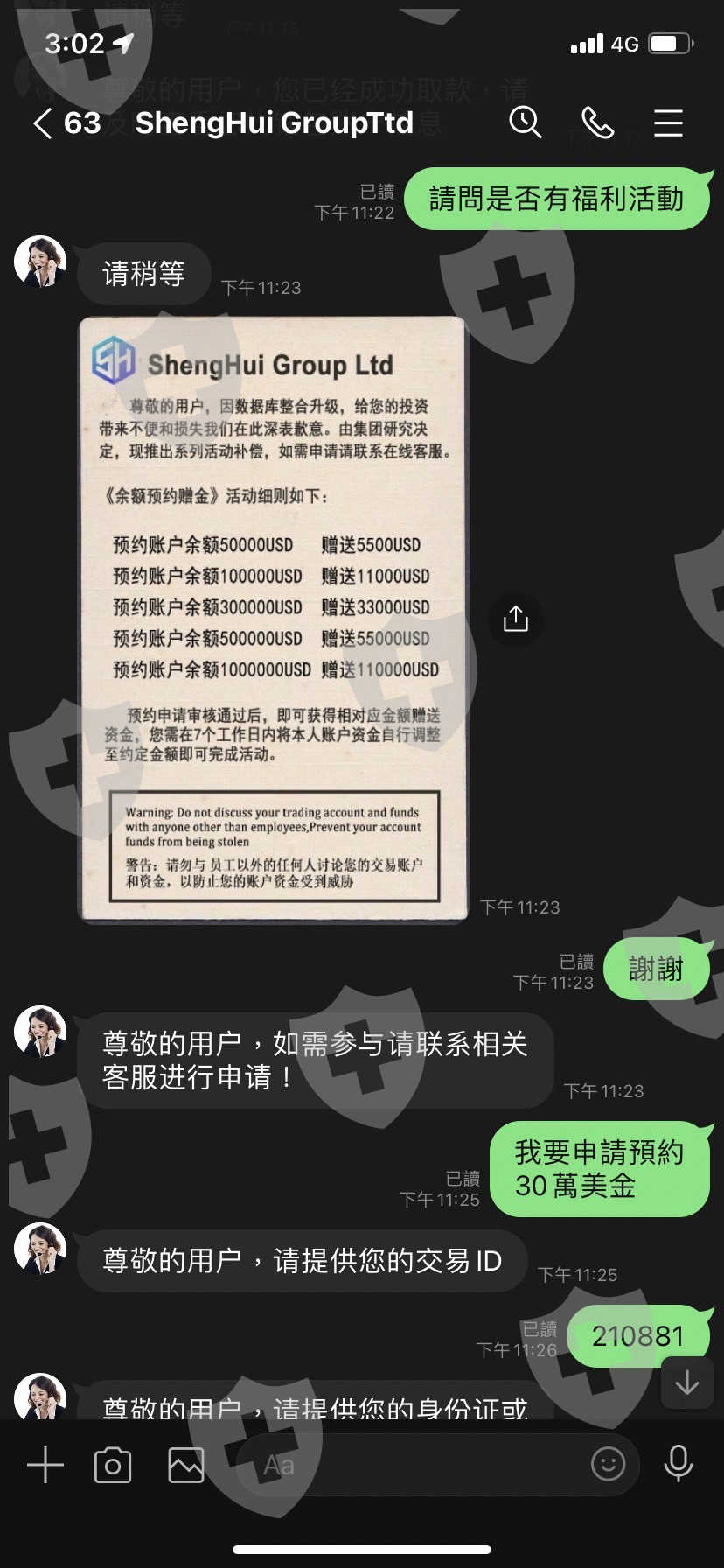 我近期投資一個平台,ID: 210881,在網路上認識的人,要我參加他們的活動,儲值30萬美金贈送3萬3美金,他說會一起幫我完成,當時活動內容也沒有說明活動規則,然後我就跟朋友一起完成儲值任務後,客服人員說:「您账户存在多笔三方跨境资金存款,共计金额为:259000USD。按照国际金融管理条例规定,需要缴纳该笔资金5%所得税,共计为:12950USD,请您在申请提款后7个工作日内完成缴纳,缴纳后方可正常提款,逾期将产生高额滞纳金,并会对您的金融信誉造成影响,请按时纳税!」