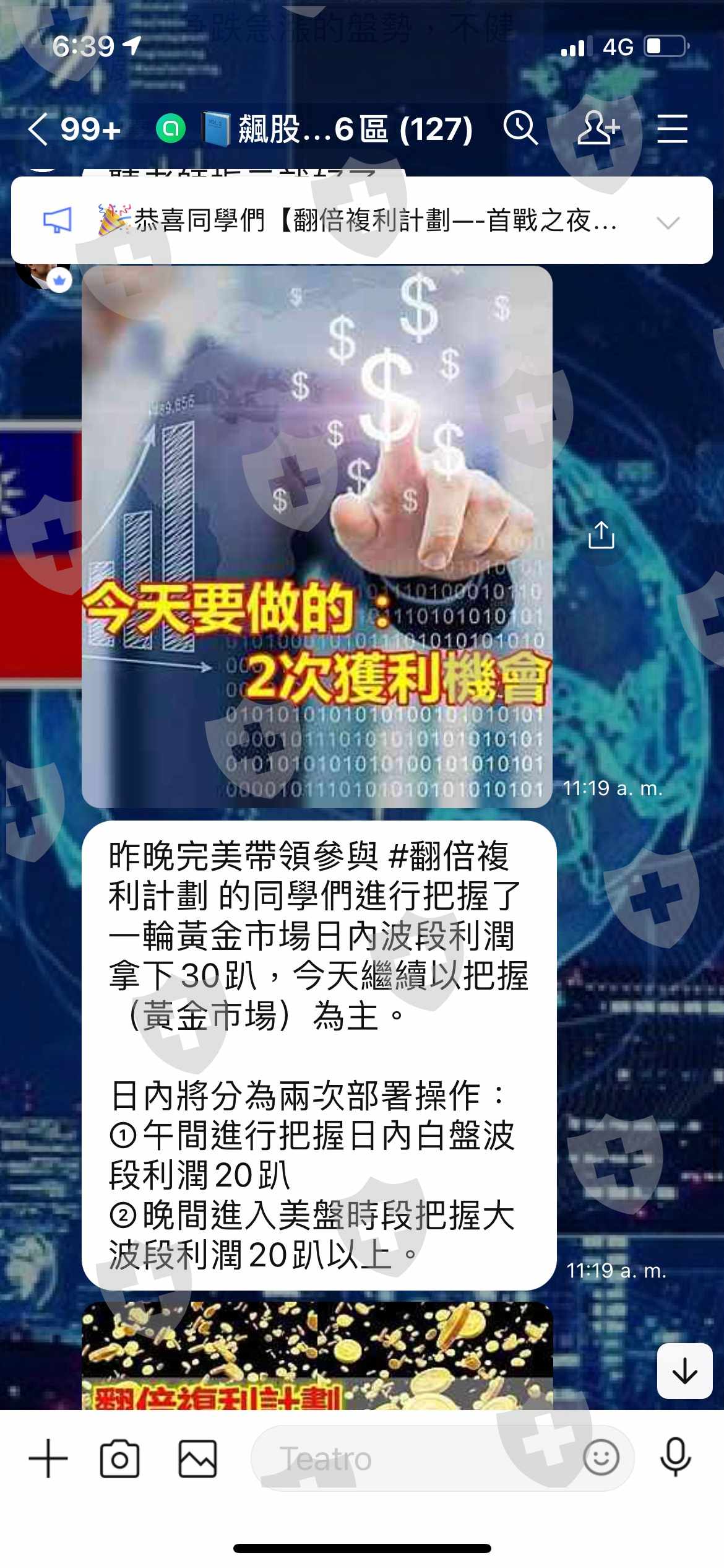透過line 群組每日發布投資訊息,讓人以為真的是投資資訊交流,接著行情不好的時候就說要投資黃金,騙取投入資金進入詐騙平台。