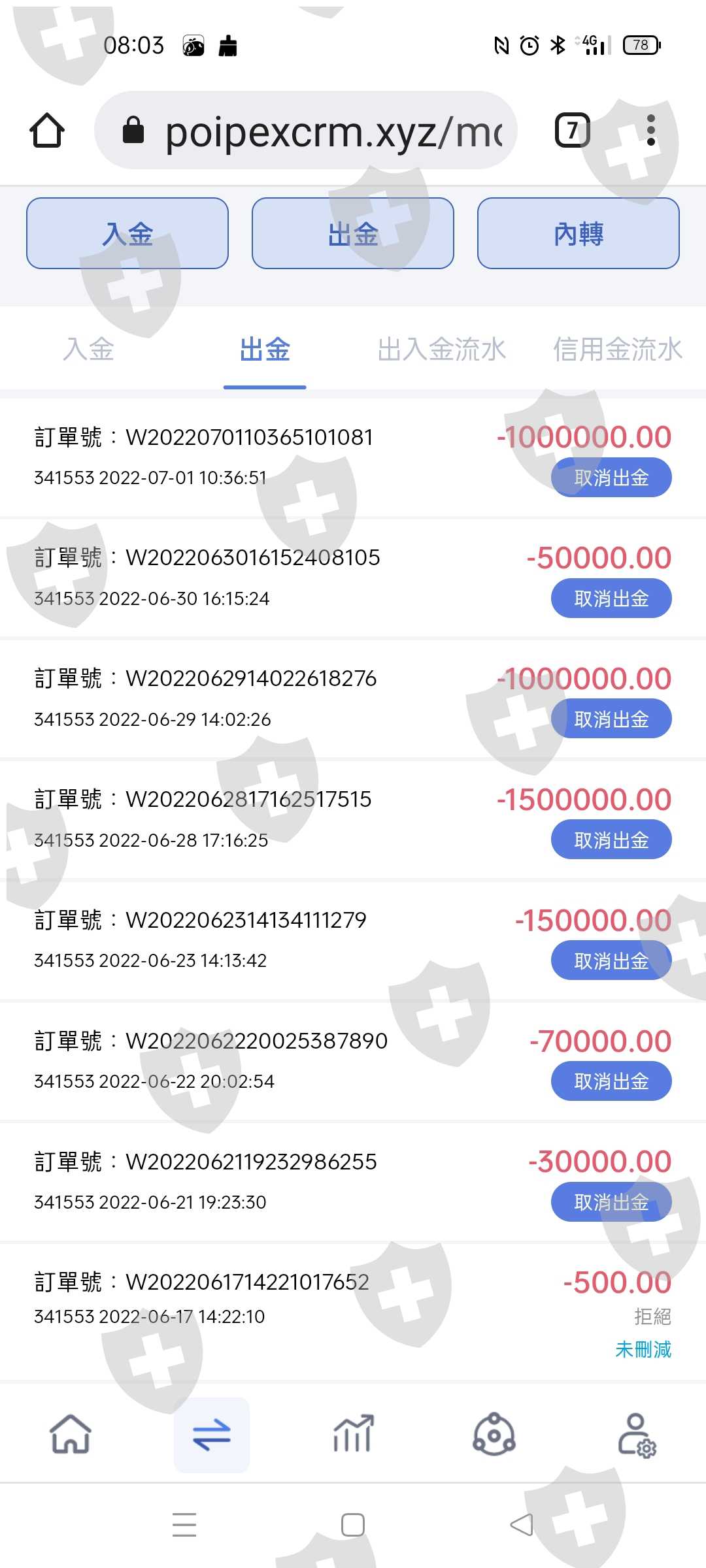 此公司和Line厚德載物自稱劉德勝老師的詐騙集團共同詐騙客戶,一個拿抽成,一個拿入金,之后雙方共同消失,出金也入不了帳, Poipex Market Limited 最後還夥同詐騙說繳交50萬,兩小時出金即可到帳,否則耐心等,這時間從6/20日至7/2日共騙了約250萬台幣,雙方人馬就聯絡不到人了,還有Poipex Market Limited 這公司的信也不回,更離普的是當你出金時,Poipex 資管帳戶已在出金處顯示(取消出金),但出金流水帳,是正常出金,入不了帳,還有出金時餘額已被扣除,這中間共出金380萬美金,不知去向,也沒人處理,這公司沒被金融管理委員會立即抓人判重刑,還要害死多少人呢?