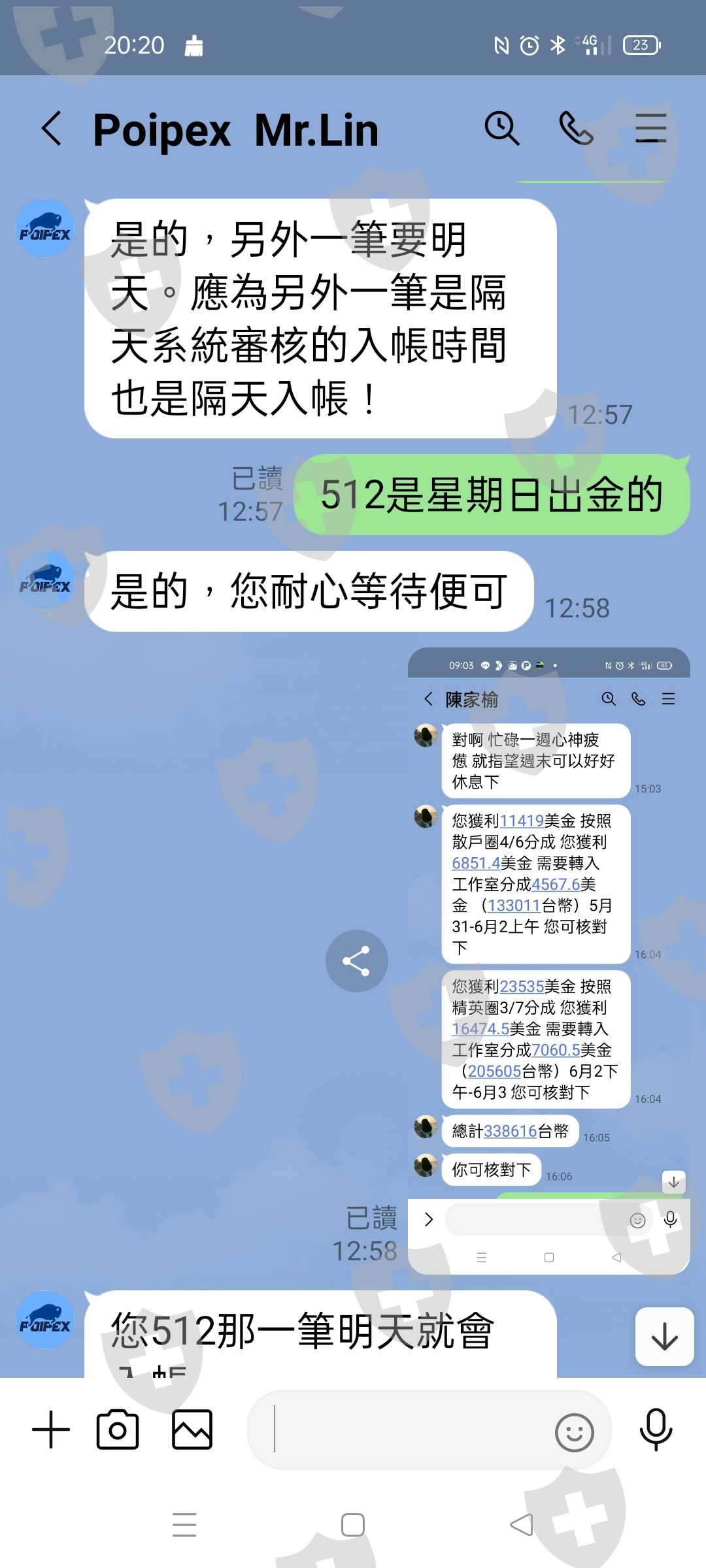 6/7日晚上約10點前,也就是網站交易時間13點59分49秒時,爆倉自動交易,當天已準備睡覺,突然群組陳華榮,Line給我,叫我下單,而且還賺出他已下單buy550口,價位當時高點,我本金7萬多buy35口,沒想到我拍照給她後,一分鍾左右馬上爆倉,虧損將近14萬,之後就是資管帳戶通知補虧損,否責國際信用破産等等,為了這事跟地下錢莊借款,朋友籌錢,補虧損,和抽成費用,之後日開始操作賺的錢,6/21日出金入就不了帳,Poipex資管帳戶平台Lin經理說因為出金人多,系統排隊中,到今天7/14日,也沒入帳,最可惡的是Poipex資管帳戶平台Lin經理,一直要我繳50萬辦理快速通道,但因我籌不出錢,出金又入不了帳,沒交成,後來查Poipex Market Limited 資管帳戶才發現,出金時立即顯示“取消資金”,但出入流水單,是正常出金,還有資管帳戶的總額跟著出入流水單扣除,這過程中總共出金380萬美金,被Poipex 資管帳戶直接消失了,