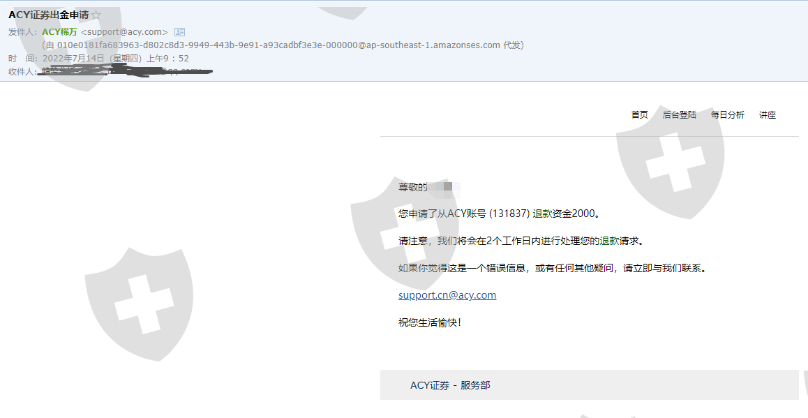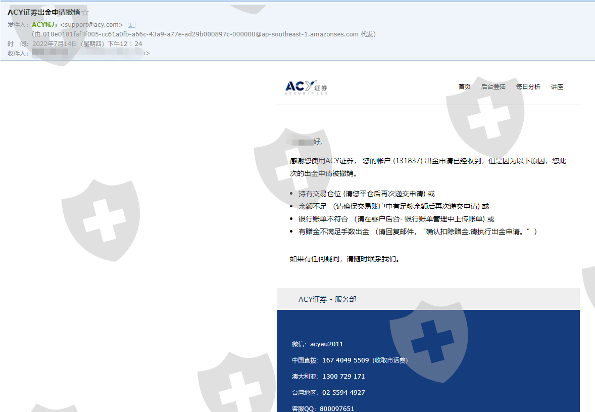 于7月14日早晨从IB账户2084美金转入个人交易账户,期间账户仍可正常交易,之后递交申请出金2000美金,平仓交易账户,以免影响出金,之后邮箱收到三封邮件。第一封出金申请邮件第二封出金撤销邮件第三封交易审核通知之后联系该官方工作人员,均无回复。