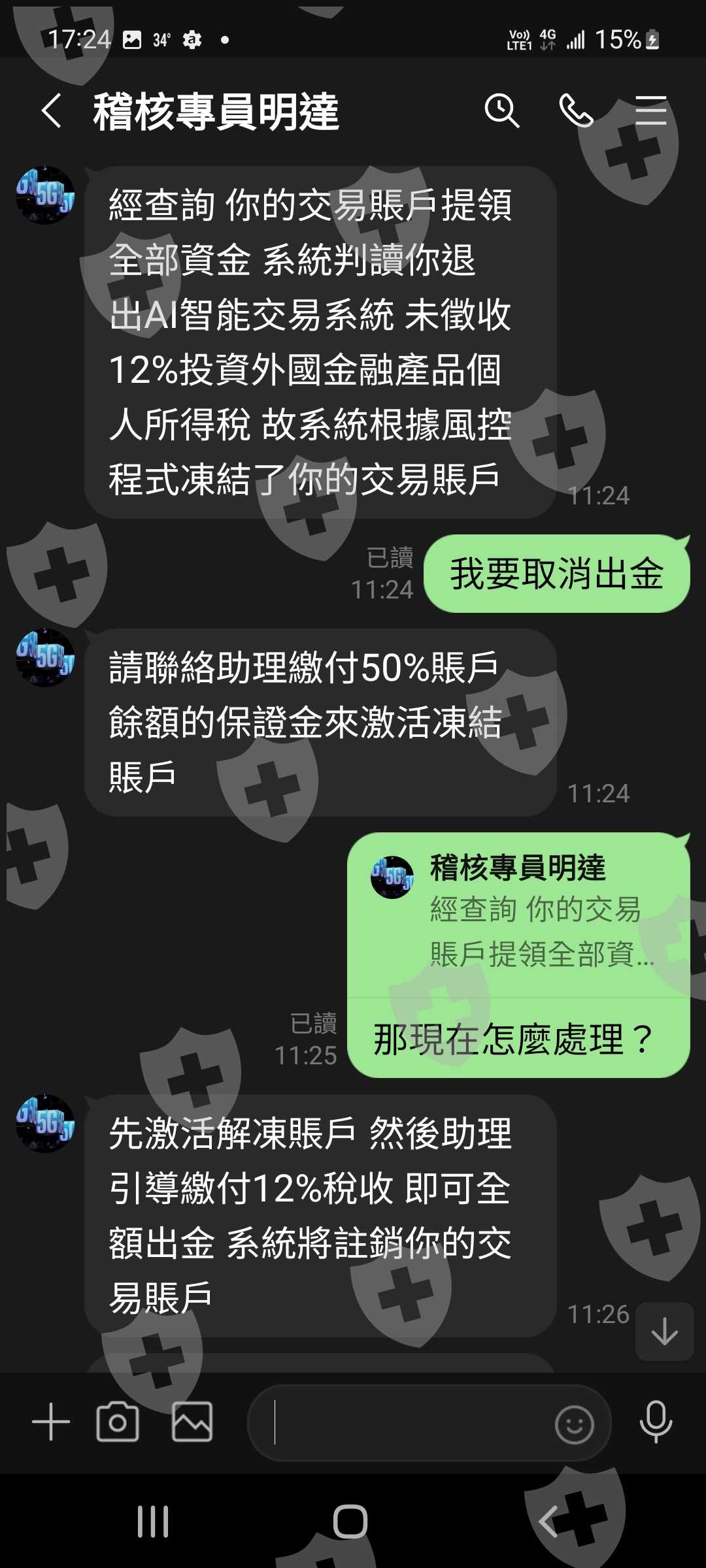 要出金就被鎖帳號,還另外請他們的專員跟我說要繳資金的50%才能解鎖,匯款解鎖後沒幾天,就把帳號裡的錢用"投資失敗"的方式把錢全扣光了