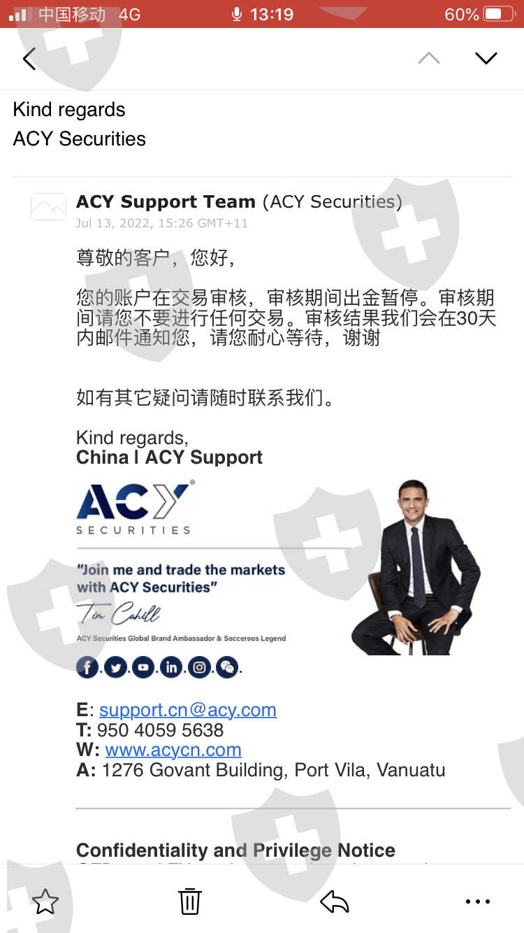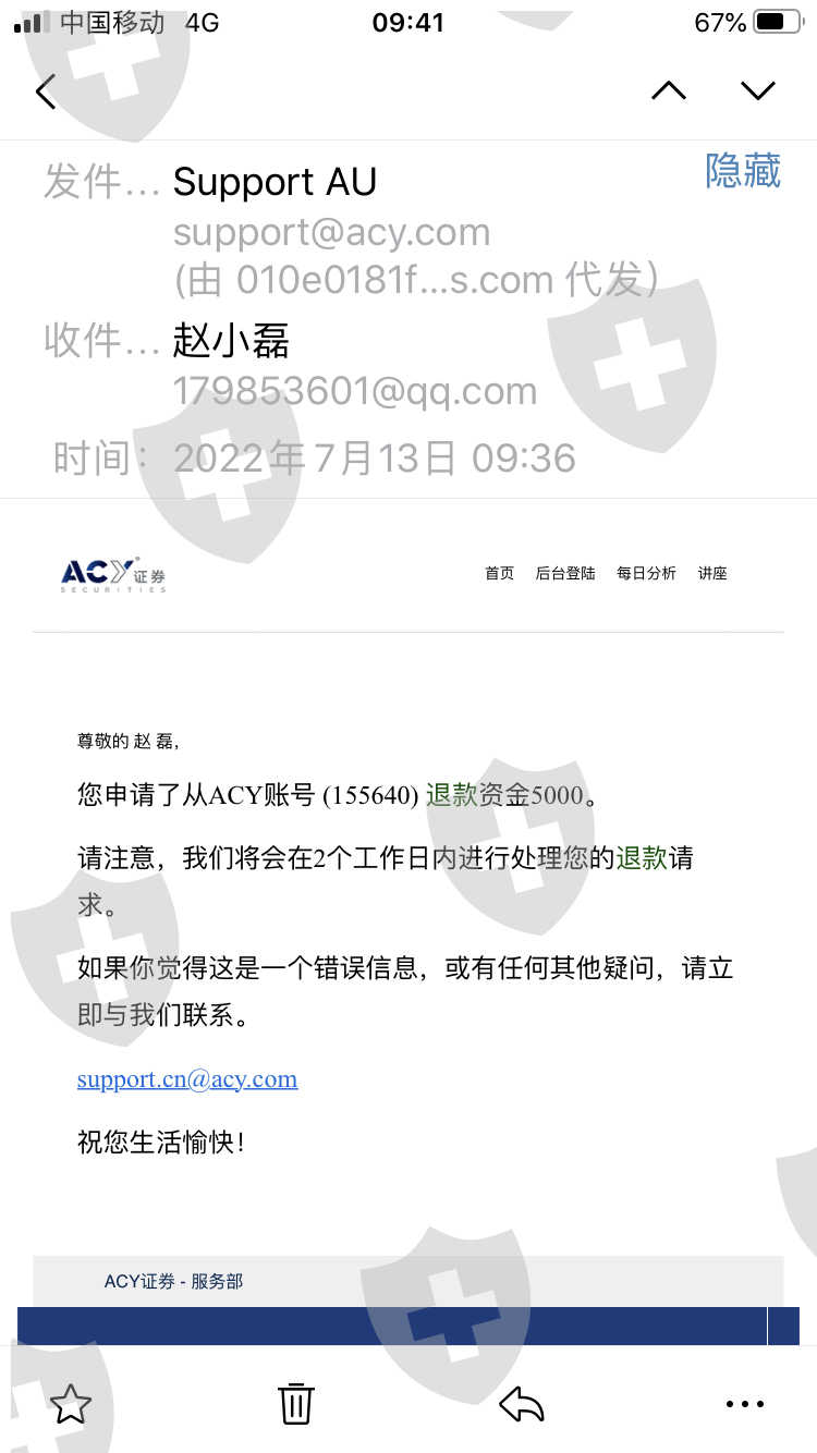 ACY无法出金,不给理由。撤销了提款5000的要求,并且擅自划走了账上15000美金。