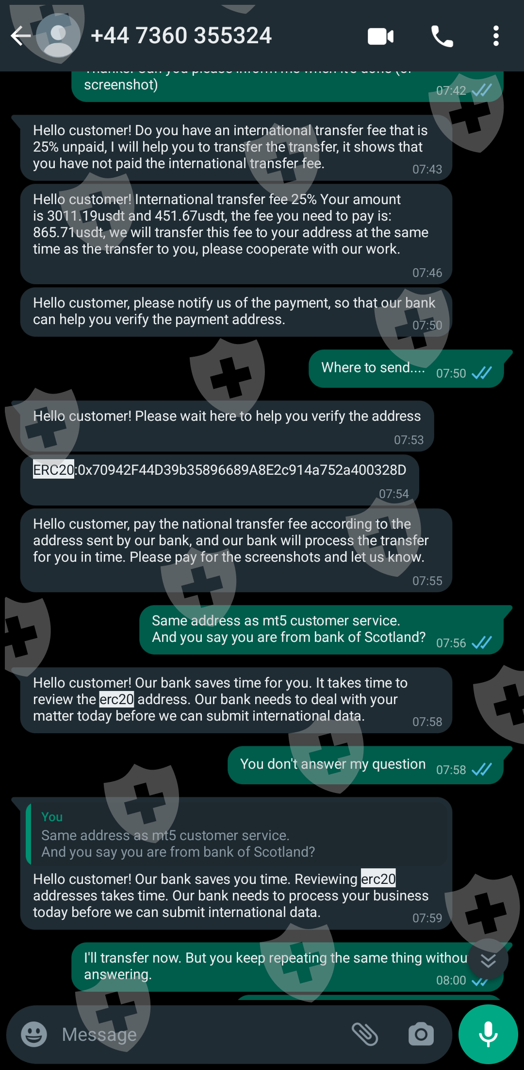 当我们要取款时,他们要了几千美元(账户费用+税金+国际转账费+国际税金)然后他们说他们需要向“国际金融中心”查询。几个小时后他们说“他们检测到”我的地址涉嫌洗钱,所以我需要支付释放金才能帮助我处理。 (1000 美元)