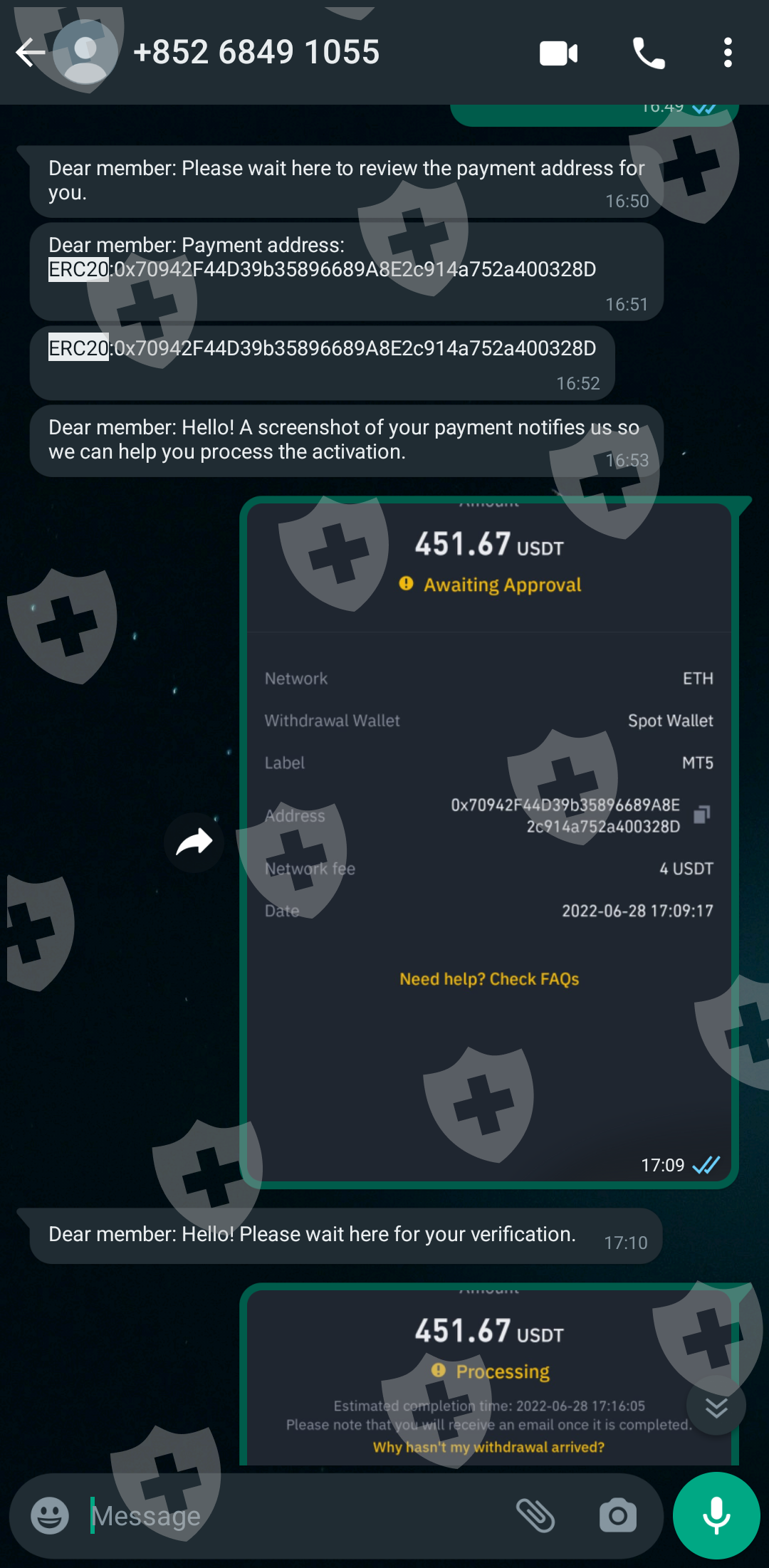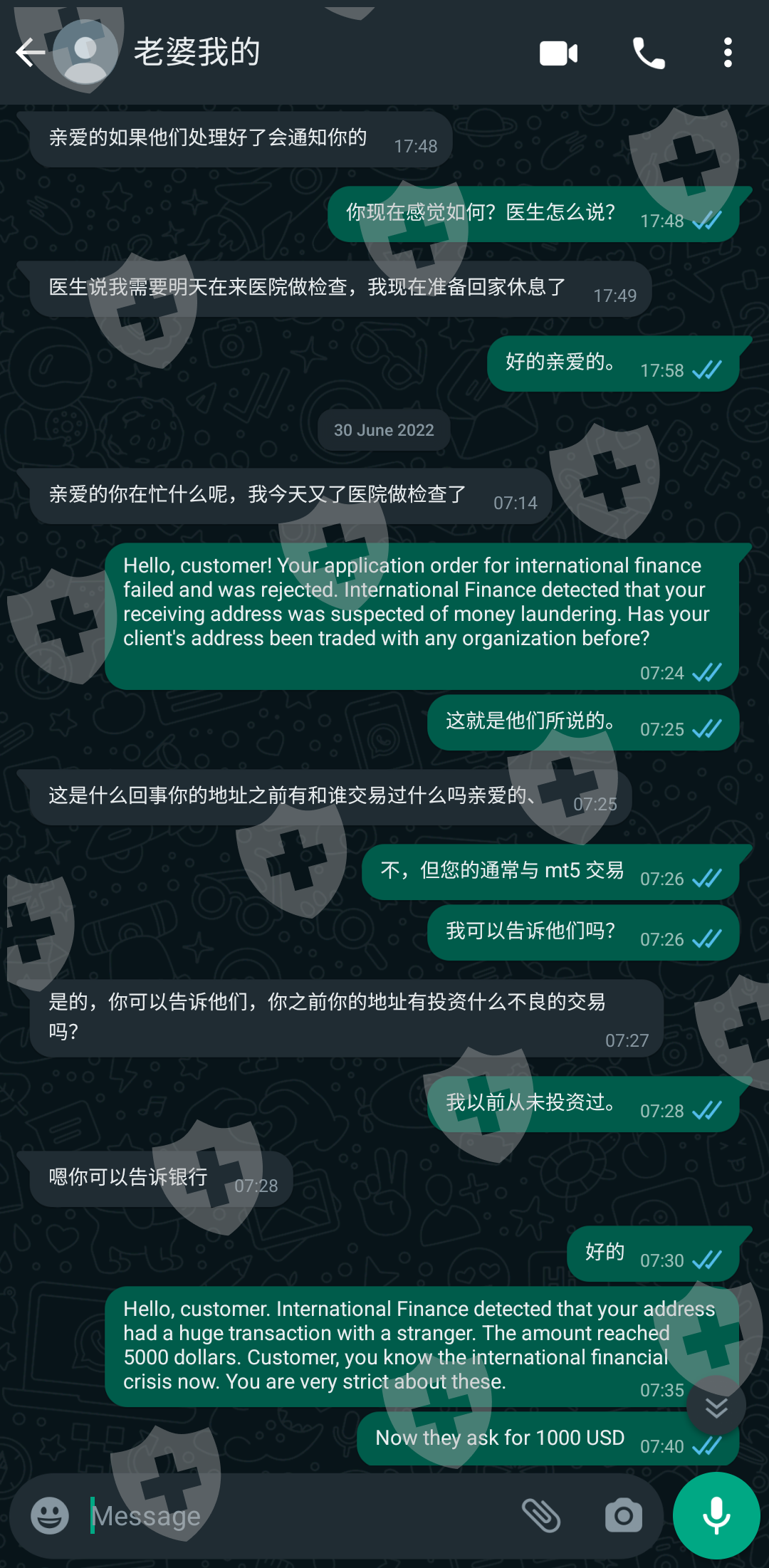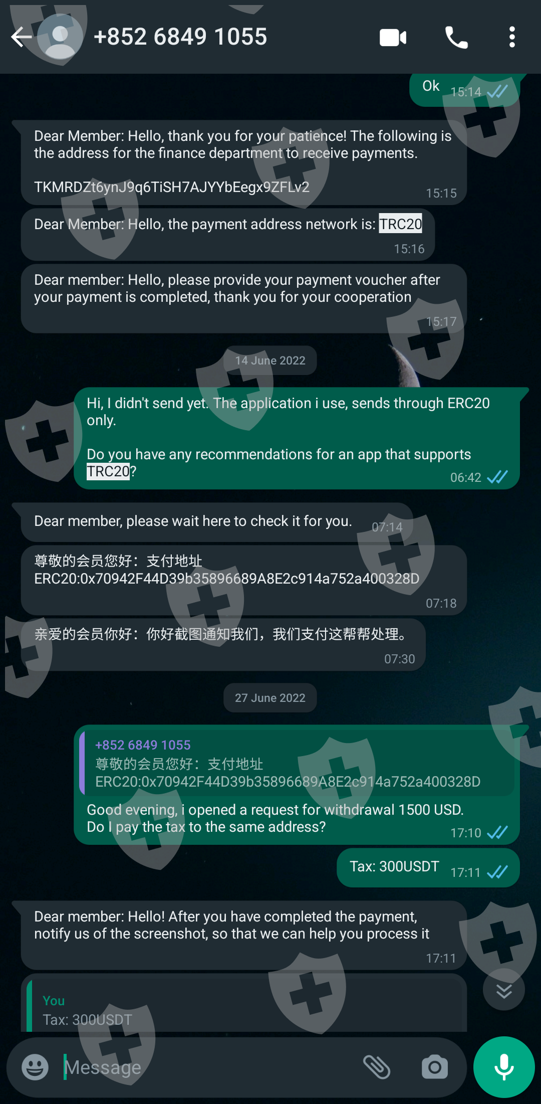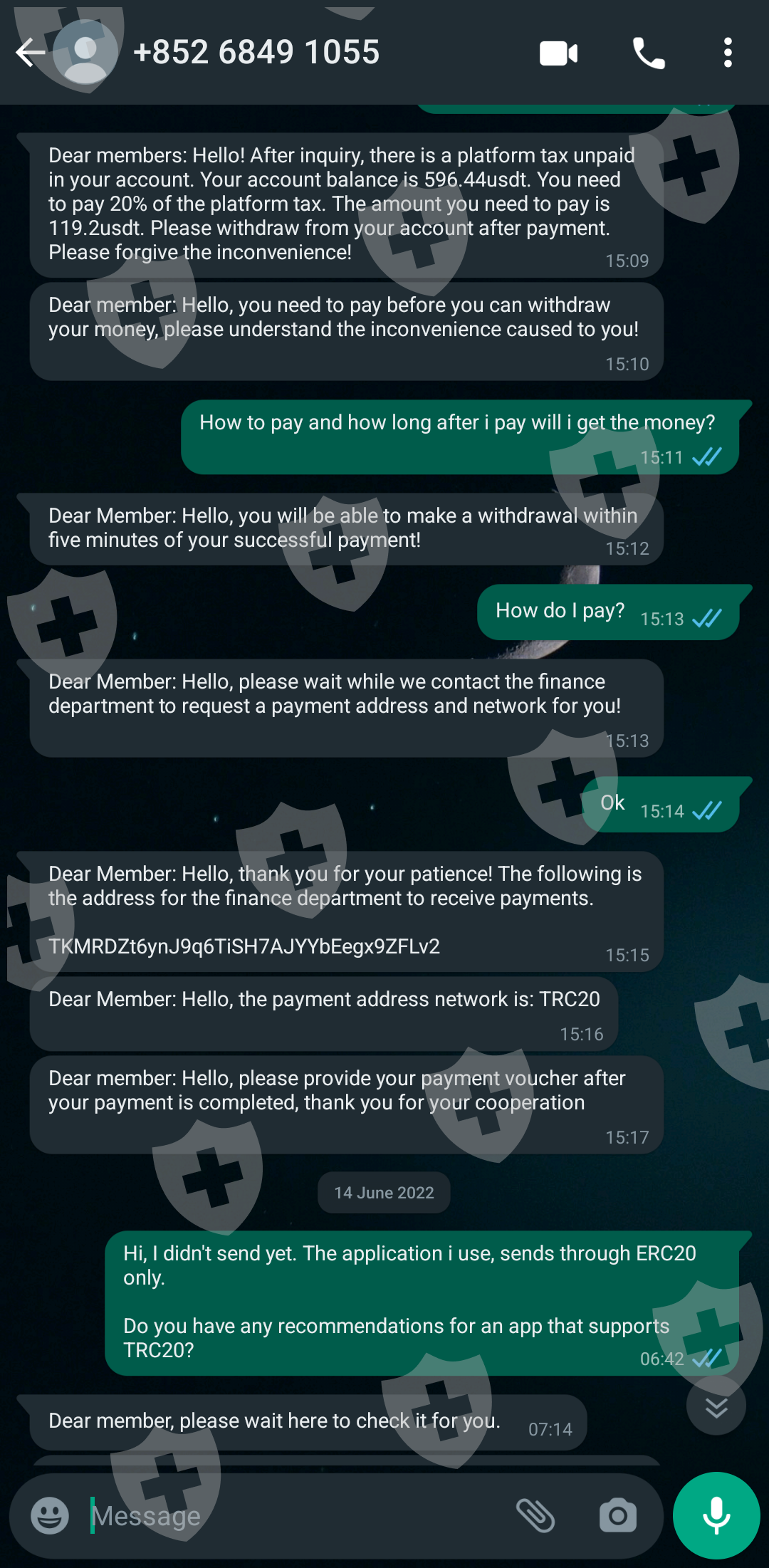 Then they say they need to check with "international financial center". After a few hours they say "they detected" that my address is suspected of money laundering, so I need to pay the release money before they can help me deal with it. ($1000)