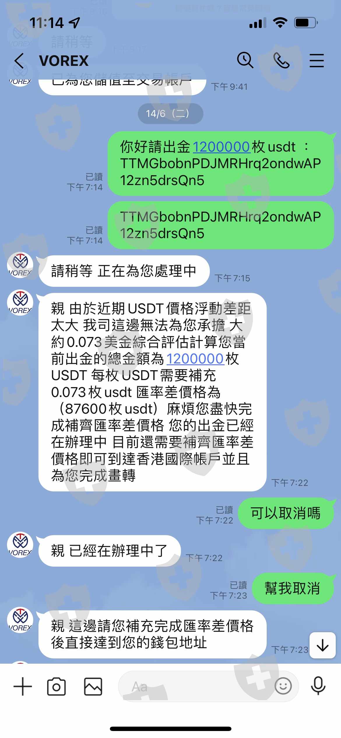 第一次出金$500usd,就好快到帳,第二次出金1200000usd,說要交匯率差,然後又說防止洗黑錢,然後又話要交稅,總之很多借口。因我上次申請幫手,他公司現在又欺騙我話全公司停業正在接受調查中,當時欺騙我說要我取消投訴,否則不出金,增加他們解決問題的時間,我當時相信他的說話,然後取消切幫忙,現在他公司一直都不覆我訊息,我用另外一部手機同客戶服務聯繫,他說營業正常。還說我令他公司一切損失要我承擔。