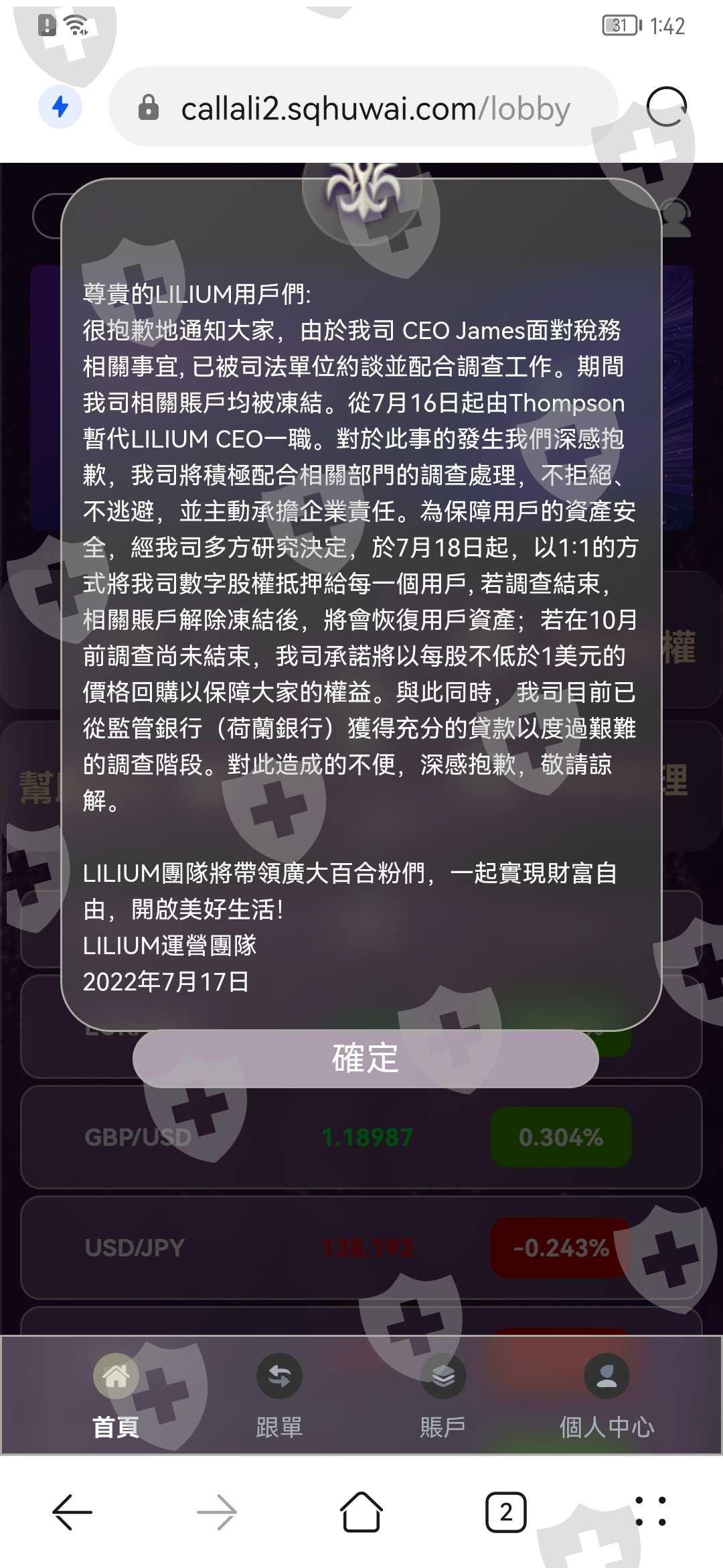 很抱歉地通知大家,由於我司 CEO James 面對稅務相關事宜,已被司法單位約談並配合調查工作。期間我司相關賬戶均被凍結。從7月16日起由 Thompson 暫代 LILIUM CEO 一職。對於此事的發生我們深感抱歉,我司將積極配合相關部門的調查處理,不拒絕、不逃避,並主動承擔企業責任。為保障用戶的資產安全,經我司多方研究決定,於7月18日起,以1:1的方式將我司數字股權抵押給每一個用戶,若調查結束,相關賬戶解除凍結後,將會恢復用戶資產;若在10月前調查尚未結束,我司承諾將以每股不低於1美元的價格回購以保障大家的權益。與此同時,我司目前已從監管銀行(荷蘭銀行)獲得充分的貸款以度過艱難的調查階段。對此造成的不便,深感抱歉,敬請諒