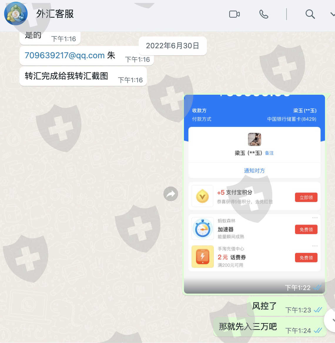 几次均成功,每次获利20%。于是受骗人继续疯狂入金充值。然后在第四次的时候,该骗子故意选中波动大的外汇交易,最终造成市场波动大从而导致爆仓的假象。其实钱已经早在受骗人打钱的时候进入各个所谓的随机账号。事后,骗子声称是受骗人资金不够导致爆仓,甚至进而要求受骗人继续贷款打钱(入金)。受骗人在损失10余万后幡然醒悟