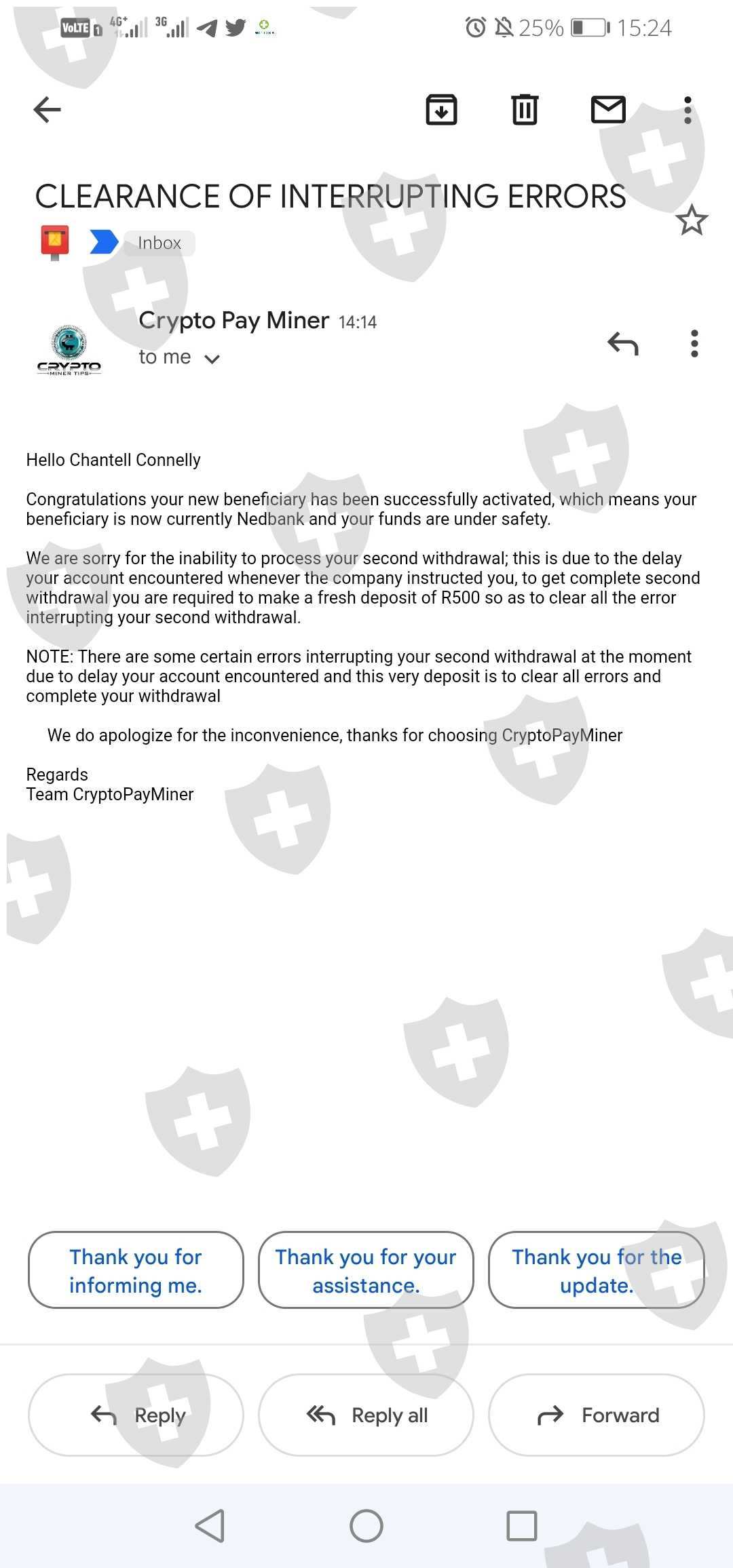 我一直在付款,我已经支付了R10,000的存款,但没有出金。他们一直说这是我的最后一笔付款然后他们一直给我发电子邮件说我必须存款才能获得利润