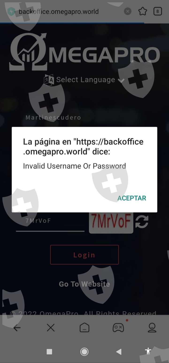 你好,很高兴,我来介绍我的情况,我在平台上注册了 OmegaPro好吧,我是通过广告找到他们的,所以我和罗莎谈了很多,她是所谓的经理,最后是个骗子,她向我解释了一切是如何运作的,我存了 321,200 比索,然后我试图用我一开始输入的数据再次进入平台,现在我收到一个警告,说用户名和密码无效,当我输入的那个是我输入的时候,我也再次写信给他要我的钱和到目前为止我还没有收到任何回复,请帮助我