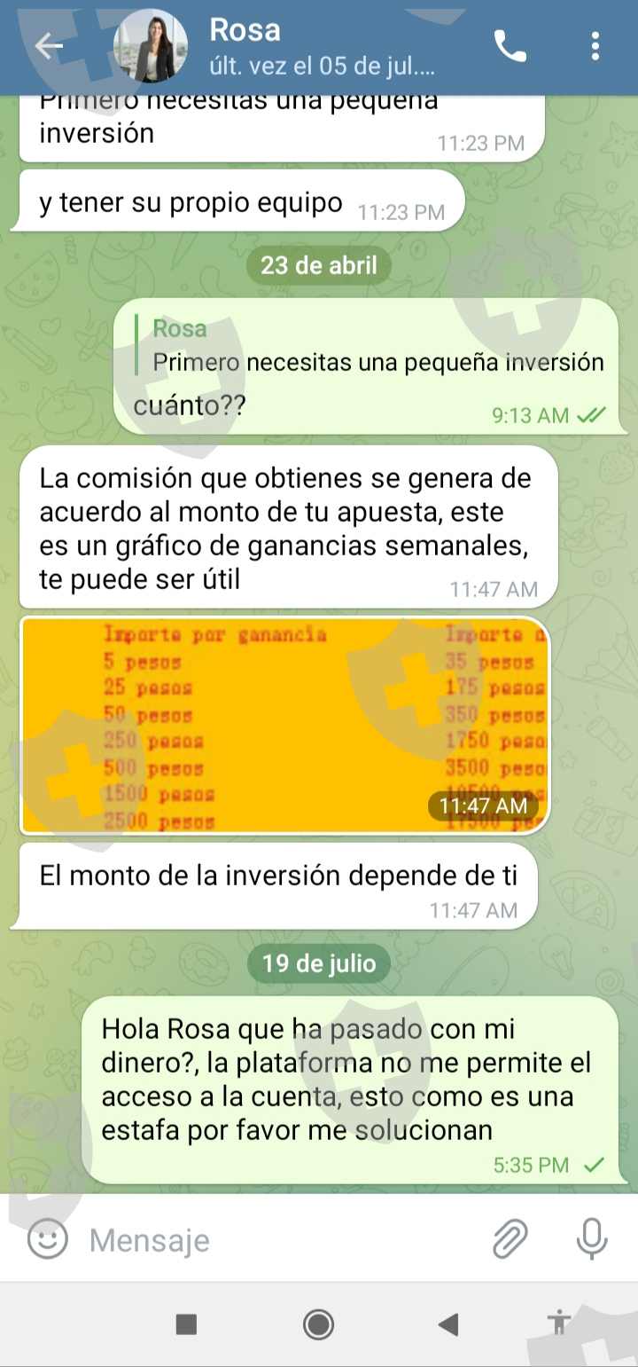 Hola un gusto, vengo a exponer mi situación, yo me registre en la plataforma de OmegaPro, pues llegué a ellos por medio de una publicidad, entonces hablé mucho con Rosa que es la supuesta Gerente que al final es una estafadora,y ella me explicó cómo funcionaba todo, deposité 321.200 pesos, y luego intenté ingresar de nuevo a la plataforma con los datos que en un inicio había entrado y ahora me sale un aviso que dice que es inválido el usuario y la contraseña, cuando es ese el que puse, además le escribí de nuevo preguntándole por mi dinero y hasta ahora no he recibido ningúna respuesta, por favor me ayudan