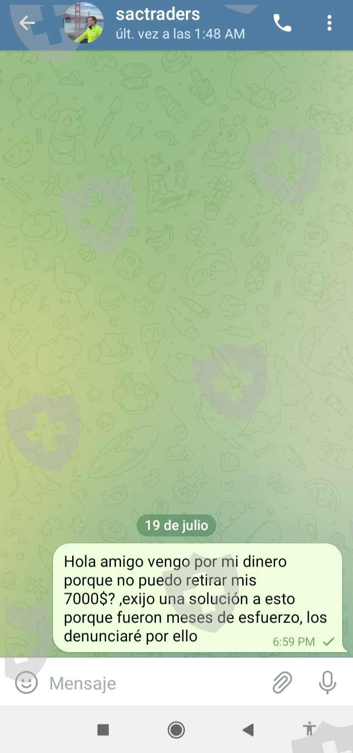 我想说这个平台骗走了我的钱,特别是 26,000 美元比索,并且由于我的知识,在几个月的市场运营中获得了超过 7,000 美元的利润后,他们提出了一个事实,即进入数据不正确,在那里你可以看到他们发送的一些指标,而客服人员没有回答我