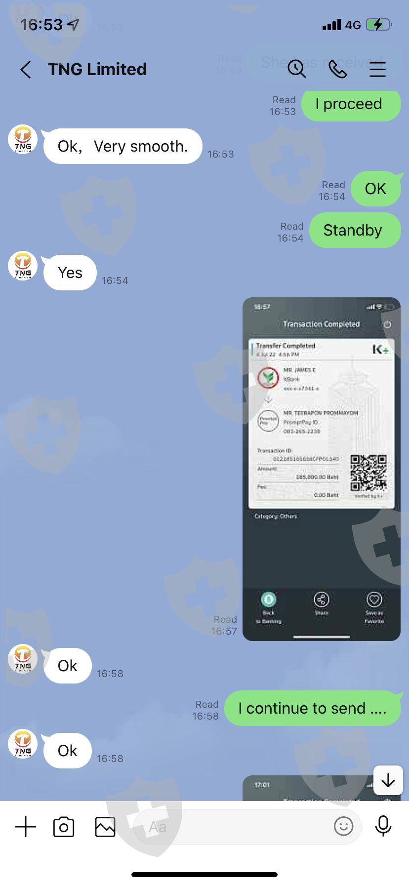 I sent 12 x separate payments to the the trader account from my Thai bank, all witnessed by TNG on the day and as they requested (US$ 5,000 was the transfer limit)