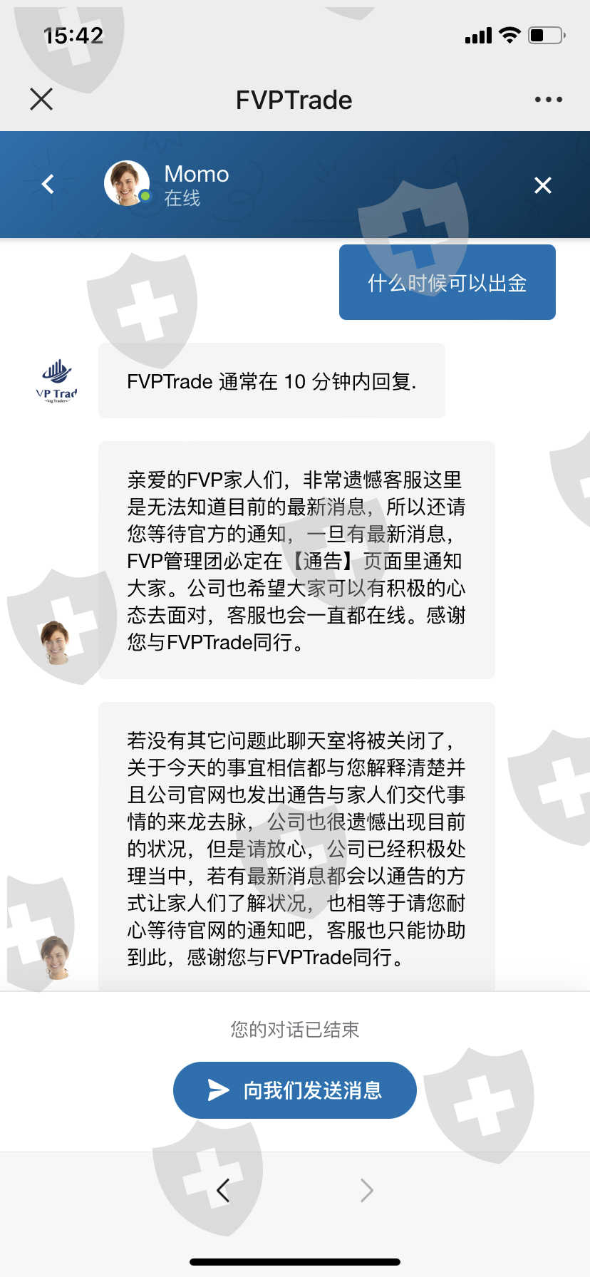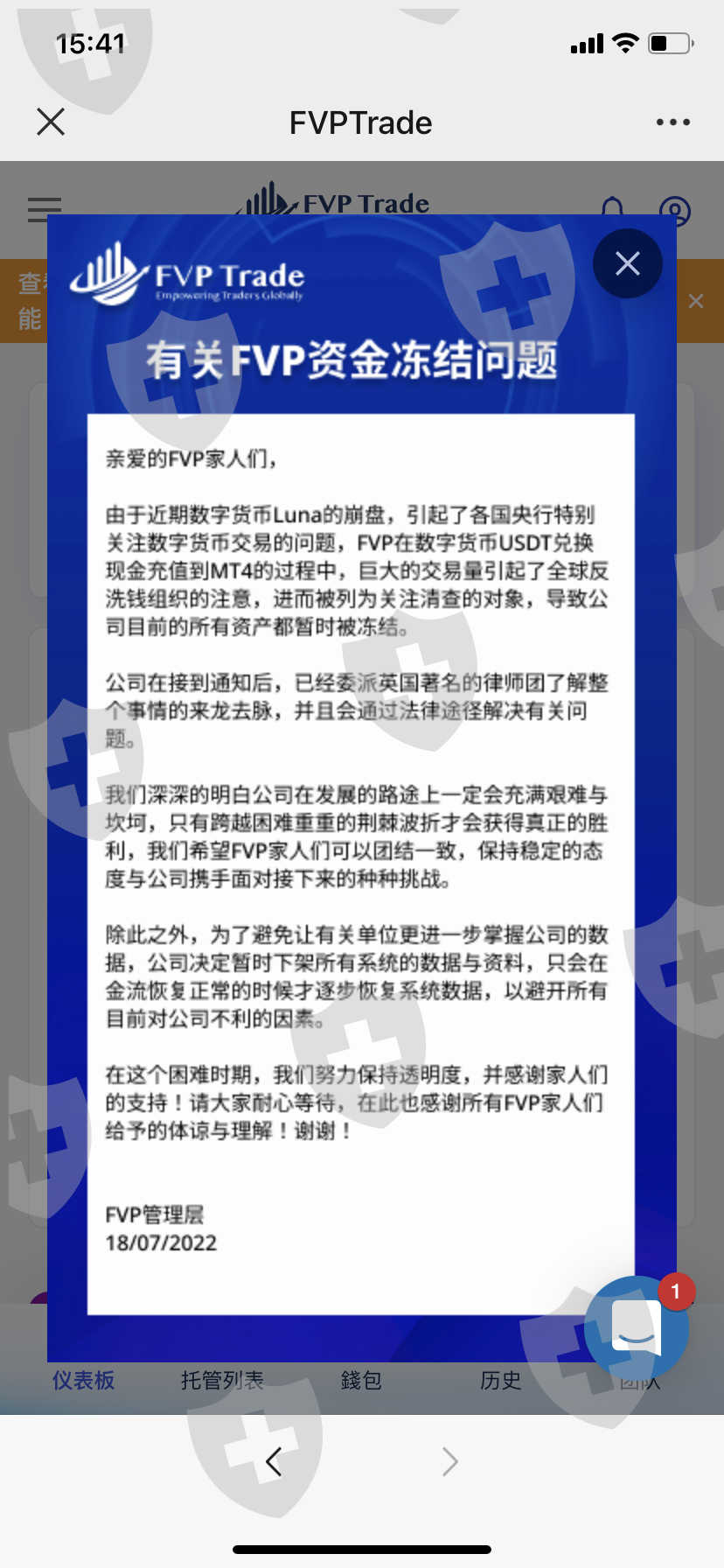 7月18号FVP出了个通告说资金冻结,到现在无法出金